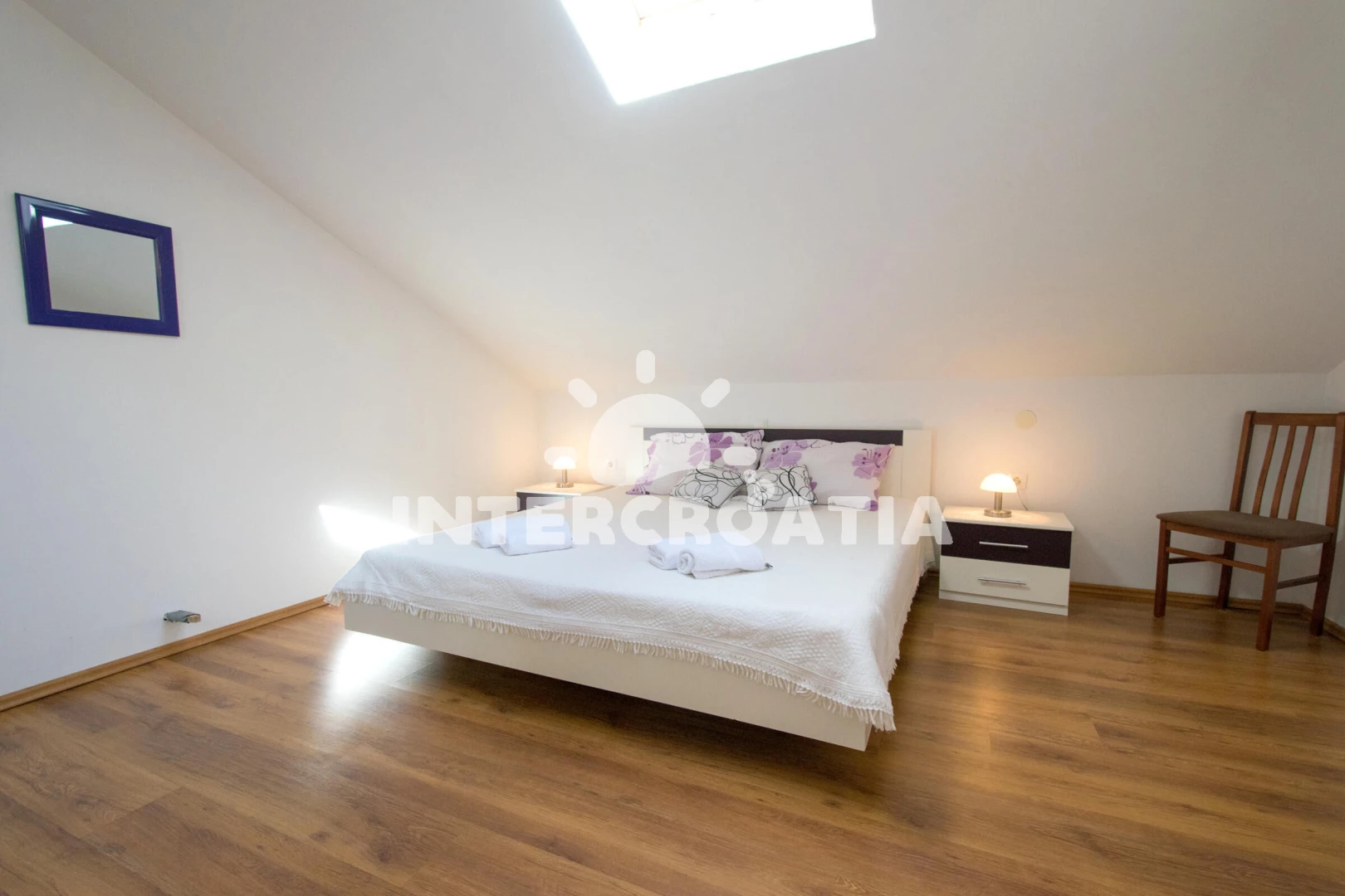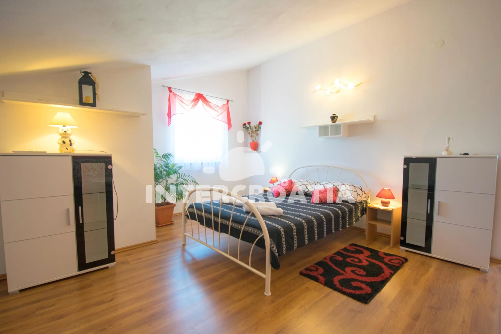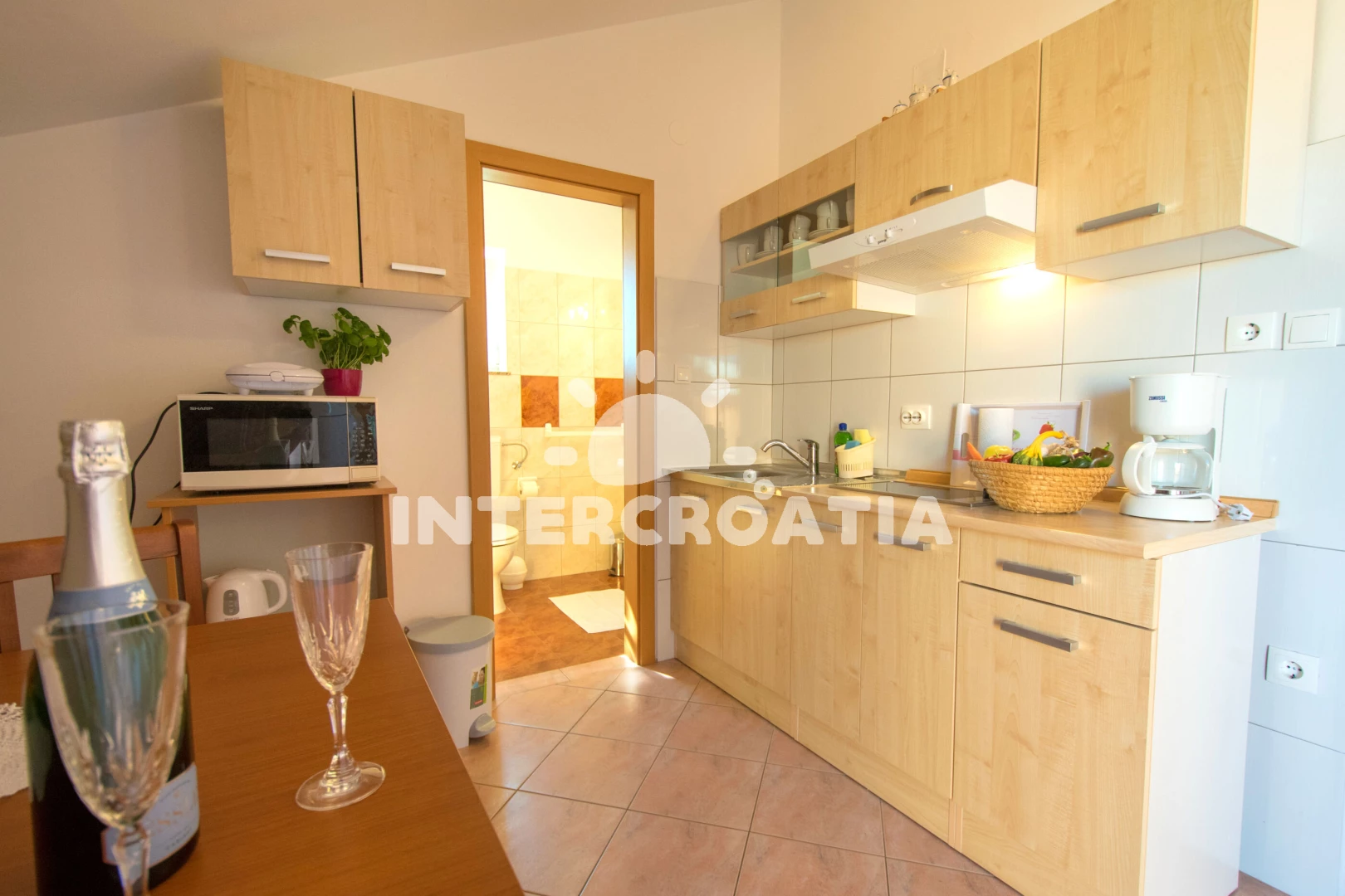 Apartmán se nachází 300 m od moře a pláže. Pláž je betonové desky, skalnatá a větší kamení. U objektu je k dispozici společná zahrada s posezením a grilem. Parkování je před domem.