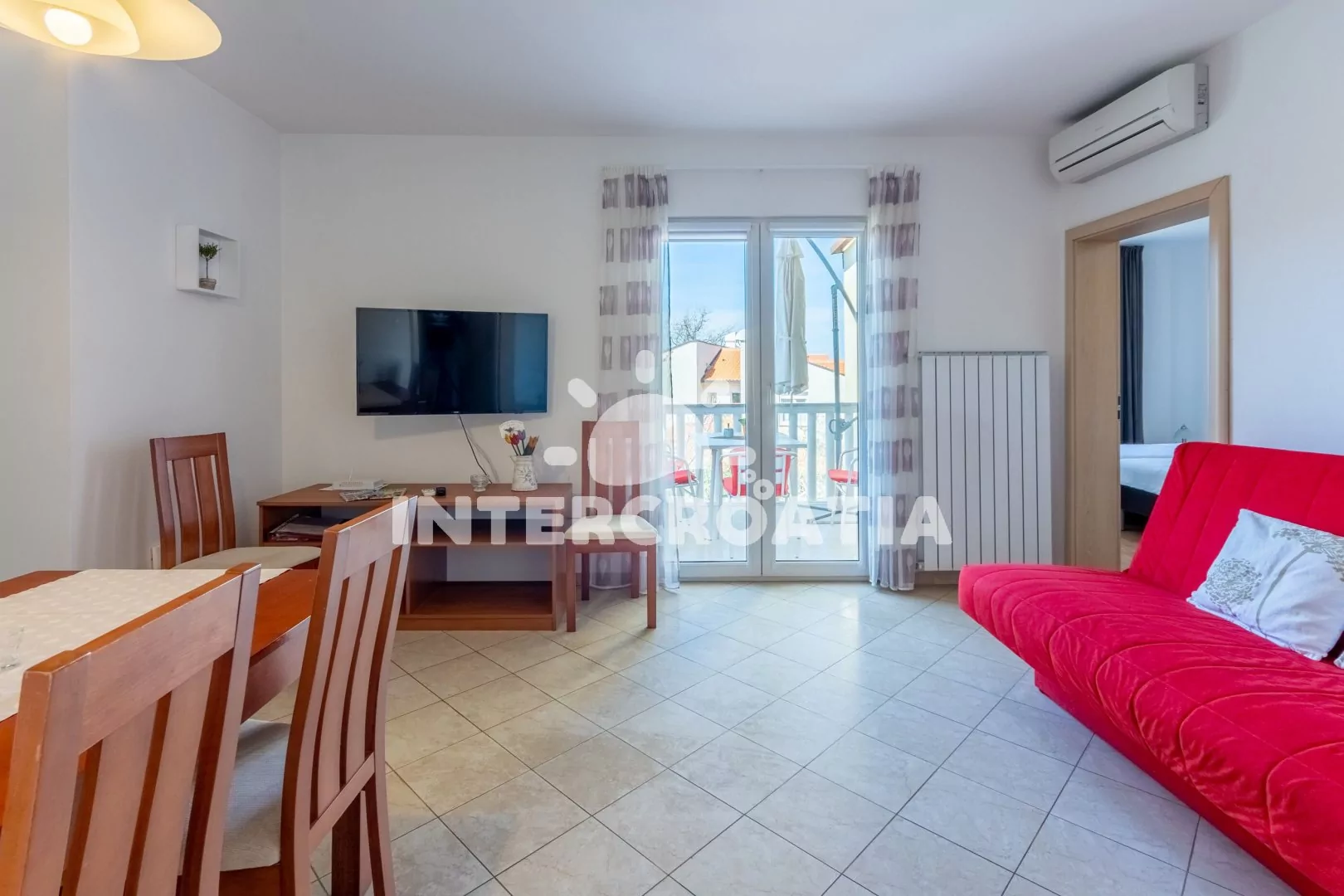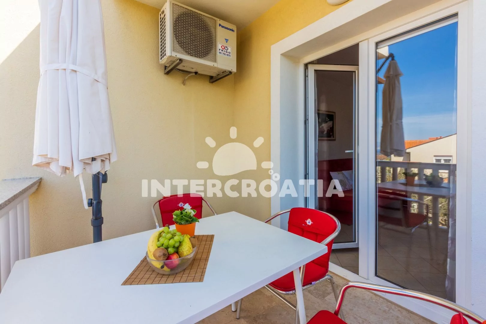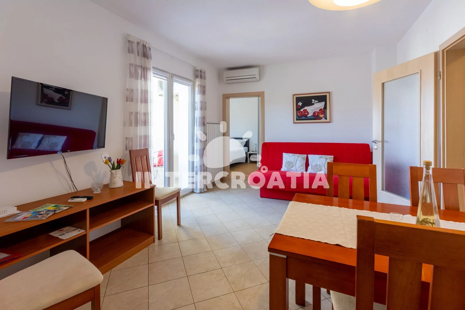 Světlý a útulný apartmán pro 4 až 5 osob se nachází v prvním patře s balkonem. Obývací pokoj je spojený s kuchyní. Kuchyňská linka se sporákem, digestoří, mikrovlnnou troubou, kávovarem a lednicí s mrazákem. Obývací pokoj s jídelním stolem pro 4 osoby, rozložitelnou pohovkou (extra lůžko pro 1 osobu), televizí se satelitním programem, klimatizací a vstupem na balkon. První i druhá ložnice je vybavena vždy s jedním dvoulůžkem. Koupelna se sprchovým koutem, umyvadlem a wc. Hostům je k dispozici sejf, stolní tenis a parkování u objektu zdarma.