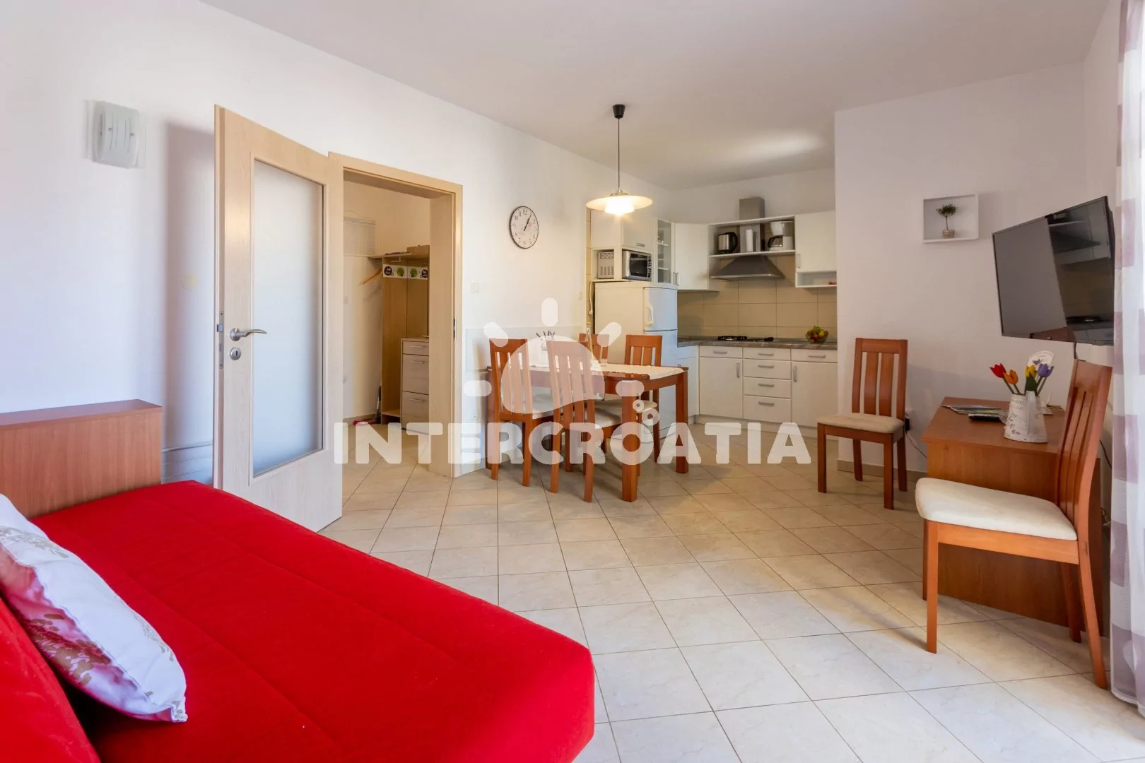 Světlý a útulný apartmán pro 4 až 5 osob se nachází v prvním patře s balkonem. Obývací pokoj je spojený s kuchyní. Kuchyňská linka se sporákem, digestoří, mikrovlnnou troubou, kávovarem a lednicí s…