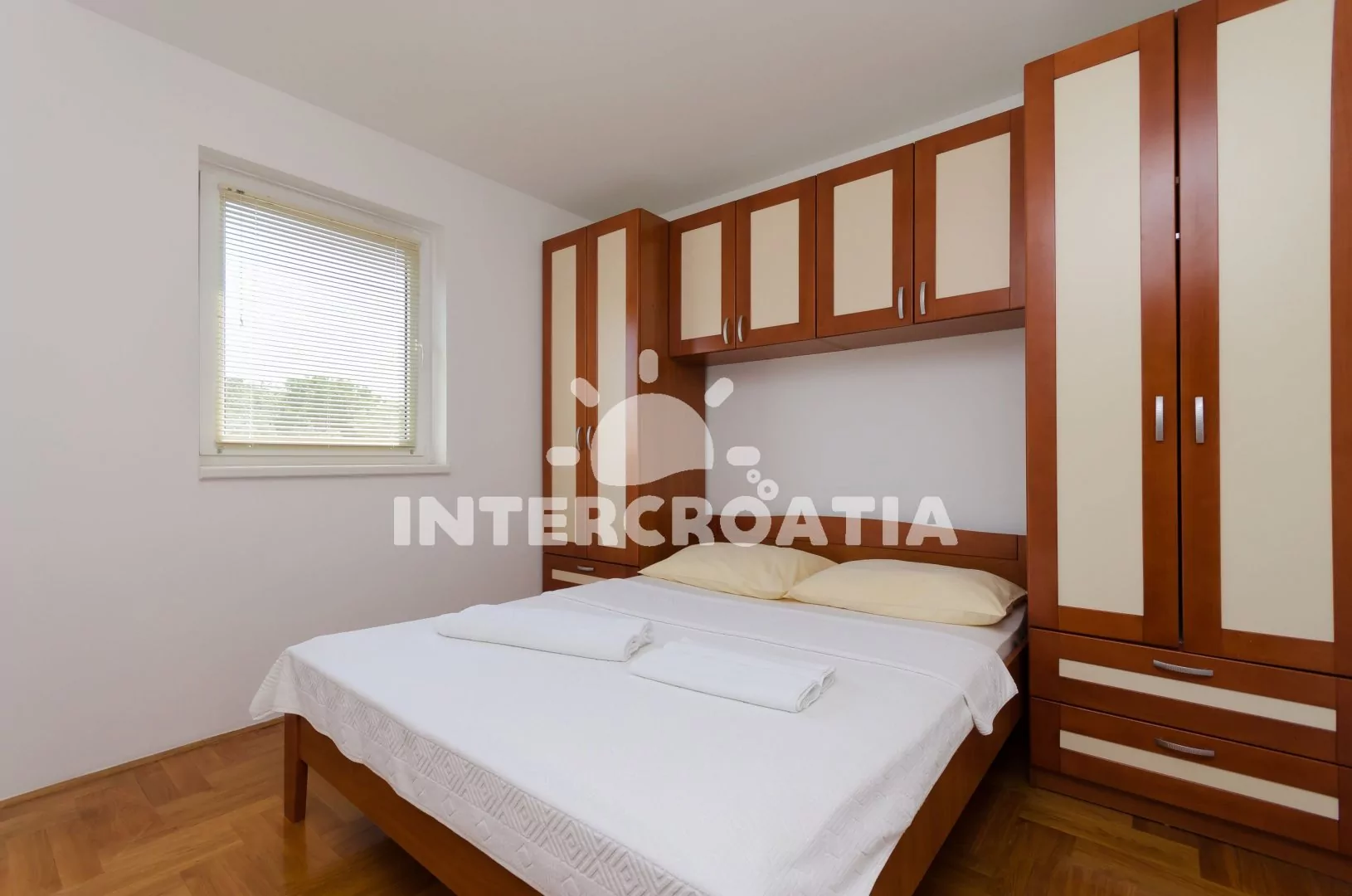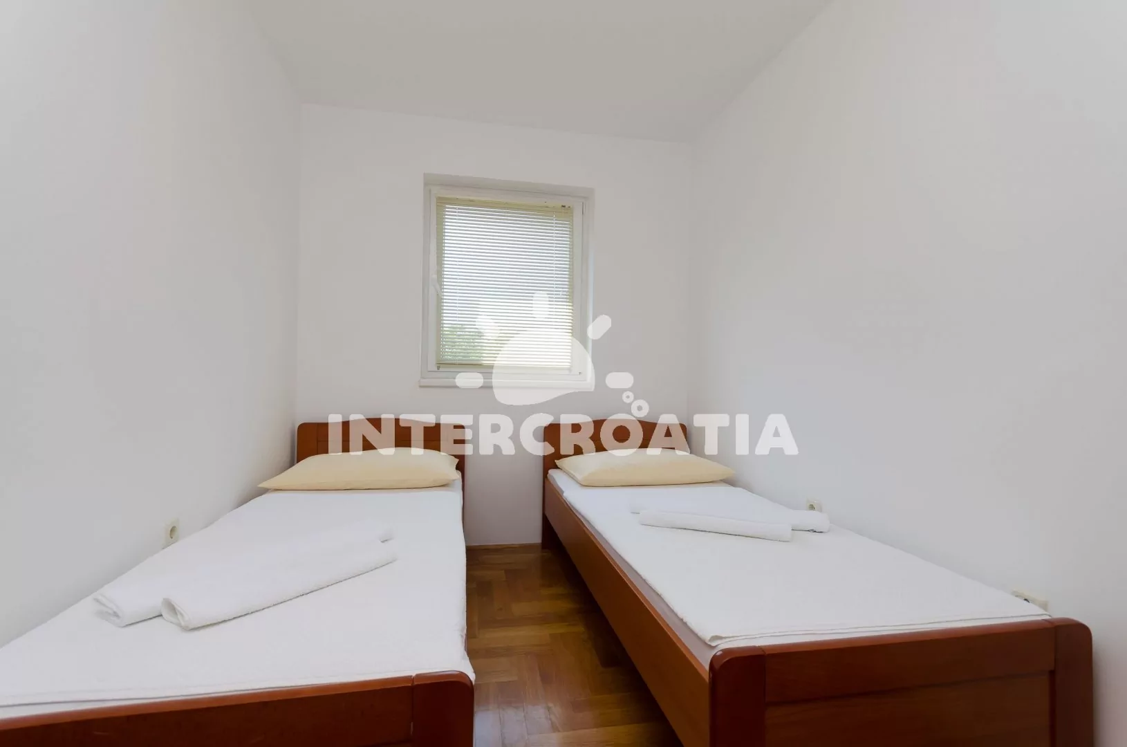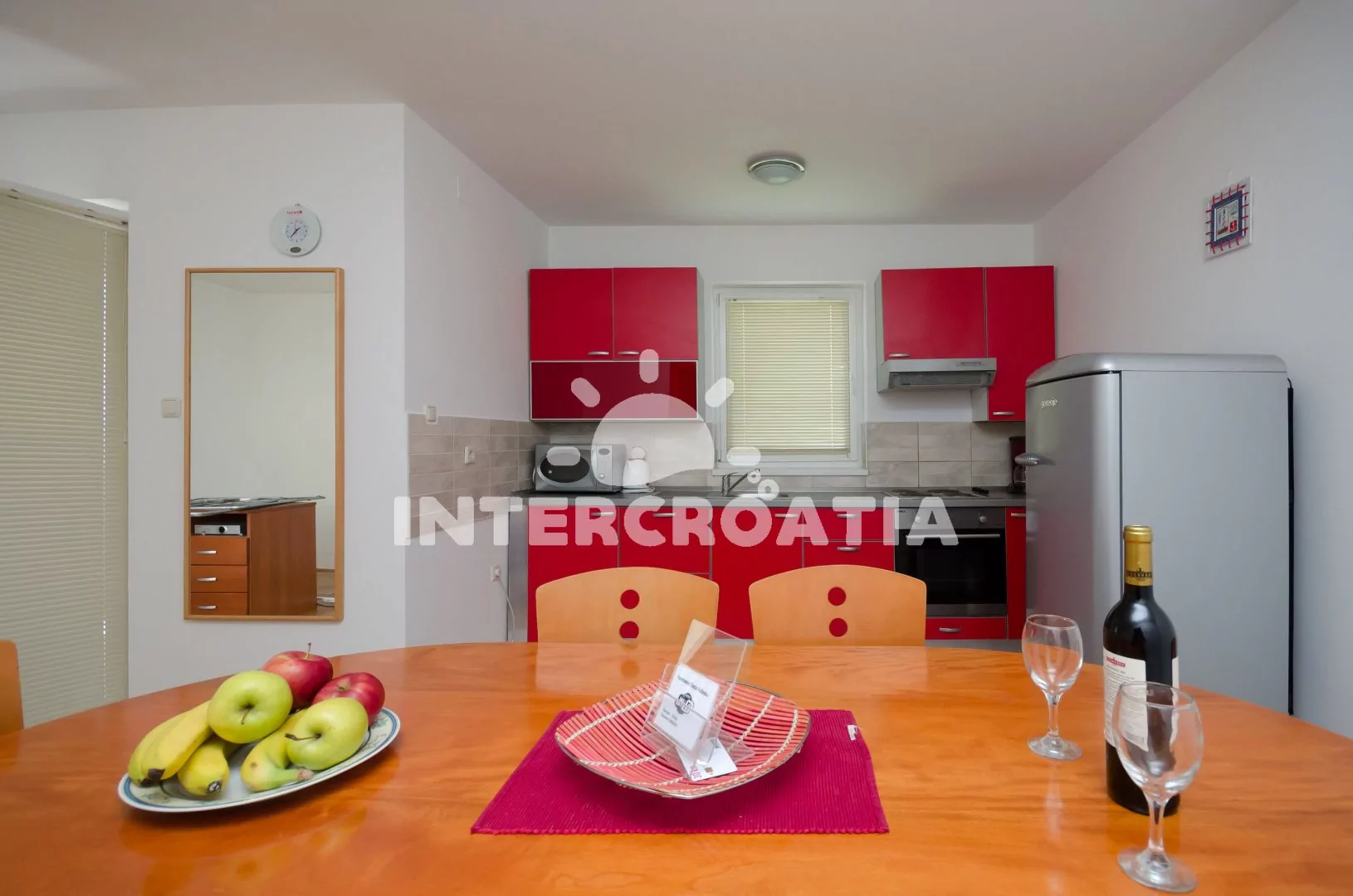 Apartmán v prvním patře domu s výhledem do zahrady, balkonem a venkovním posezením je vhodný pro 4 osoby. Obývací pokoj je spojený s kuchyní. Kuchyňská linka je vybavena sporákem, digestoří, vestavěnou troubou, mikrovlnnou troubou, rychlovarnou konvicí, kávovarem, nádobím a lednicí s mrazákem. Obývací pokoj s jídelním stolem pro 6 osob, rohovou pohovkou, televizí se satelitním programem, klimatizací a vstupem na balkon. První ložnice s dvoulůžkem. Druhá ložnice s dvěma jednolůžky. Koupelna se sprchovým koutem, umyvadlem, fénem a wc. Hostům je k dispozici parkování u objektu zdarma.