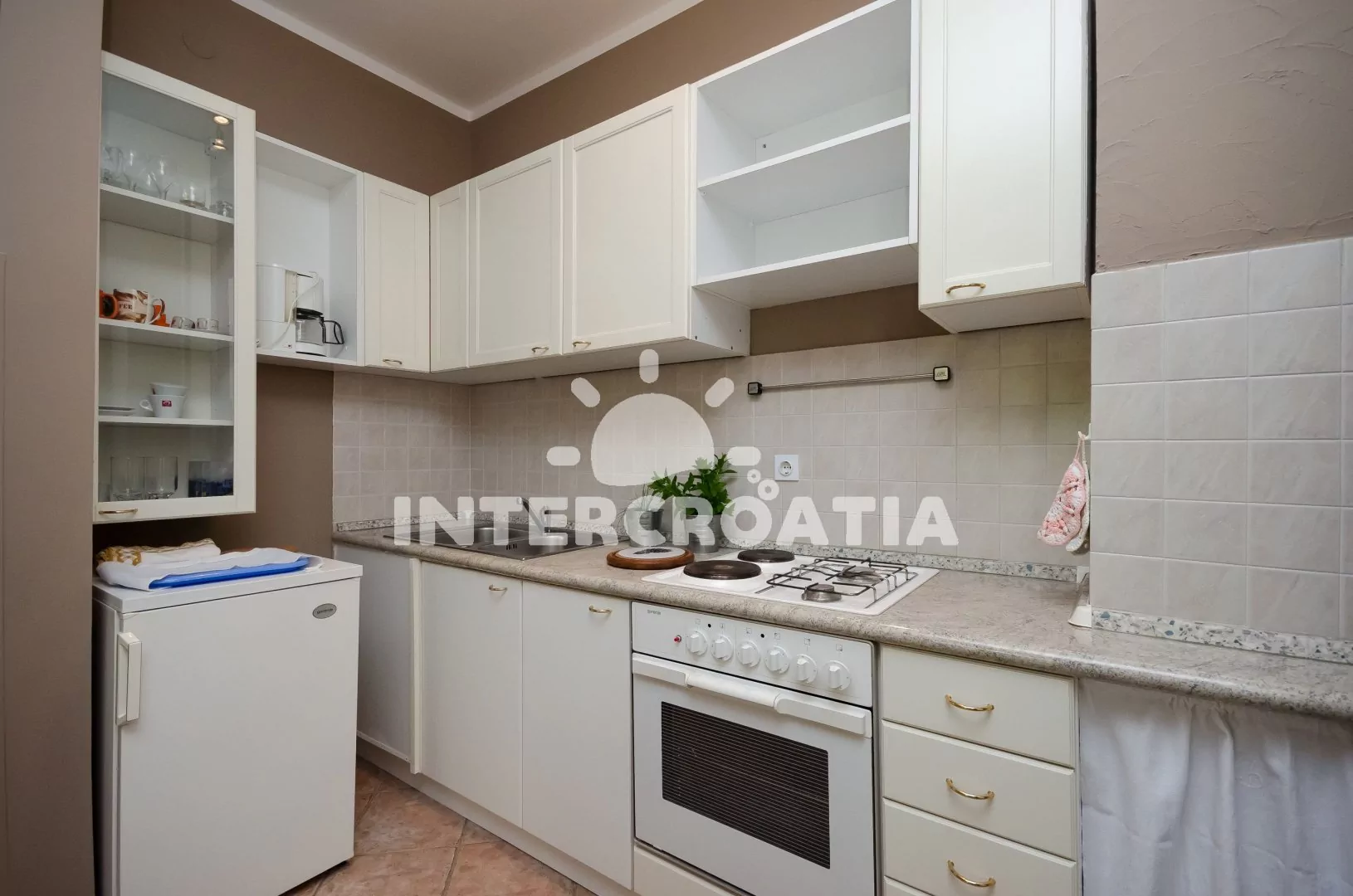 Vzdálenosti: Moře a pláž 700 m, centrum 1 km, veřejná doprava 3 km, restaurace, bar, potápění 400 m, ambulance 700 m, lékárna, směnárna, banka, čerpací stanice 800 m, minigolf, pošta 1 km, tenis, půjčovna motorových člunů, kol 1,2 km, diskotéka 1,7 km, přístav 1,8 km, muzeum, venkovní bazén, trajekt 10 km, letiště 17 km.