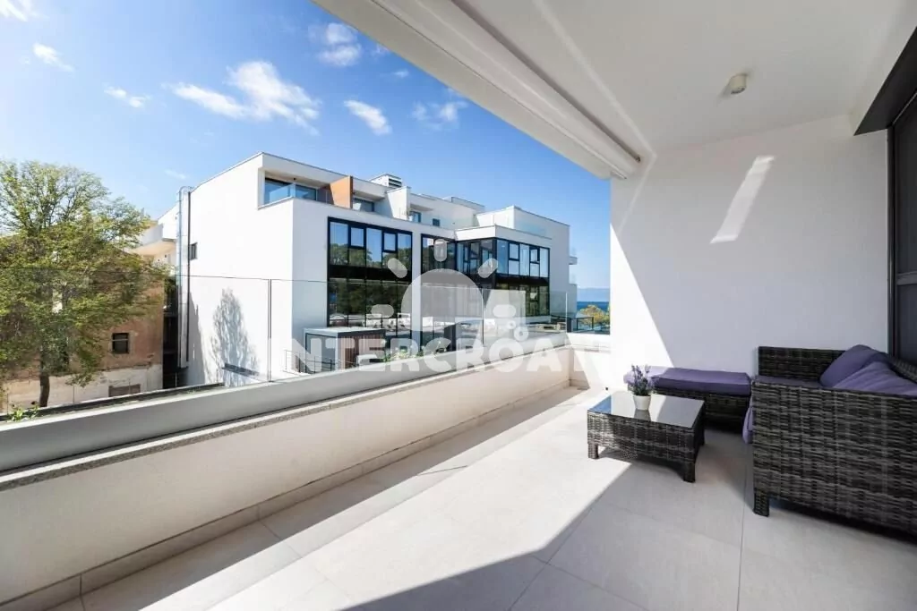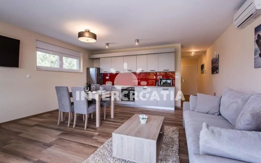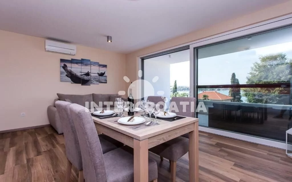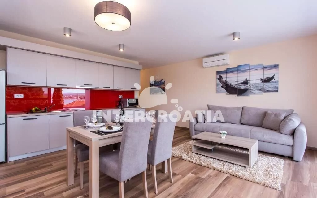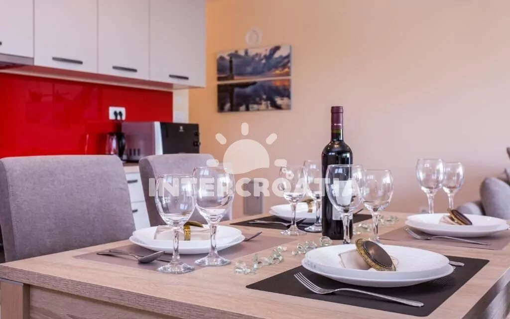 Apartmán (70 m2) s terasou, venkovním posezením a výhledem na moře se nachází v 1. patře domu. Apartmán má 2 ložnice a je vhodný pro až 4 osoby. Obývací pokoj je spojený s kuchyní. Kuchyňská linka je vybavena sklokeramickou varnou deskou, digestoří, vestavěnou troubou, myčkou na nádobí, mikrovlnnou troubou, kávovarem, toustovačem, nádobím a lednicí s mrazákem. Obývací pokoj s jídelním stolem pro 4 osoby, pohovkou, televizí se satelitním programem, klimatizací a vstupem na terasu. První ložnice s dvoulůžkem. Druhá ložnice s dvoulůžkem. Koupelna se sprchovým koutem, umyvadlem, pračkou a wc. Hostům je k dispozici parkování u objektu zdarma.