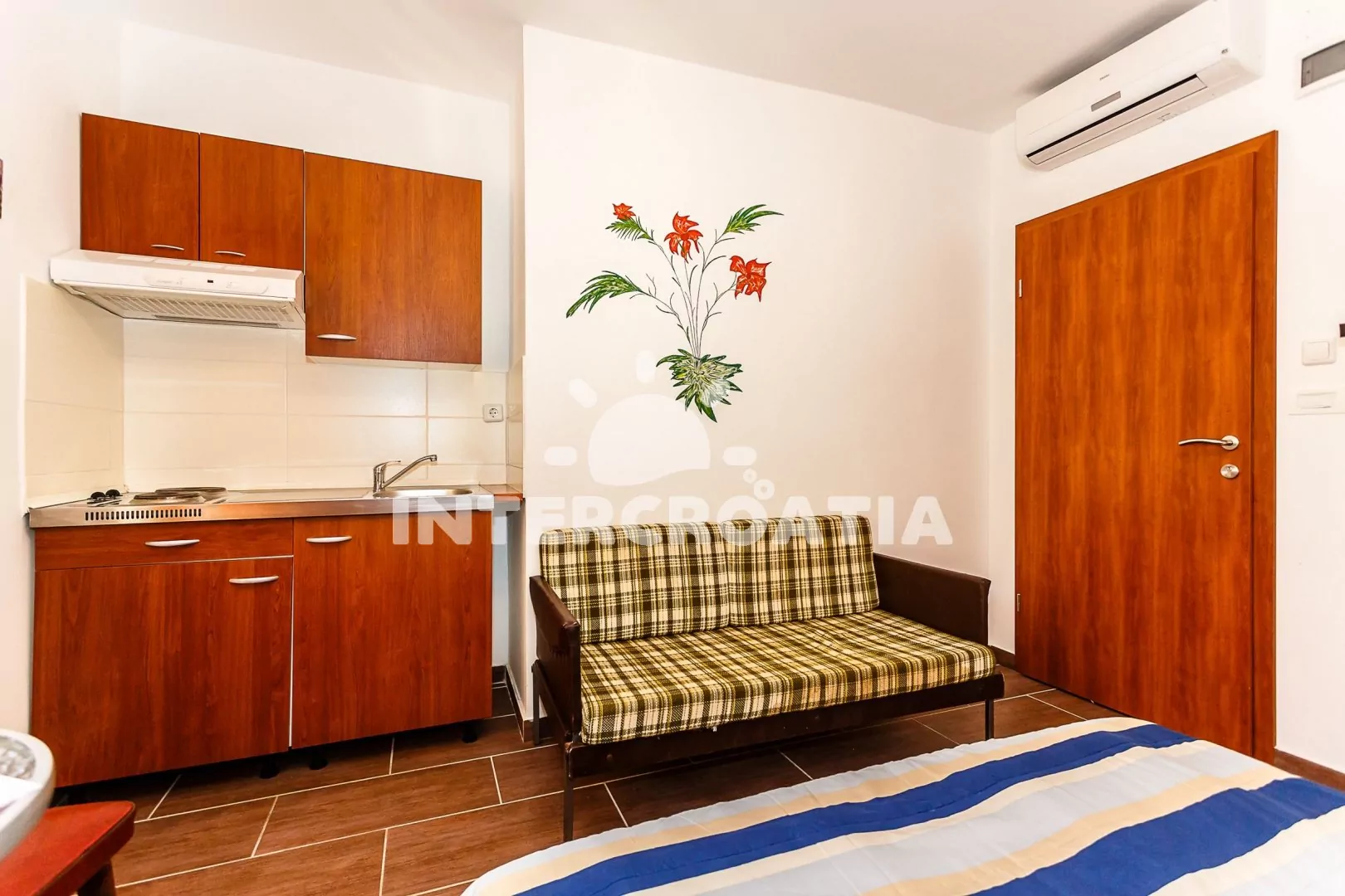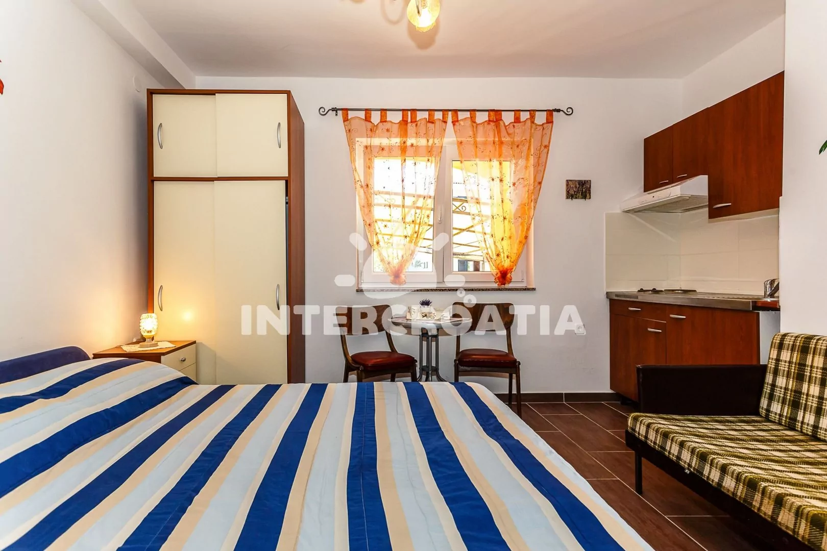 Apartmán (15 m2) typu studio se sdílenou terasou a venkovním posezením se nachází ve zvýšeném přízemí domu. Apartmán je vhodný pro 2 osoby. Obývací místnost je spojena s kuchyní. Kuchyňská linka je vybavena dvouplotýnkovým vařičem, digestoří, mikrovlnnou troubou, rychlovarnou konvicí, kávovarem, nádobím a lednicí s mrazákem. Obývací místnost s jídelním stolem, pohovkou, televizí se satelitním programem, dvoulůžkem, sejfem a klimatizací. Koupelna se sprchovým koutem, umyvadlem, fénem a wc. Hostům je k dispozici parkování u objektu zdarma.