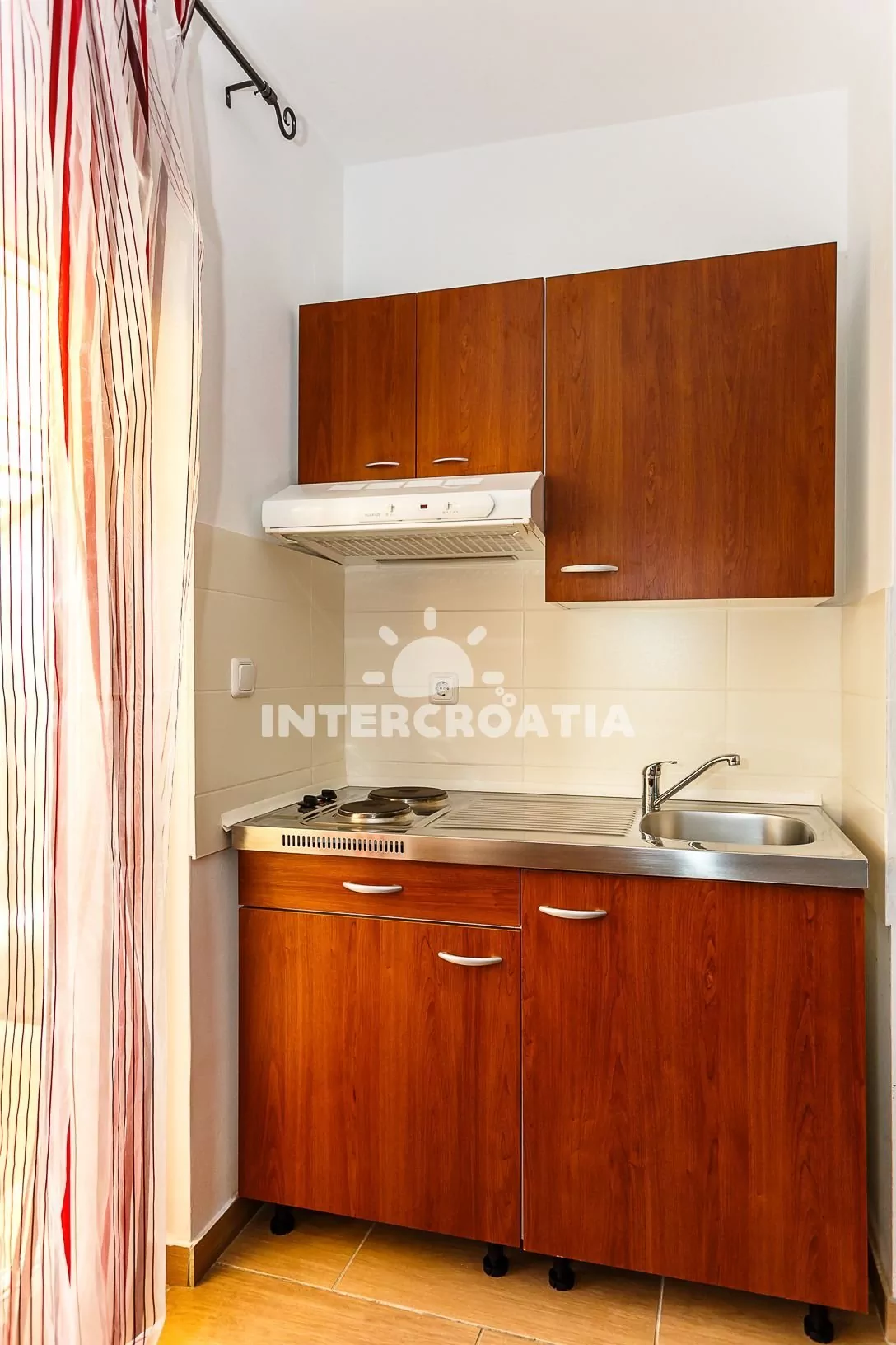 Apartmán (15 m2) typu studio s balkonem a venkovním posezením se nachází v 1. patře domu. Apartmán je vhodný pro 2 osoby. Obývací místnost je spojena s kuchyní. Kuchyňská linka je vybavena dvouplotýnkovým vařičem, digestoří, mikrovlnnou troubou, rychlovarnou konvicí, kávovarem, nádobím a lednicí s mrazákem. Obývací místnost s jídelním stolem, pohovkou, televizí se satelitním programem, dvoulůžkem, sejfem, klimatizací a vstupem na balkon. Koupelna se sprchovým koutem, umyvadlem, fénem a wc. Hostům je k dispozici parkování u objektu zdarma.