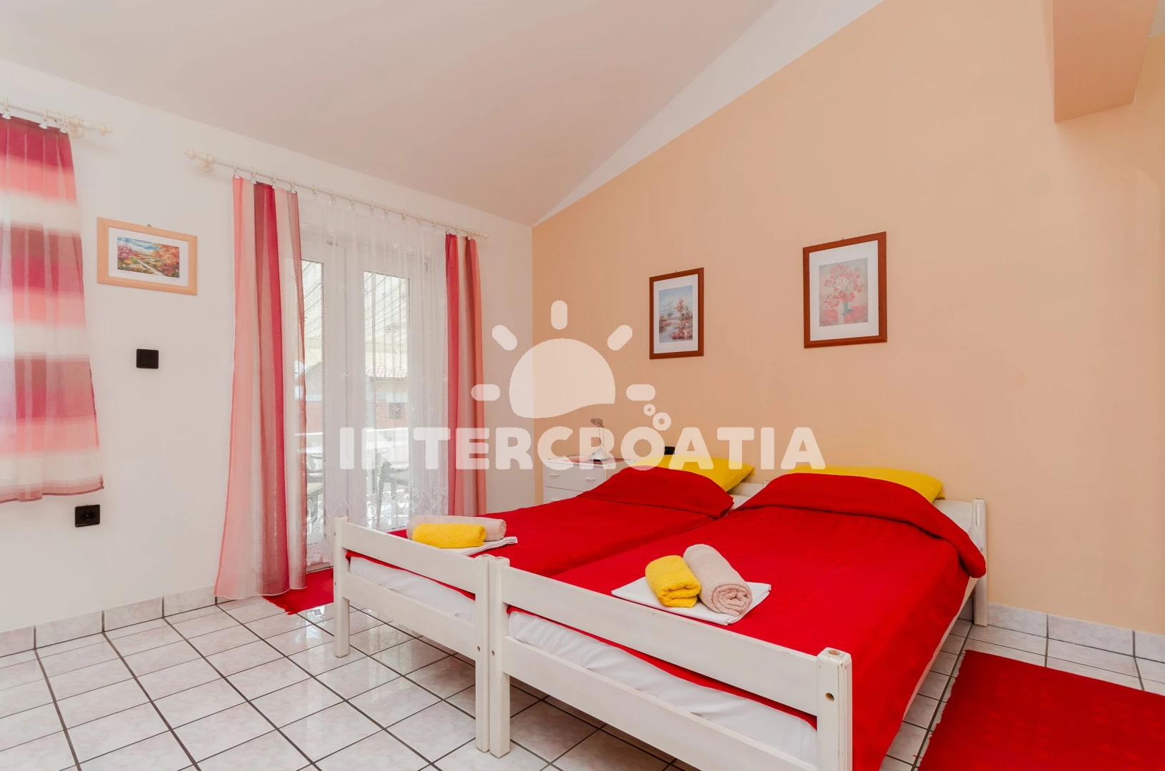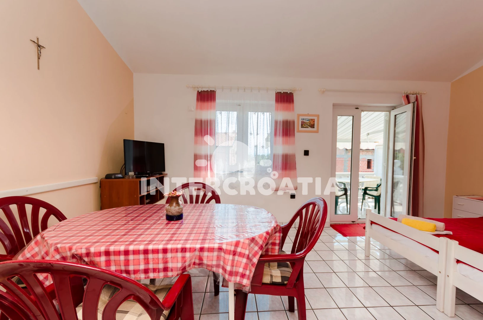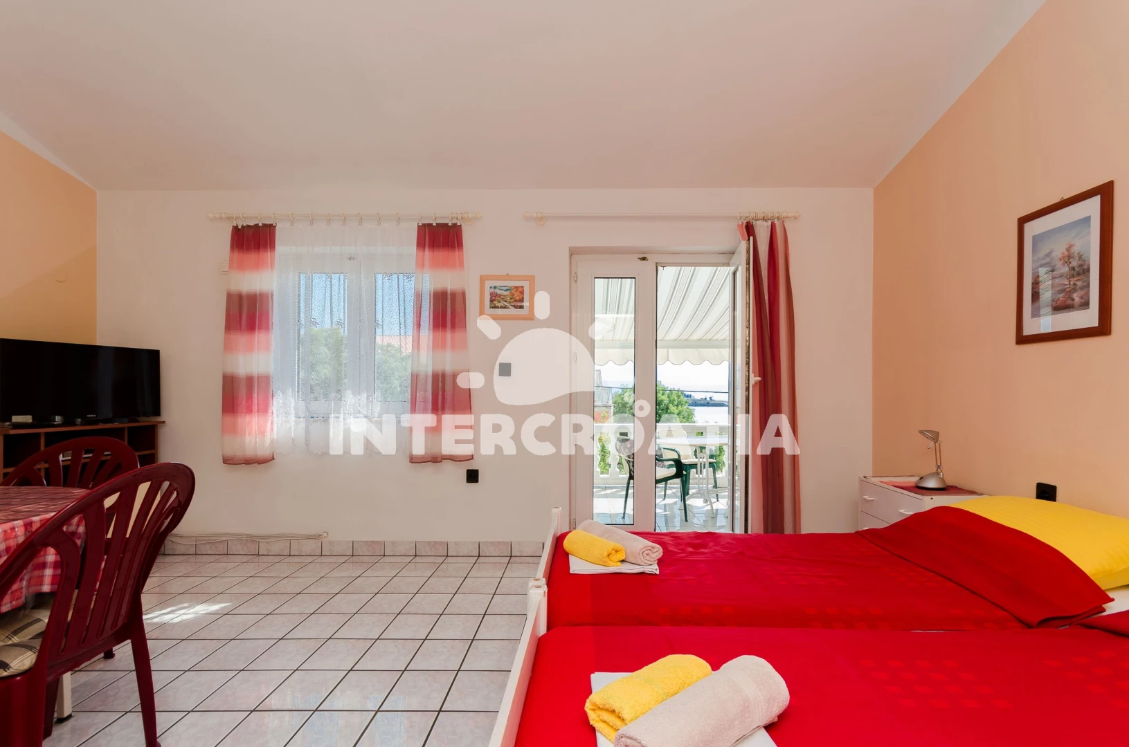 Apartmán se nachází 300 m od moře a pláže. Pláž je oblázková a betonové desky. U objektu je k dispozici společná zahrada s posezením a grilem.