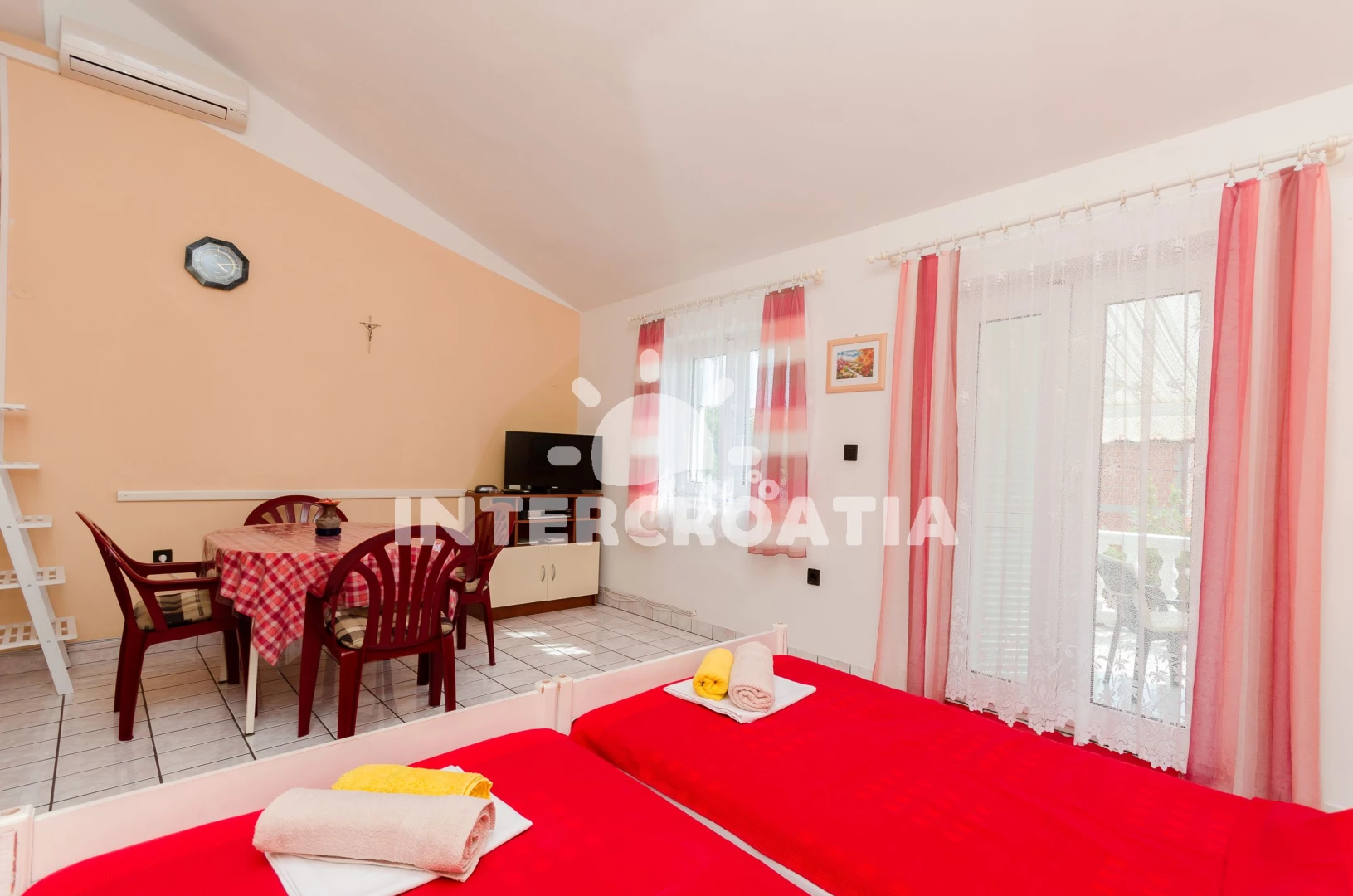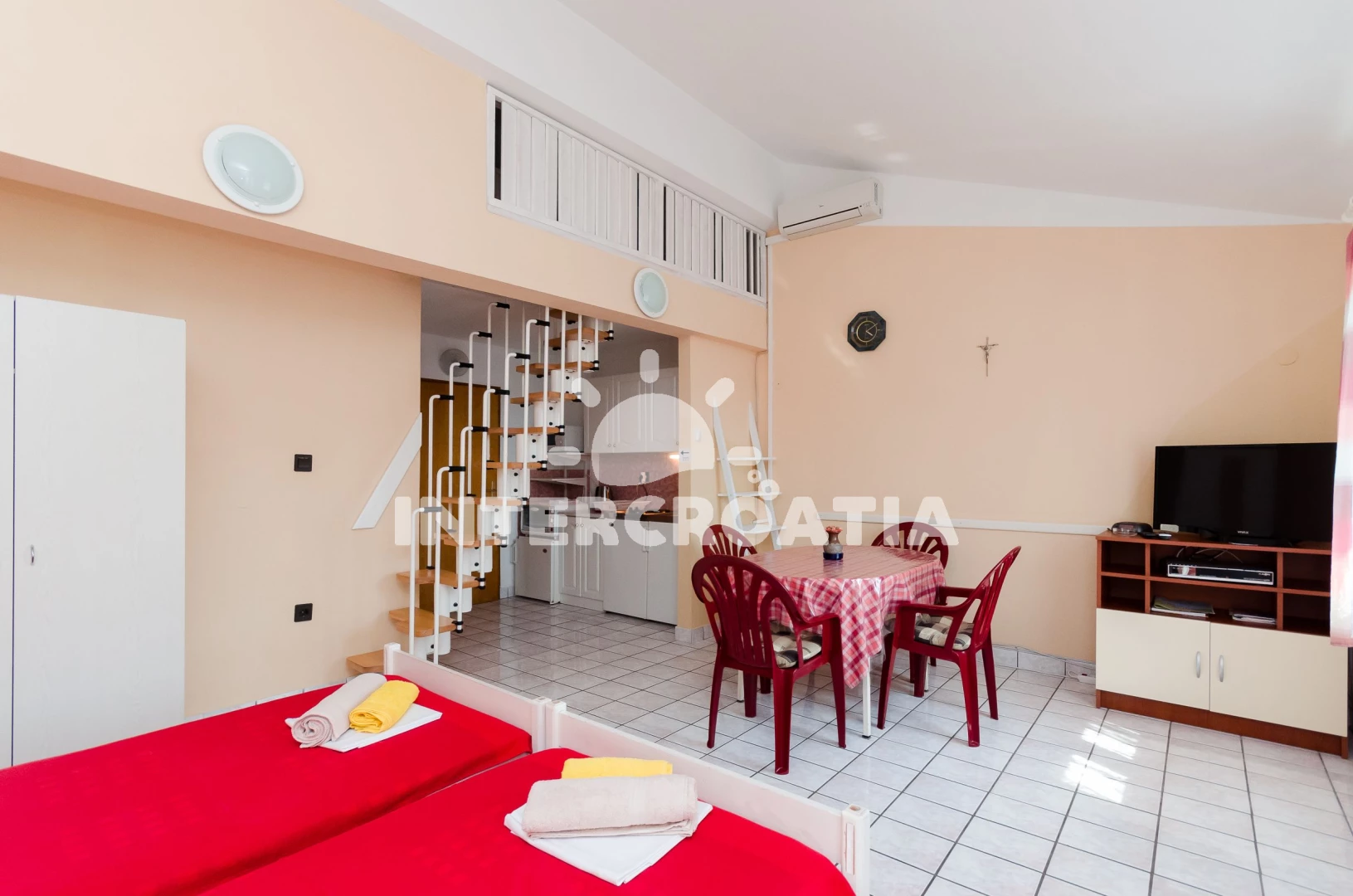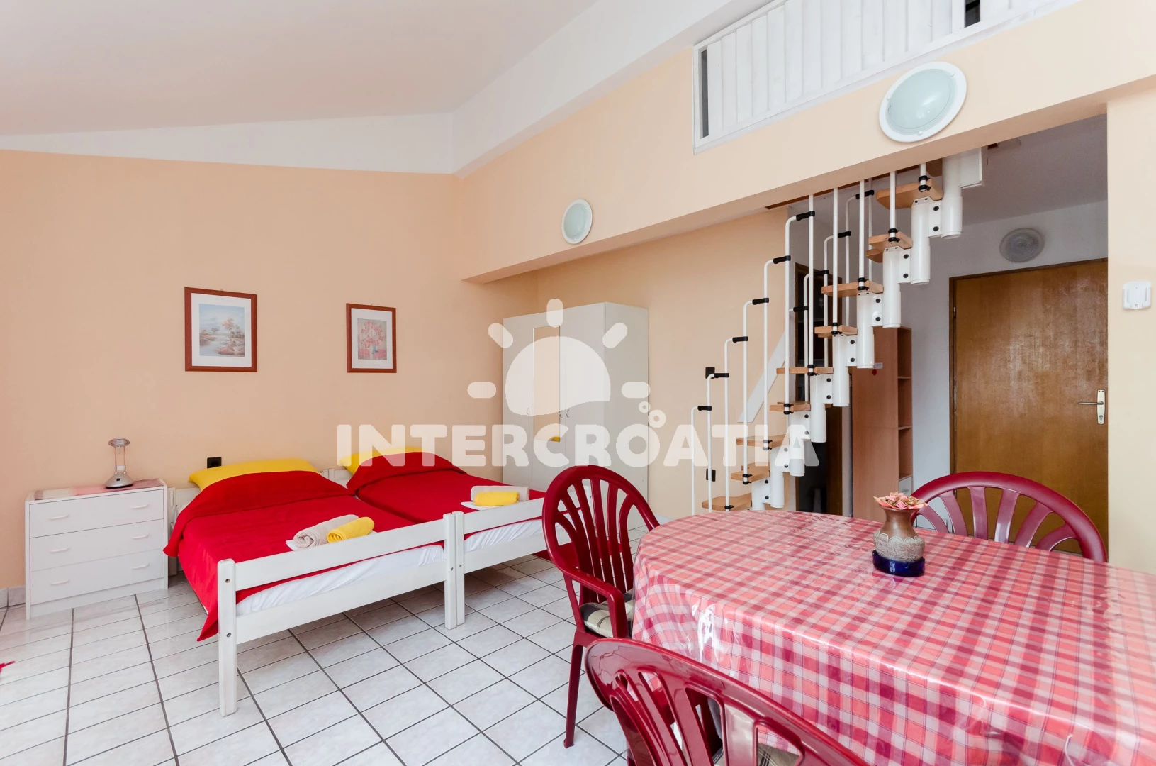 Apartmán se nachází 300 m od moře a pláže. Pláž je oblázková a betonové desky. U objektu je k dispozici společná zahrada s posezením a grilem.
