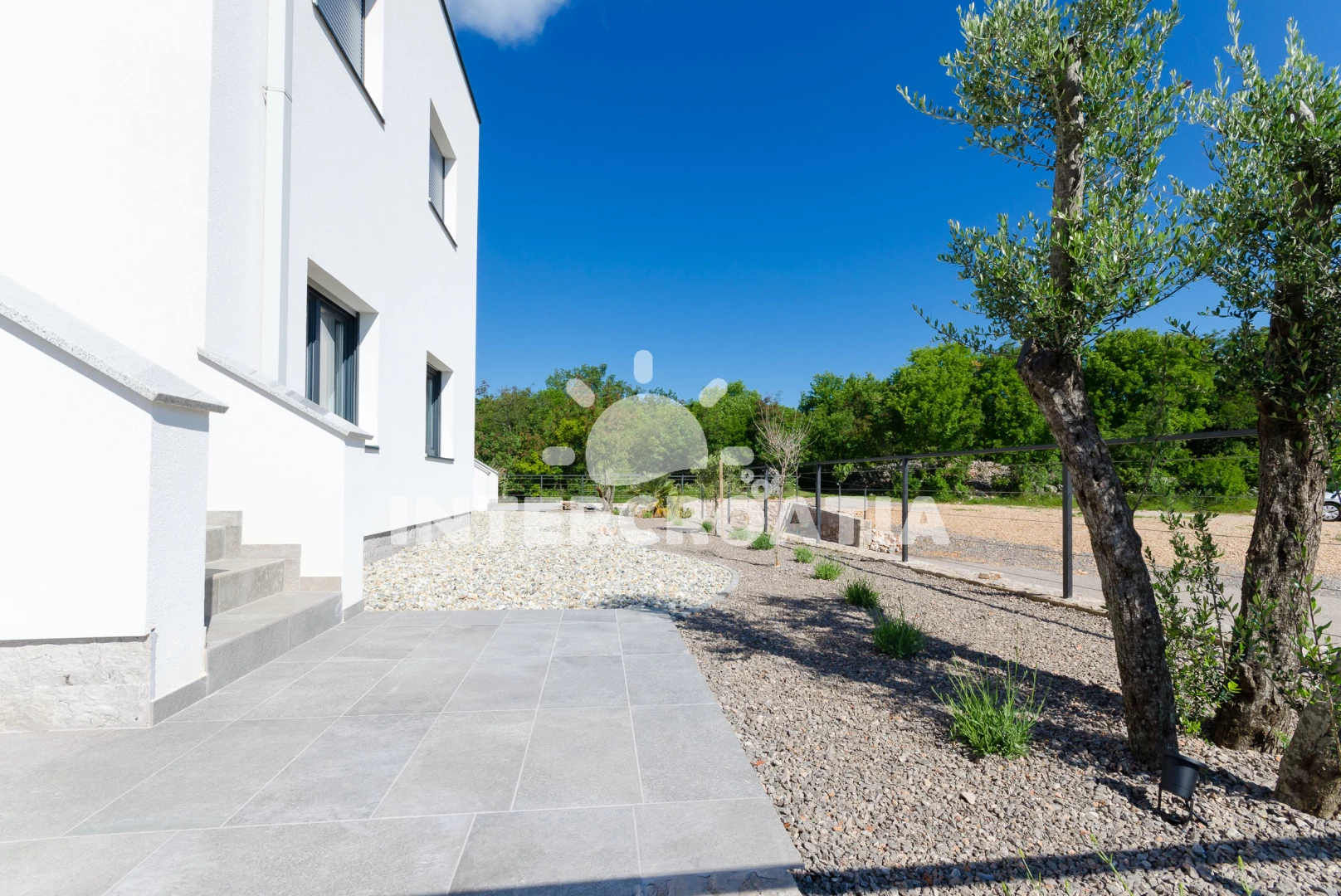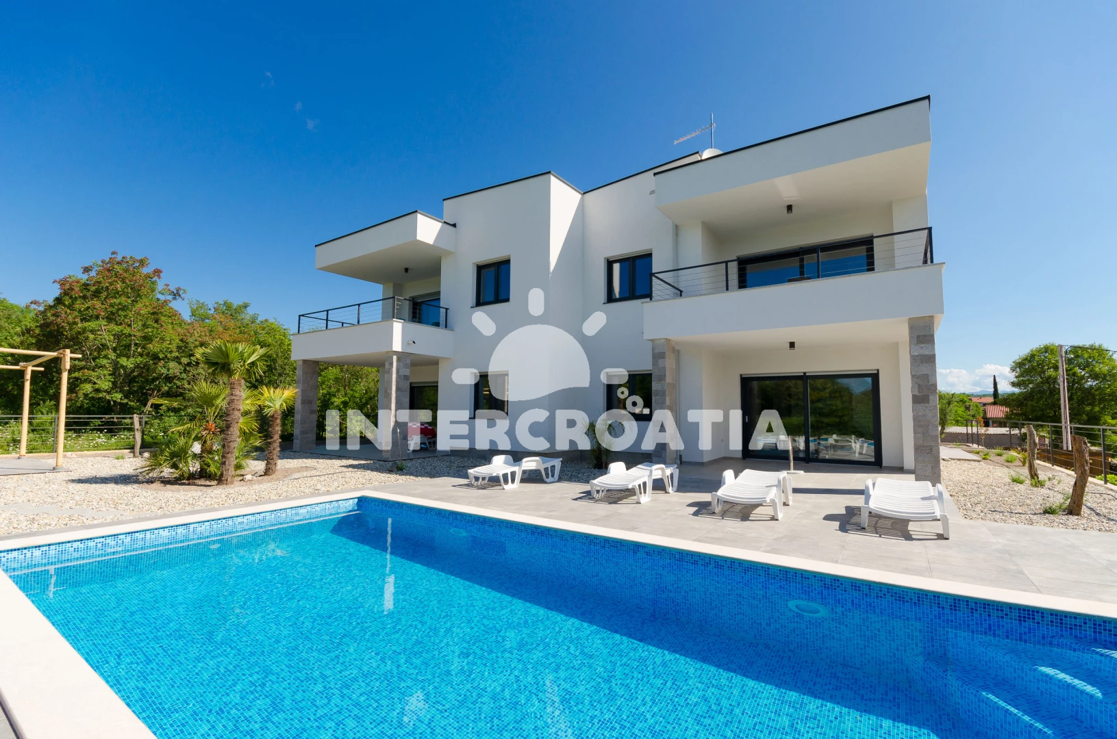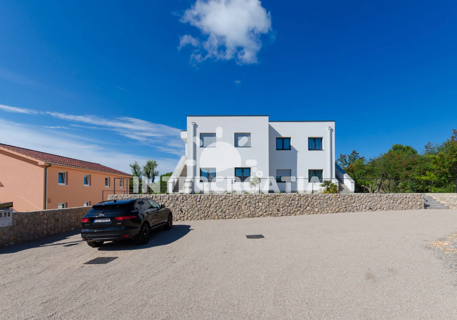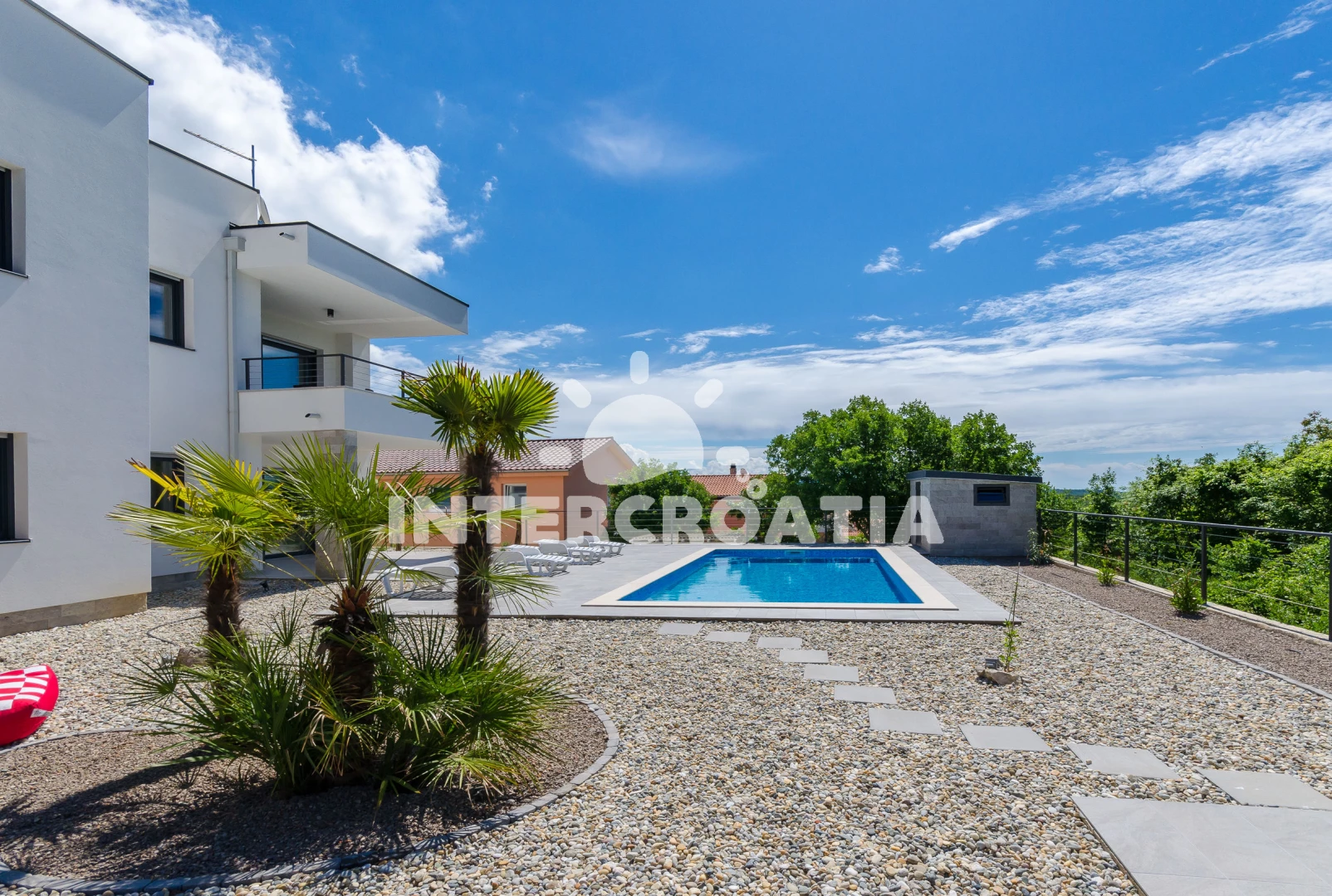Apartmán se nachází 1500 m od moře a pláže. Pláž je oblázková a betonové desky. Apartmán disponuje bazénem s lehátky pro ubytované hosty. U objektu je k dispozici společná zahrada s posezením a grilem. Parkování je před domem.