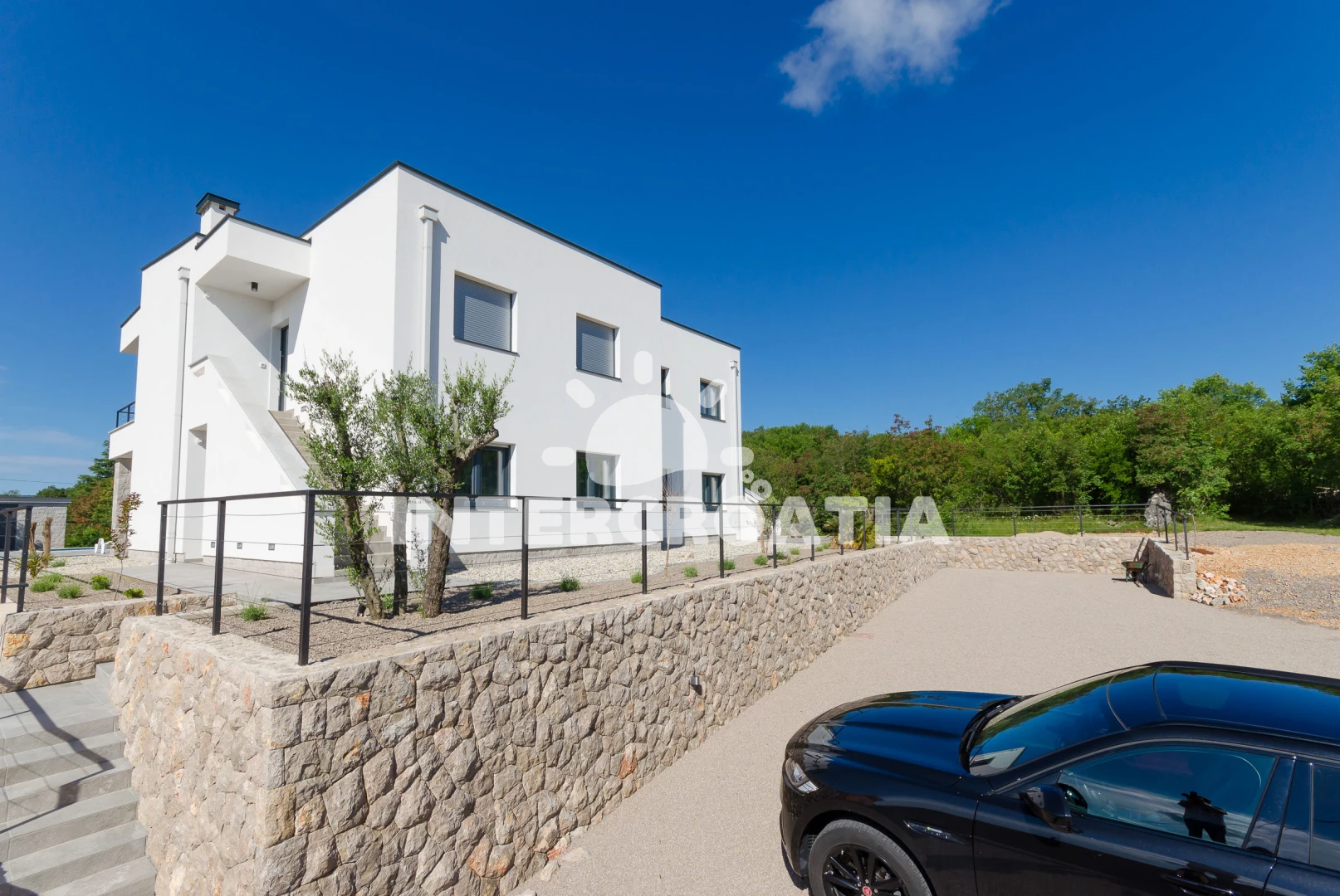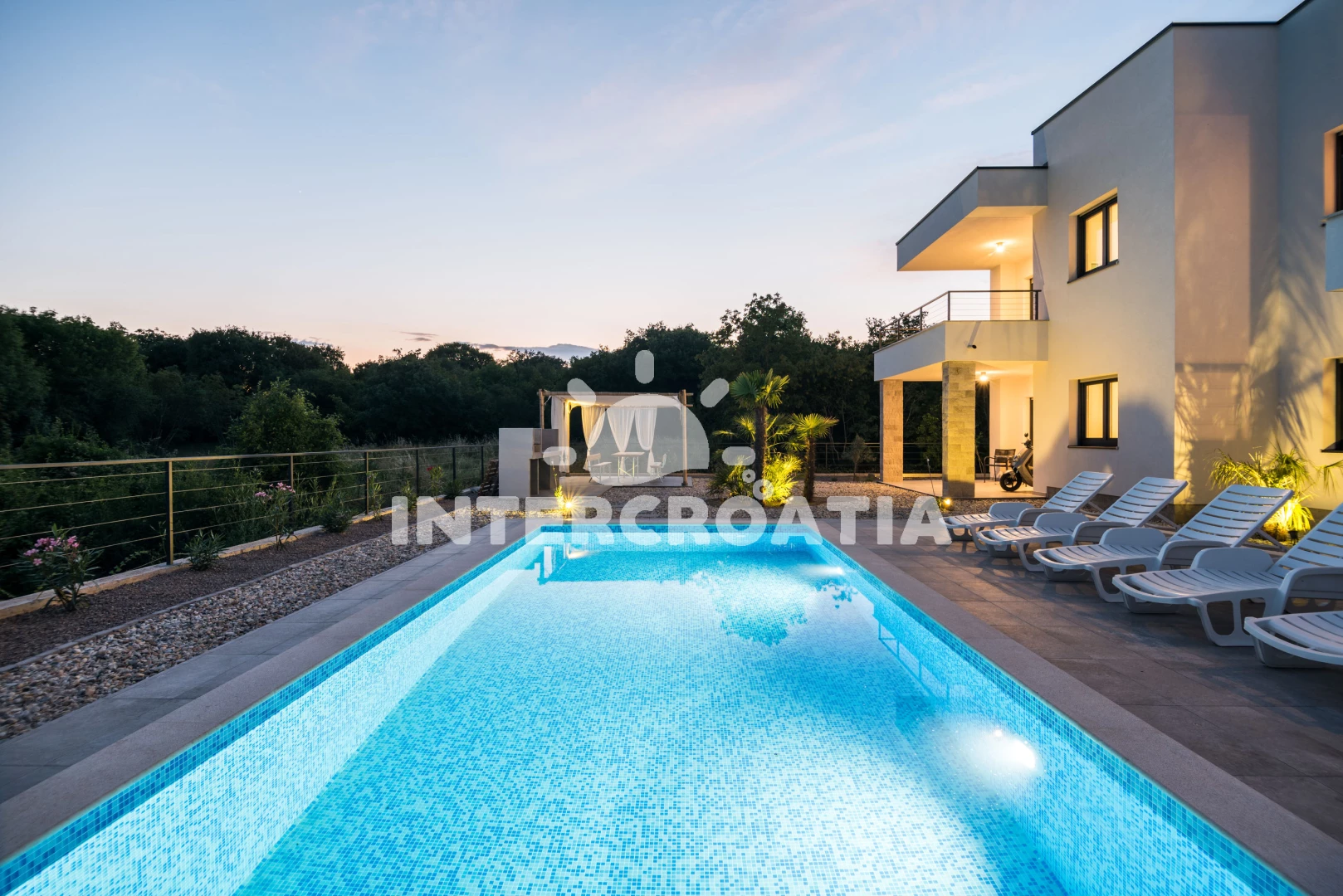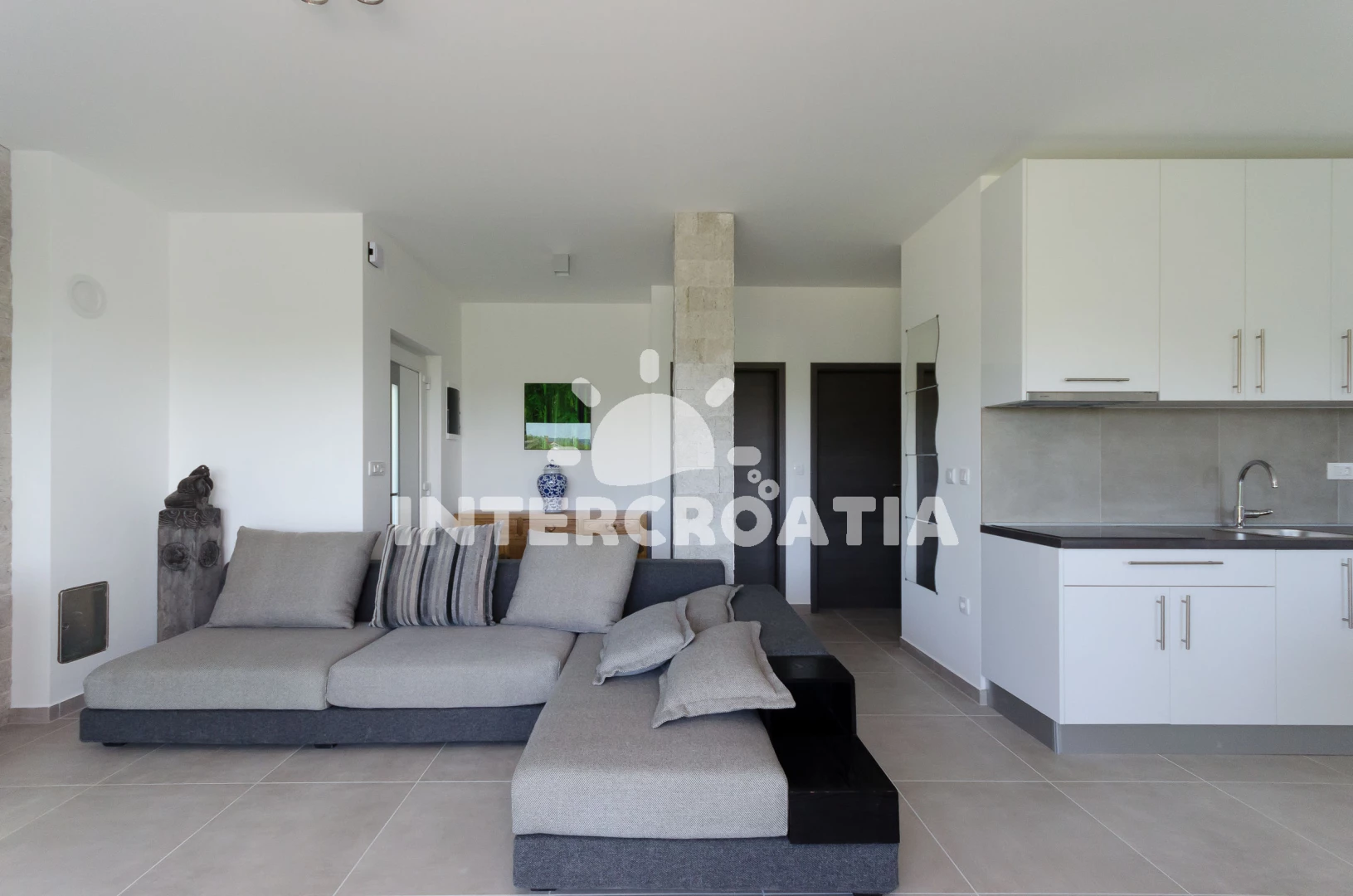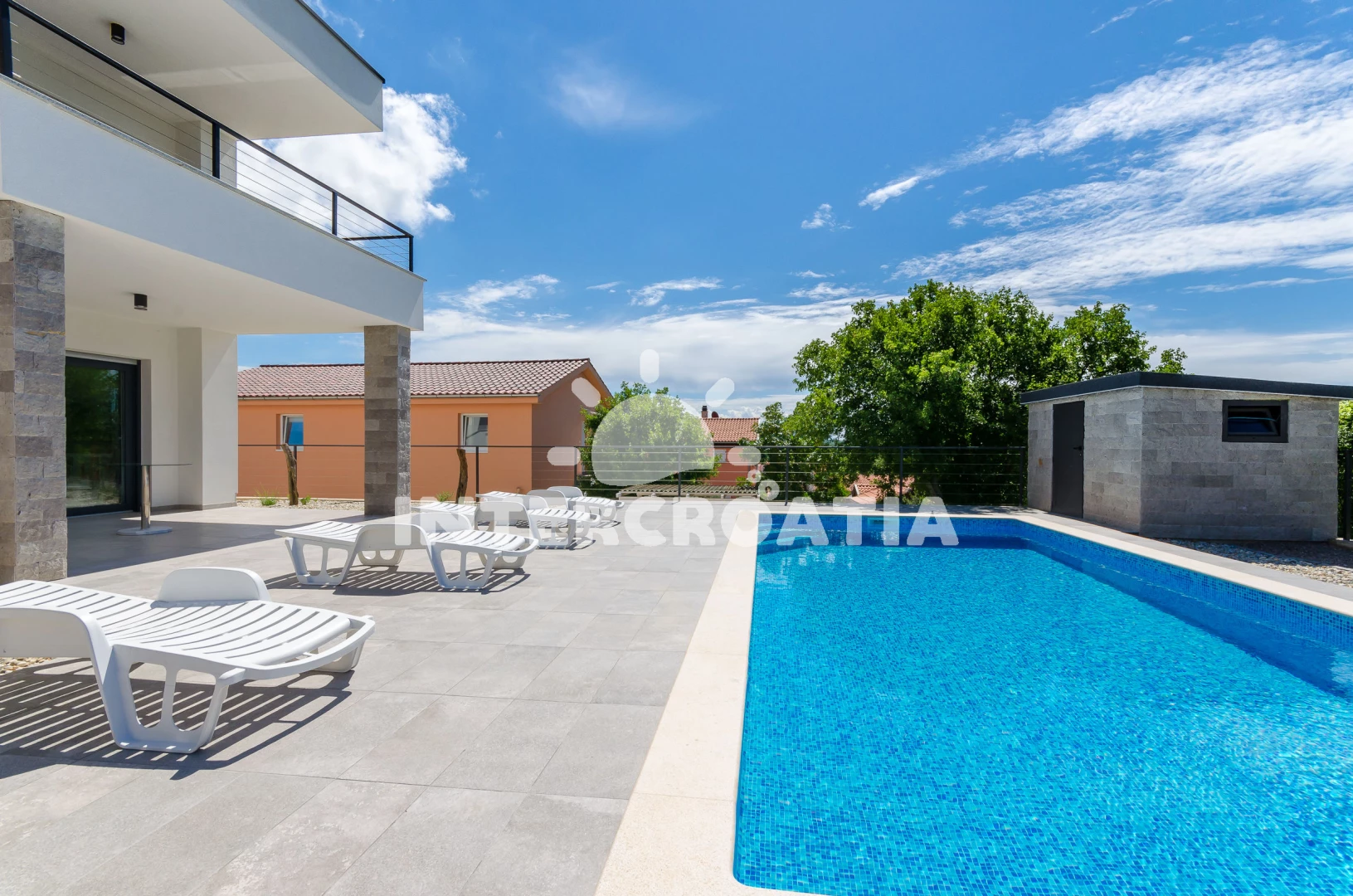 Apartmán se nachází 1500 m od moře a pláže. Pláž je oblázková a betonové desky. Apartmán disponuje bazénem s lehátky pro ubytované hosty. U objektu je k dispozici společná zahrada s posezením a grilem. Parkování je před domem.