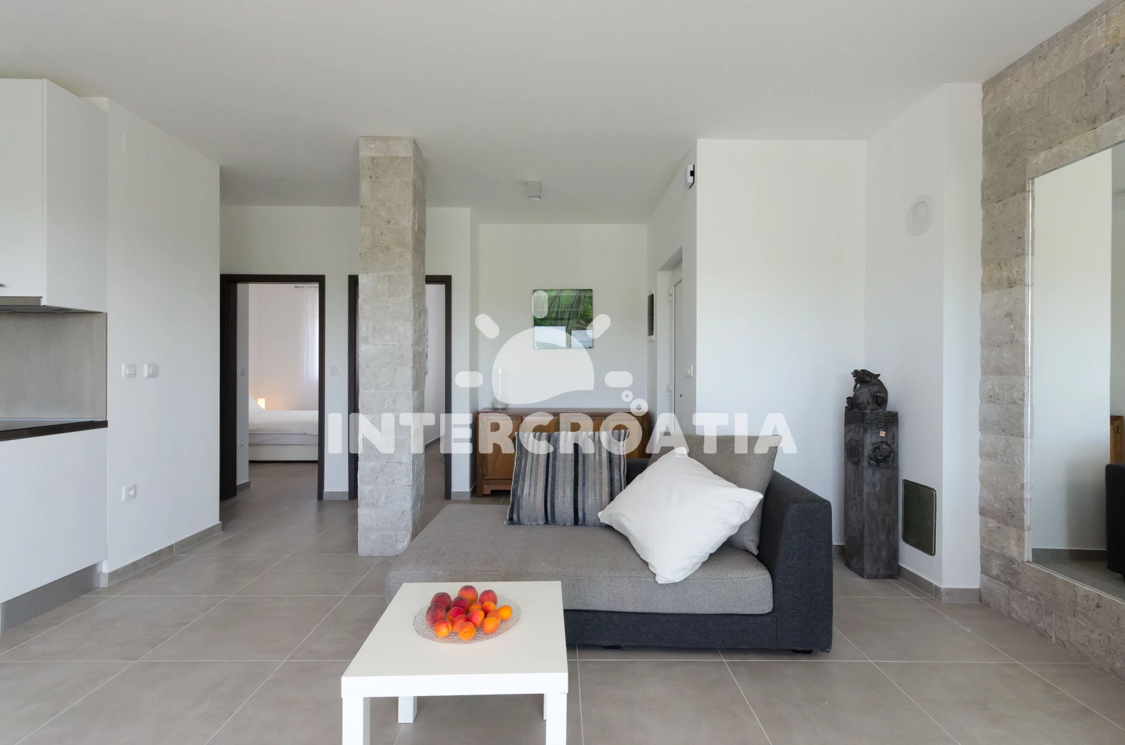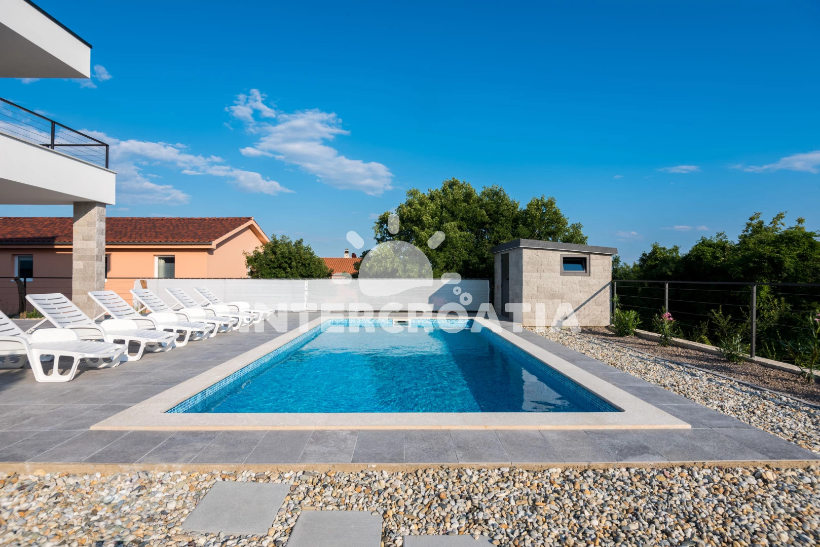 Apartmán se nachází 1500 m od moře a pláže. Pláž je oblázková a betonové desky. Apartmán disponuje bazénem s lehátky pro ubytované hosty. U objektu je k dispozici společná zahrada s posezením a grilem. Parkování je před domem.