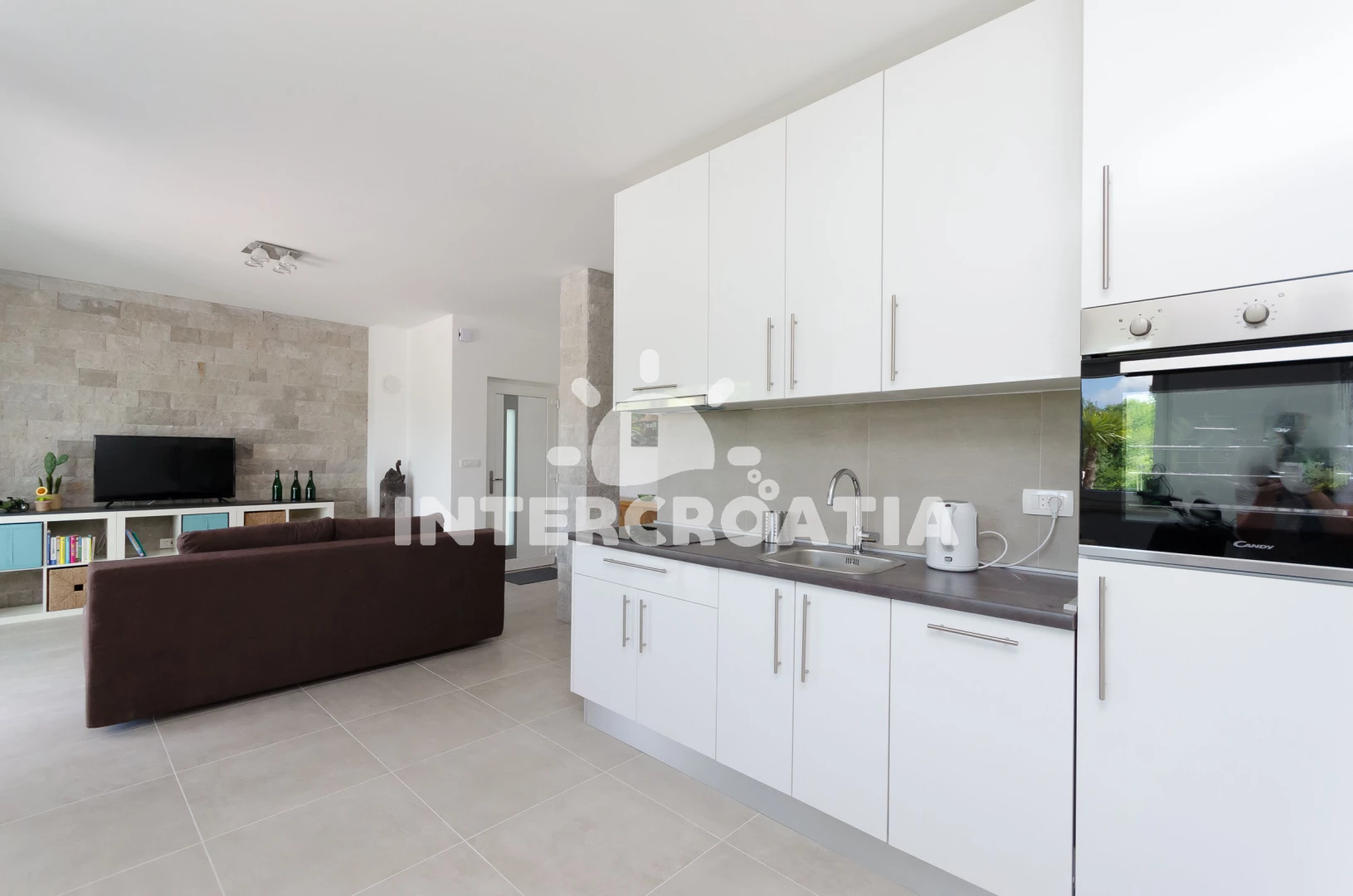 Apartmán se nachází 1500 m od moře a pláže. Pláž je oblázková a betonové desky. Apartmán disponuje bazénem s lehátky pro ubytované hosty. U objektu je k dispozici společná zahrada s posezením a grilem. Parkování je před domem.