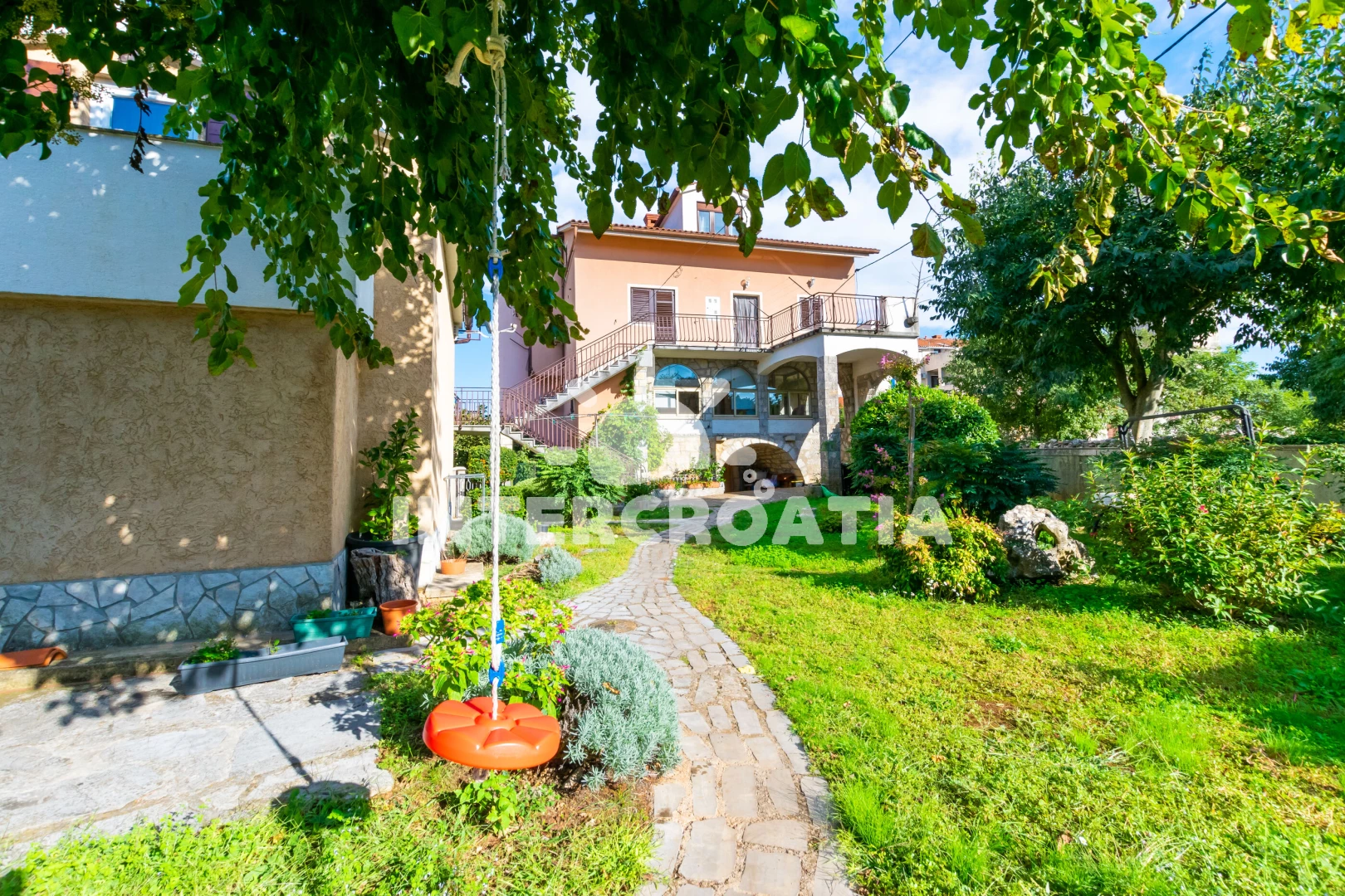Apartmán se nachází 2500 m od moře a pláže. Pláž je oblázková. Apartmán disponuje bazénem s lehátky pro ubytované hosty. U objektu je k dispozici společná zahrada s posezením a grilem. Parkování je před domem.