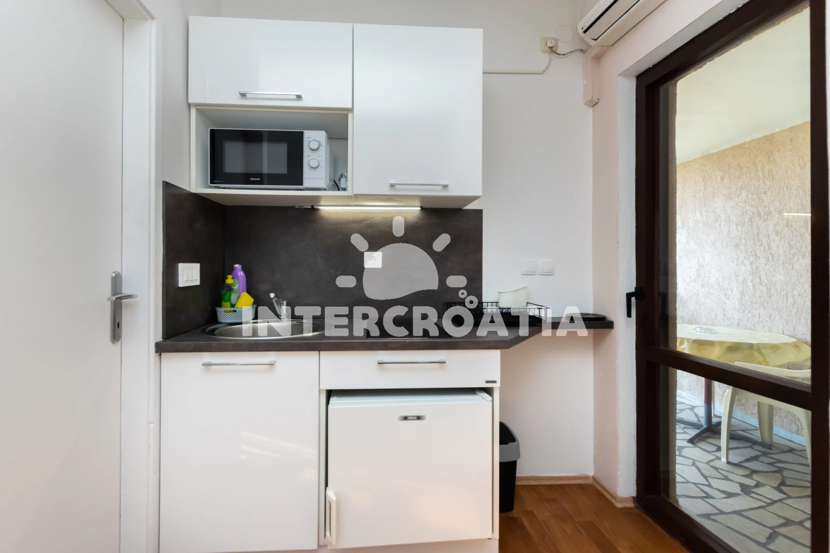 příjemný personál, flexibilní s časy příjezdů/odjezdů, nabídli nám delší pobyt poslední den až do odpoledne, krásný výhled na balkon garsonky, úhledná koupelna, studio je malé, ale má vše pro 2 osoby, pěkný dvůr, možnost parkování, poblíž je taverna, ale nešli jsme, také malý obchod, ale šli jsme do obchodu v sousedním městě Milohniće, ubytování čisté, ubytování