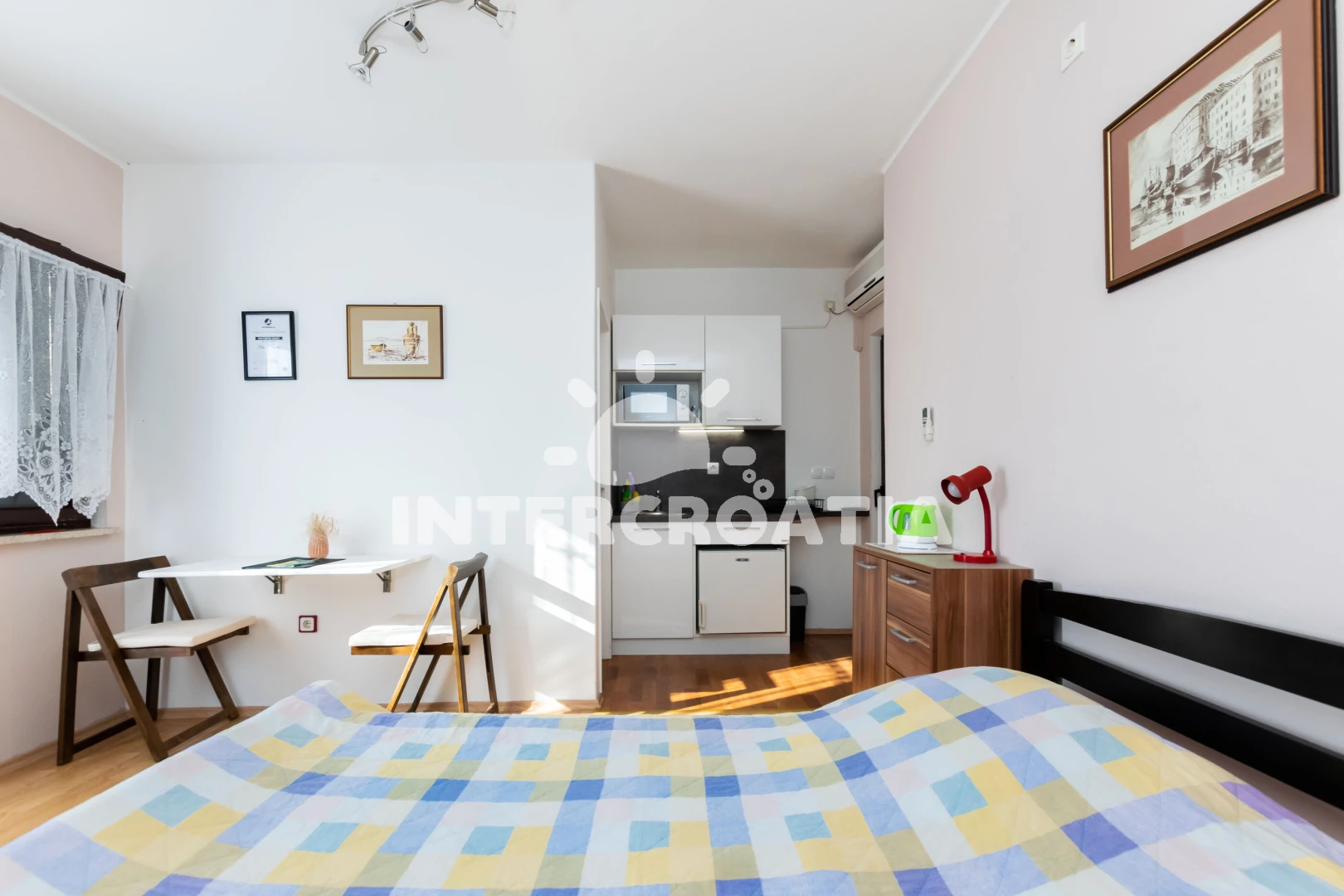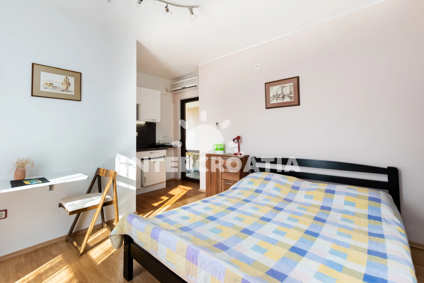 Apartmán typu studio (23 m2) s balkonem. Nachází se v 1. patře objektu. Kuchyňská linka je vybavena varnou deskou, kávovarem, troubou, nádobím, lednicí, mrazákem. K dispozici dvoulůžko, televize se satelitním programem, radio, žehlička. Koupelna se sprchovým koutem, umyvadlem, fénem a WC.