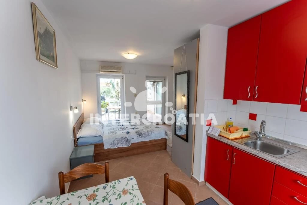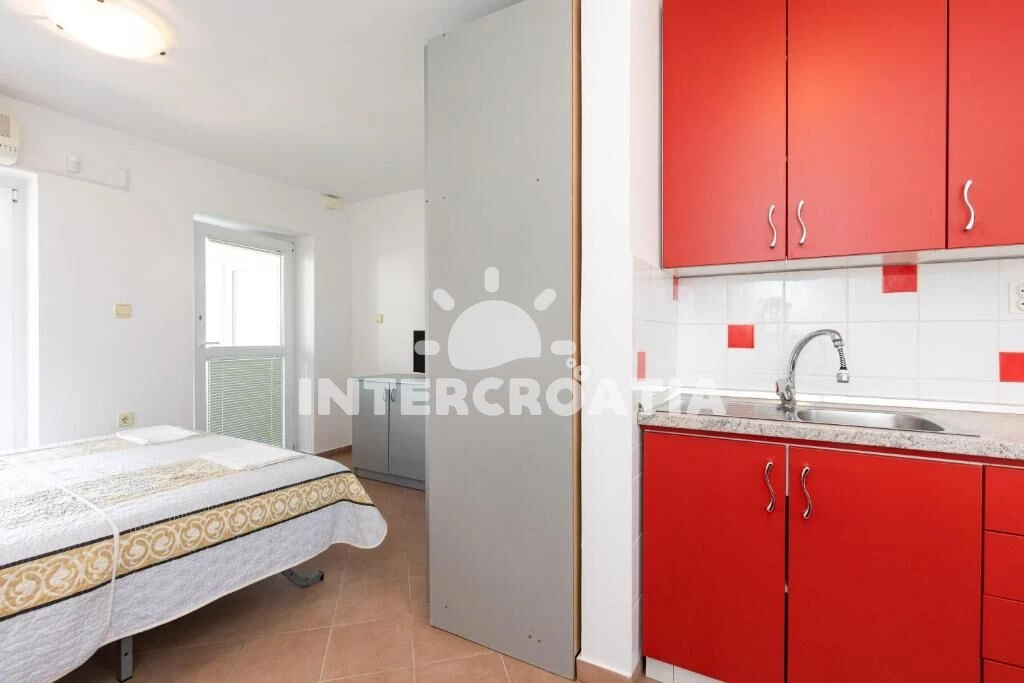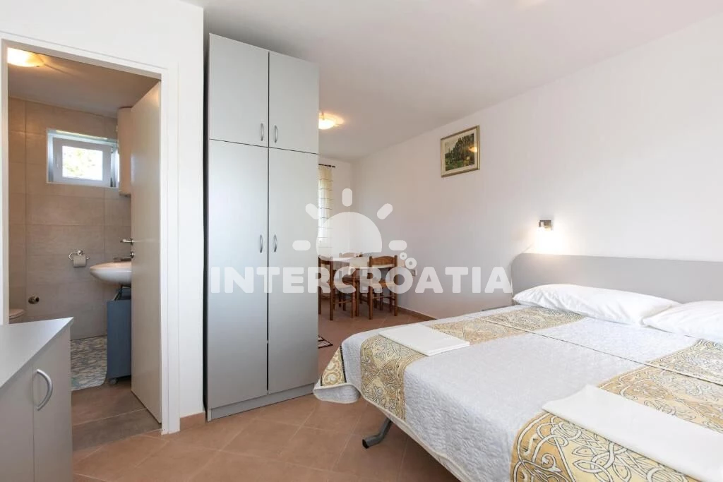 Vzdálenosti: Moře 175 m, pláž 200 m (písčitá a betonové desky), restaurace 30 m, centrum 200 m, bar 200 m, supermarket 200 m, marina 200 m, půjčovna motorových člunů 300 m, diskotéka 1 km, lékárna 2 km, půjčovna kol 2 km, potápění 2 km, ambulance 2 km, pošta 2 km, banka 2 km, čerpací stanice 2 km, směnárna 2 km, tenisové kurty 2,5 km, veřejná doprava 3 km, trajekt (Valbiska (Krk)) 16 km, letiště (Rijeka) 17 km, park Plitvice 187 km,