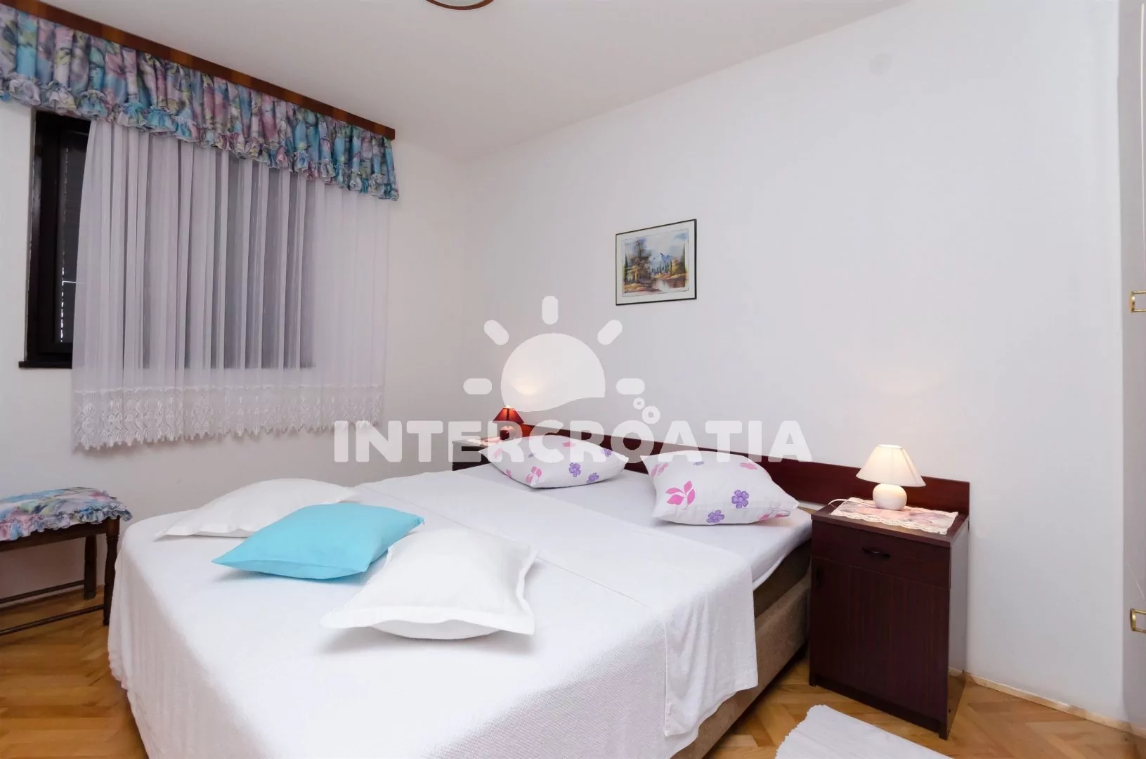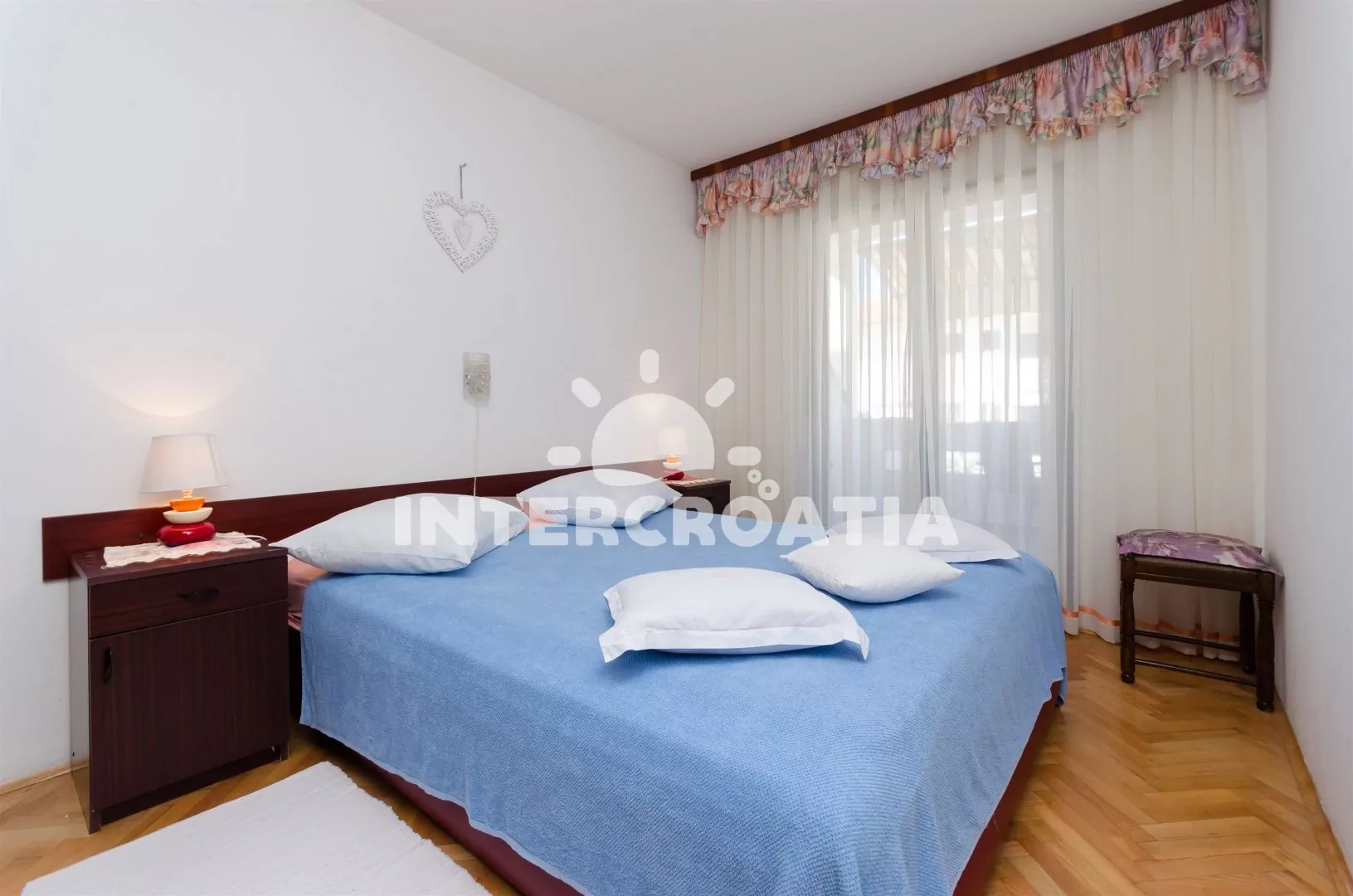 Apartmán umístěný ve zvýšeném přízemí, s terasou a výhledem do klidné ulice je vhodný pro 4 až 5 osob. Obývací pokoj je spojený s kuchyní. Kuchyňská linka je vybavena s varnou deskou, mikrovlnnou troubou, rychlovarnou konvicí, kávovarem, toustovačem, nádobím a lednicí s mrazákem. Obývací pokoj s jídelním stolem pro 4 osoby, rozložitelnou pohovkou (extra lůžko pro 1 osobu), televizí se satelitním programem a vstupem na balkon a terasu. První ložnice s dvoulůžkem a vstupem na terasu. Druhá ložnice s jedním dvoulůžkem. Koupelna se sprchovým koutem, umyvadlem, fénem a wc. Hostům je k dispozici parkování u objektu zdarma.