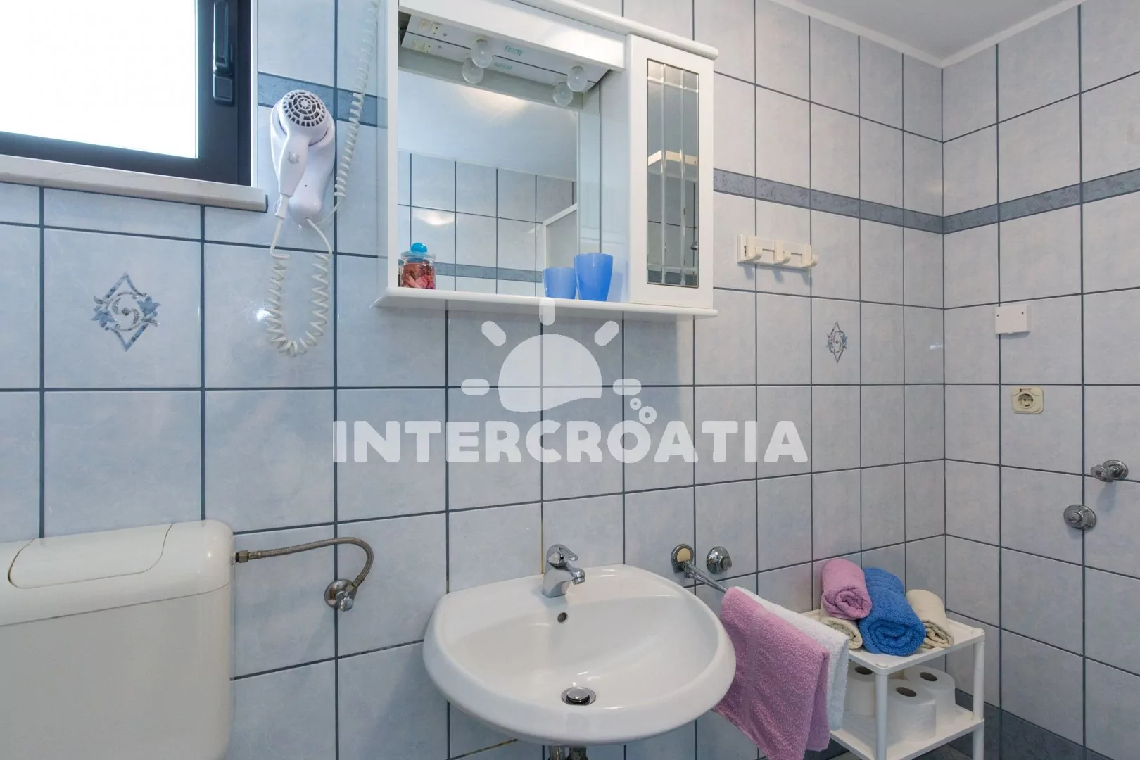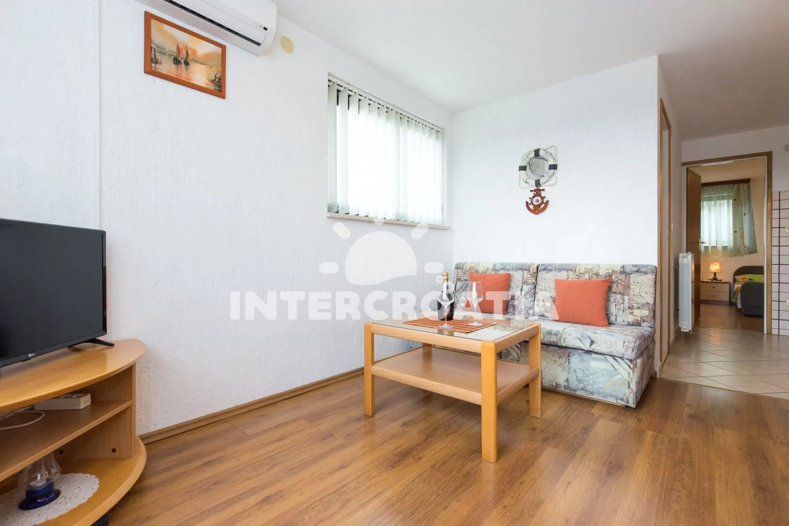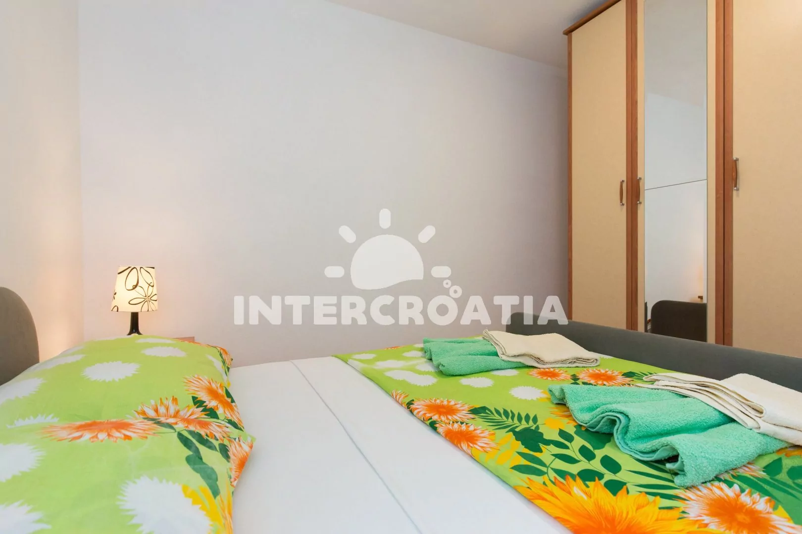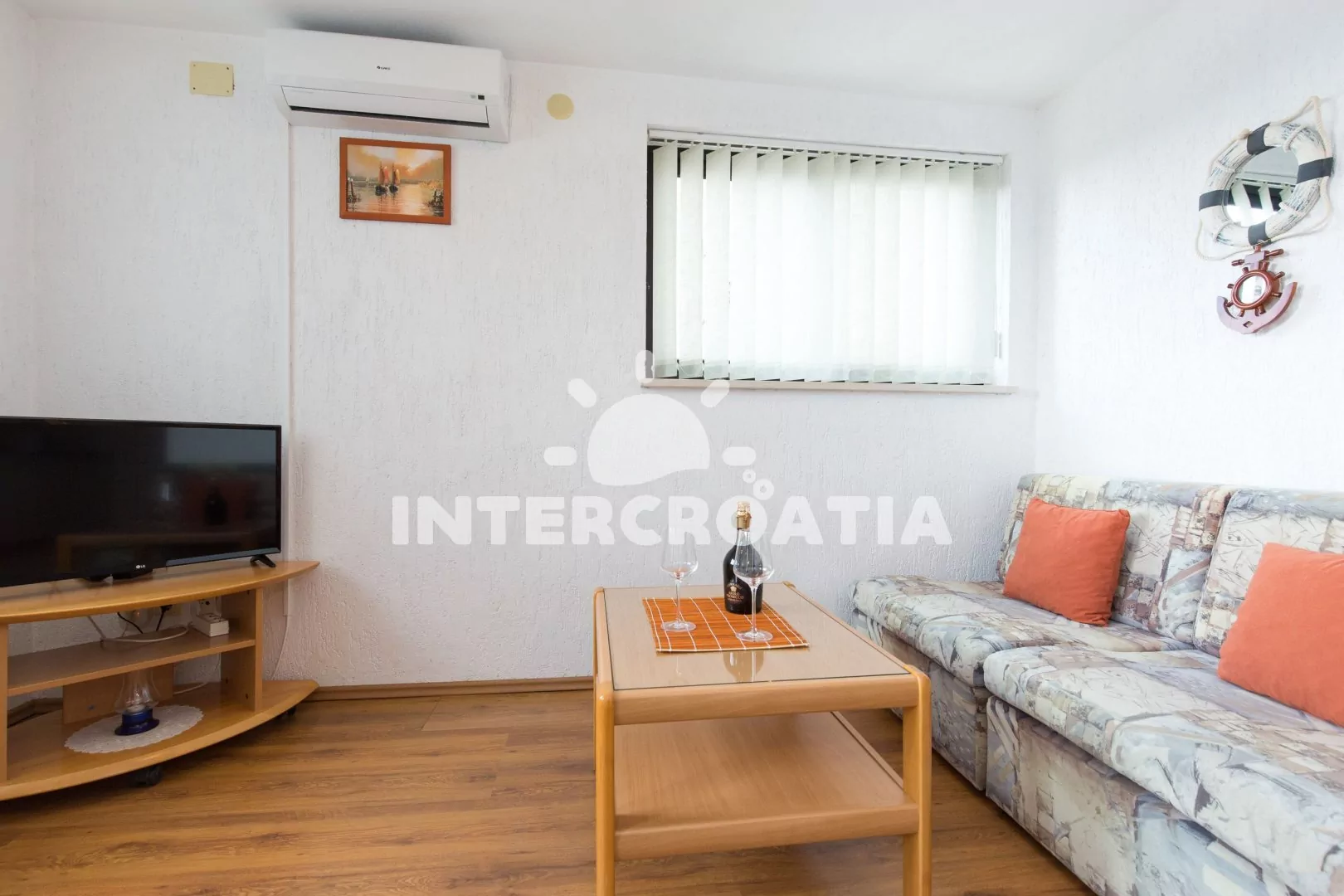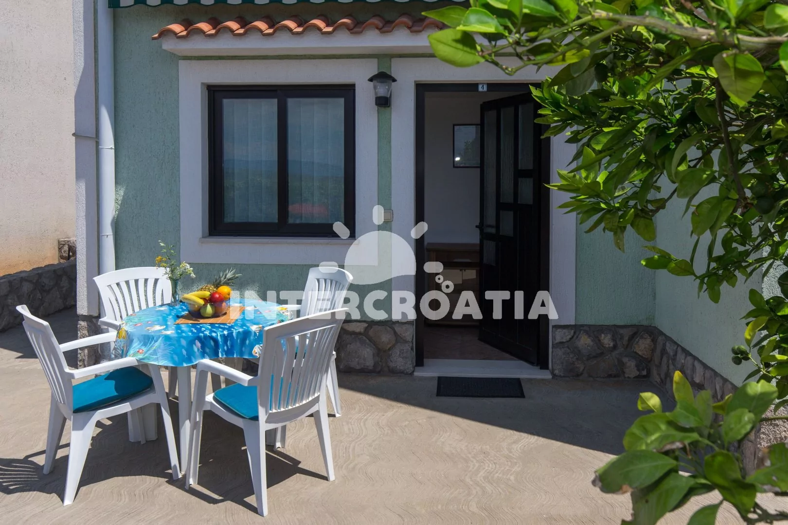 Apartmán (38 m2) s výhledem na moře a vlastní terasou, se nachází v přízemí domu a je vhodný pro 2 až 4 osoby. Obývací pokoj je spojený s kuchyní. Kuchyňská linka je vybavena varnou deskou, digestoří, mikrovlnnou troubou, rychlovarnou konvicí, kávovarem, nádobím a lednicí s mrazákem. Obývací pokoj s jídelním stolem pro 4 osoby, pohovkou (rozložitelná na extra lůžko pro 2 osoby), televizí se satelitním programem a klimatizací. Ložnice je vybavena jedním dvoulůžkem. Dále k dispozici sejf. Koupelna se sprchovým koutem, umyvadlem, fénem a wc. Hostům je k dispozici parkování u objektu zdarma.