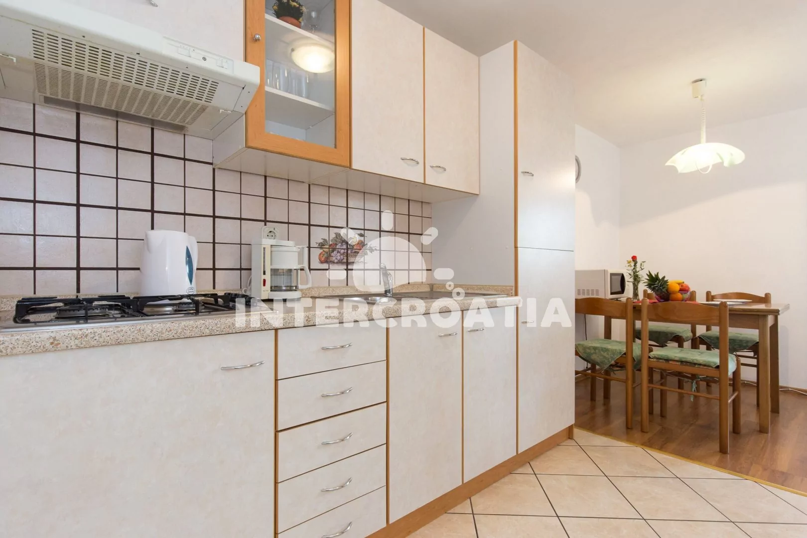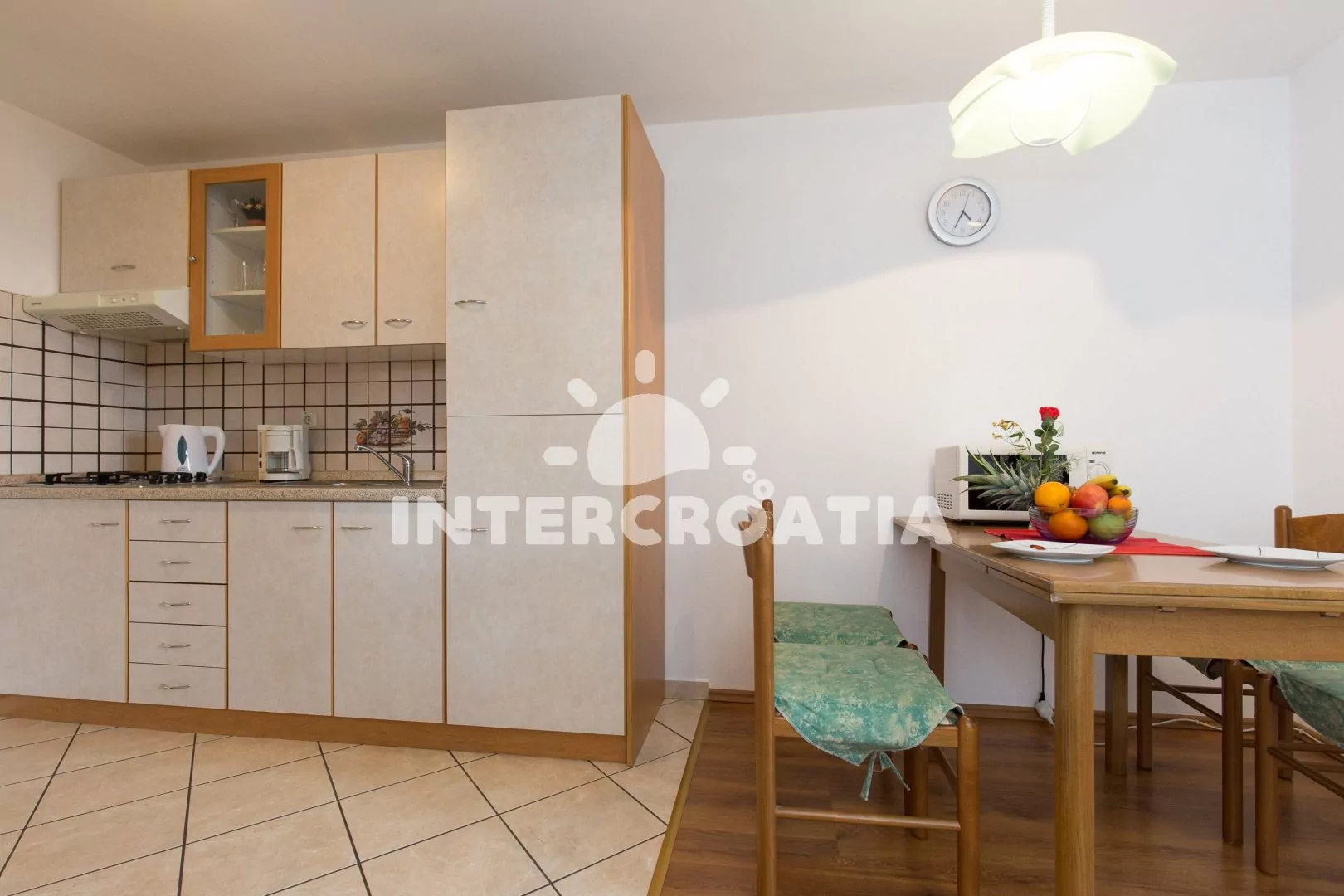 Apartmán (38 m2) s výhledem na moře a vlastní terasou, se nachází v přízemí domu a je vhodný pro 2 až 4 osoby. Obývací pokoj je spojený s kuchyní. Kuchyňská linka je vybavena varnou deskou, digestoří…
