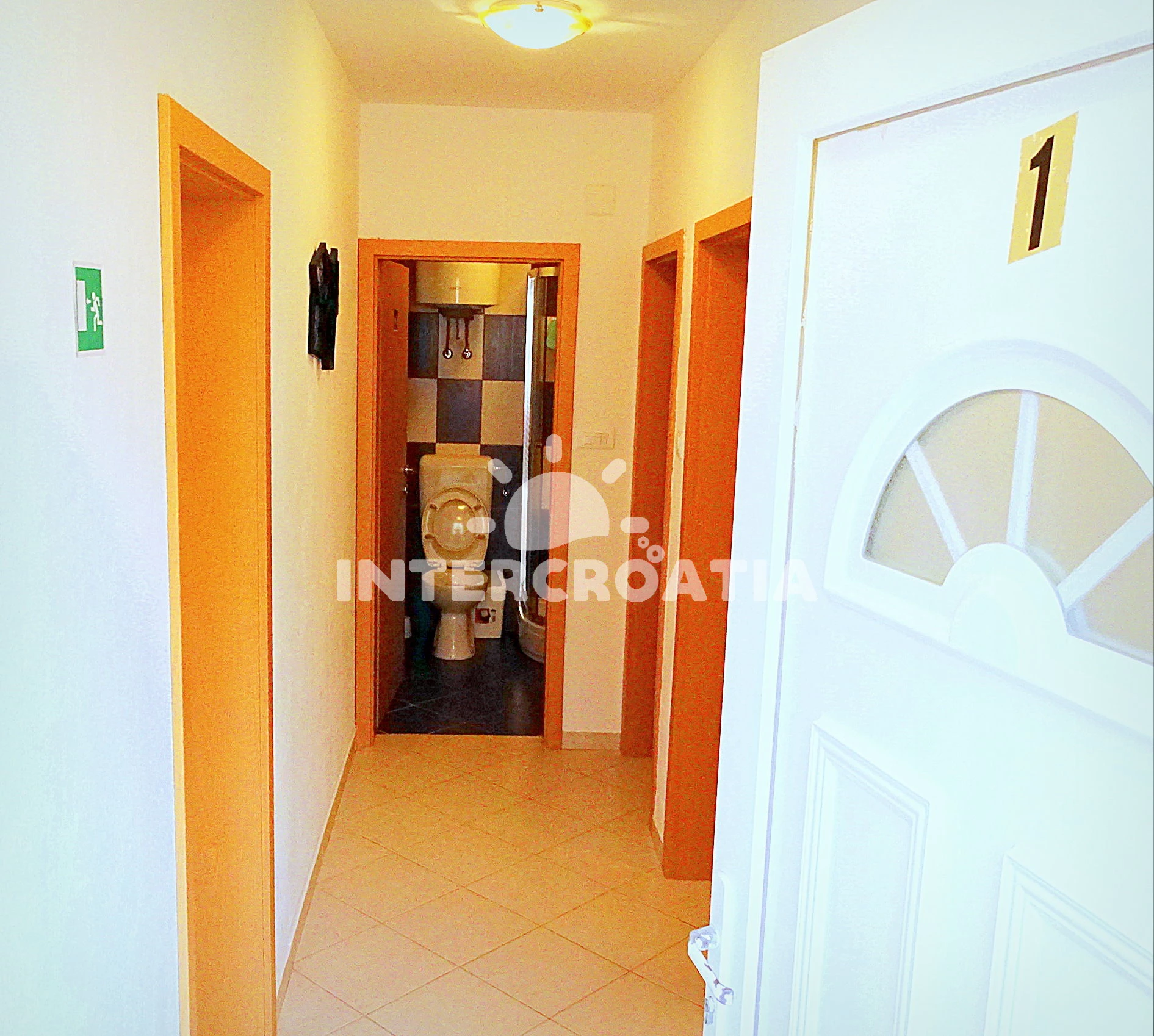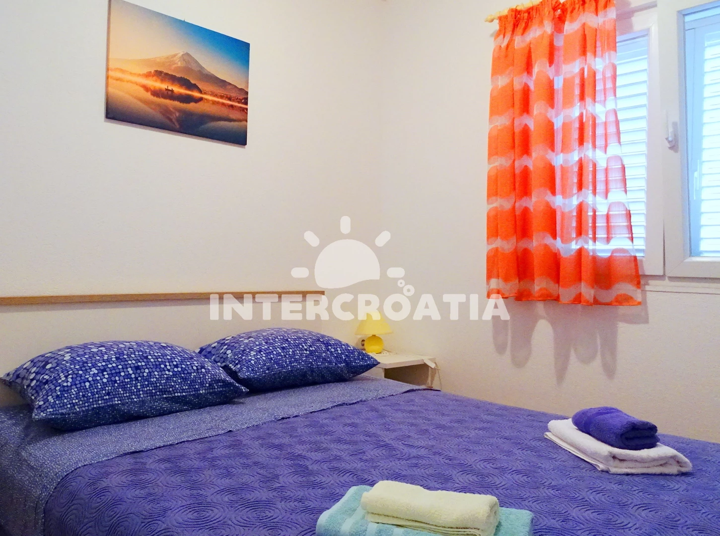 Apartmán (70 m2) s balkonem, a výhledem na moře. Nachází se ve 2. patře objektu. Apartmán má 2 ložnice a je vhodný pro až 6 osob. Kuchyňská linka je vybavena varnou deskou, troubou, rychlovarnou konvicí, nádobím, lednicí, mrazákem. V obývací místnosti je rozložitelná pohovka (extra lůžko pro 2 osoby). K dispozici televize, žehlička. První ložnice s dvoulůžkem. Druhá ložnice s dvoulůžkem. Koupelna se sprchovým koutem, umyvadlem, fénem a WC.