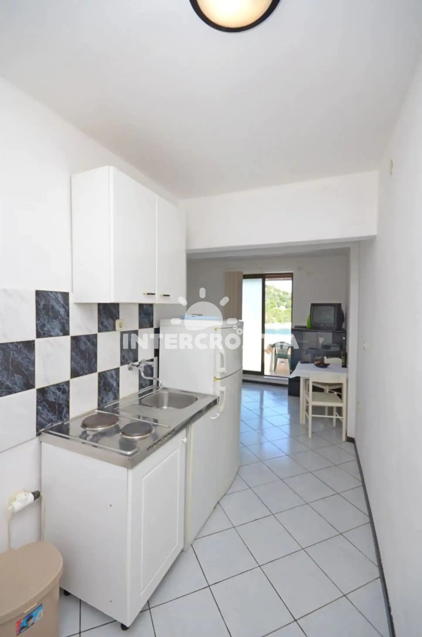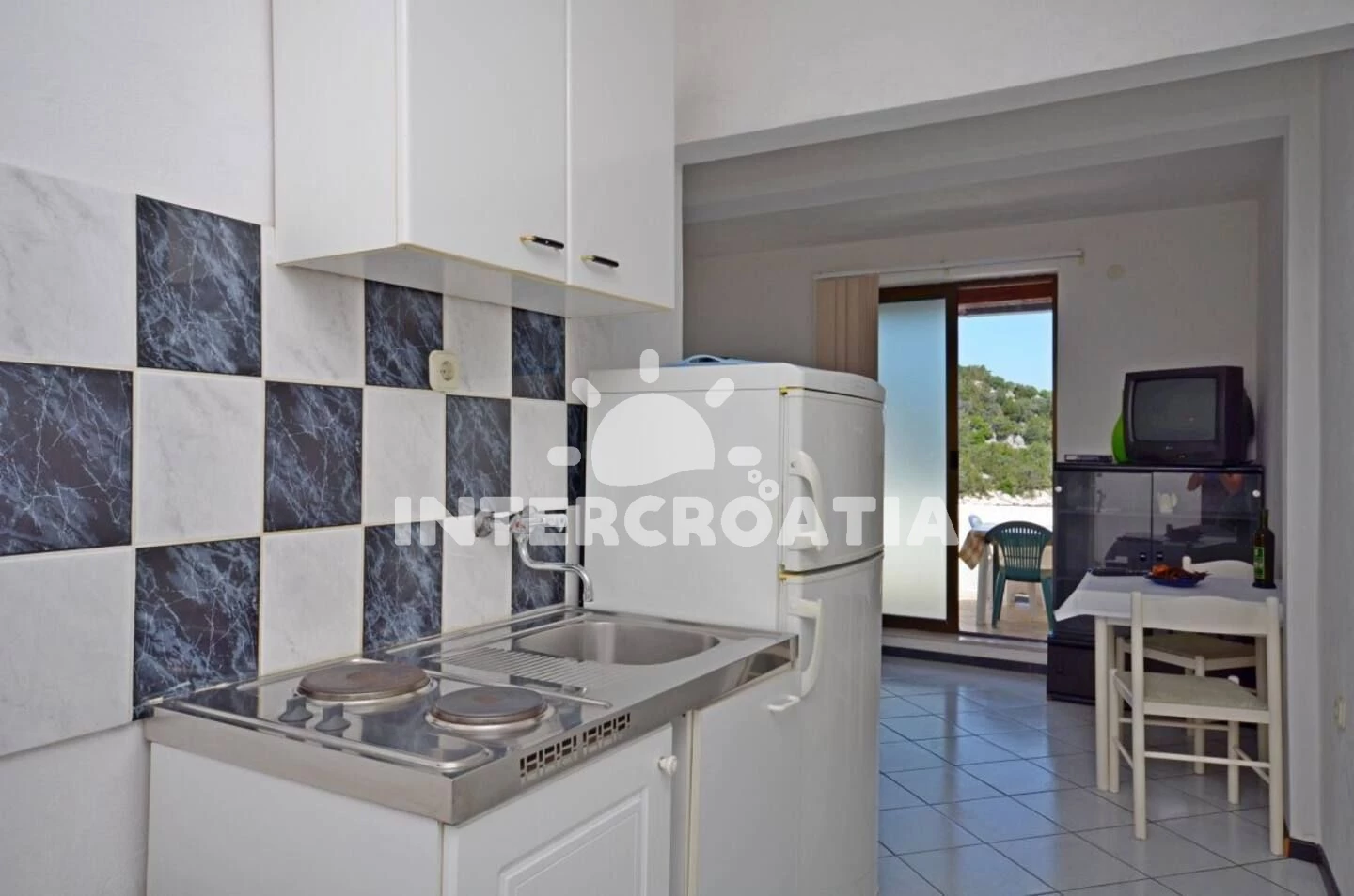 Vzdálenosti: restaurace 0 m, bar 0 m, Moře 10 m, pláž 10 m (betonové desky), kotviště pro čluny 10 m, centrum 50 m, potápění 150 m, ambulance 2,5 km, směnárna 2,5 km, lékárna 2,5 km, pošta 2,5 km, veřejná doprava 2,5 km, muzeum 2,5 km, půjčovna kol 2,5 km, supermarket 2,5 km, banka 2,5 km, čerpací stanice 11 km, trajekt 11 km,