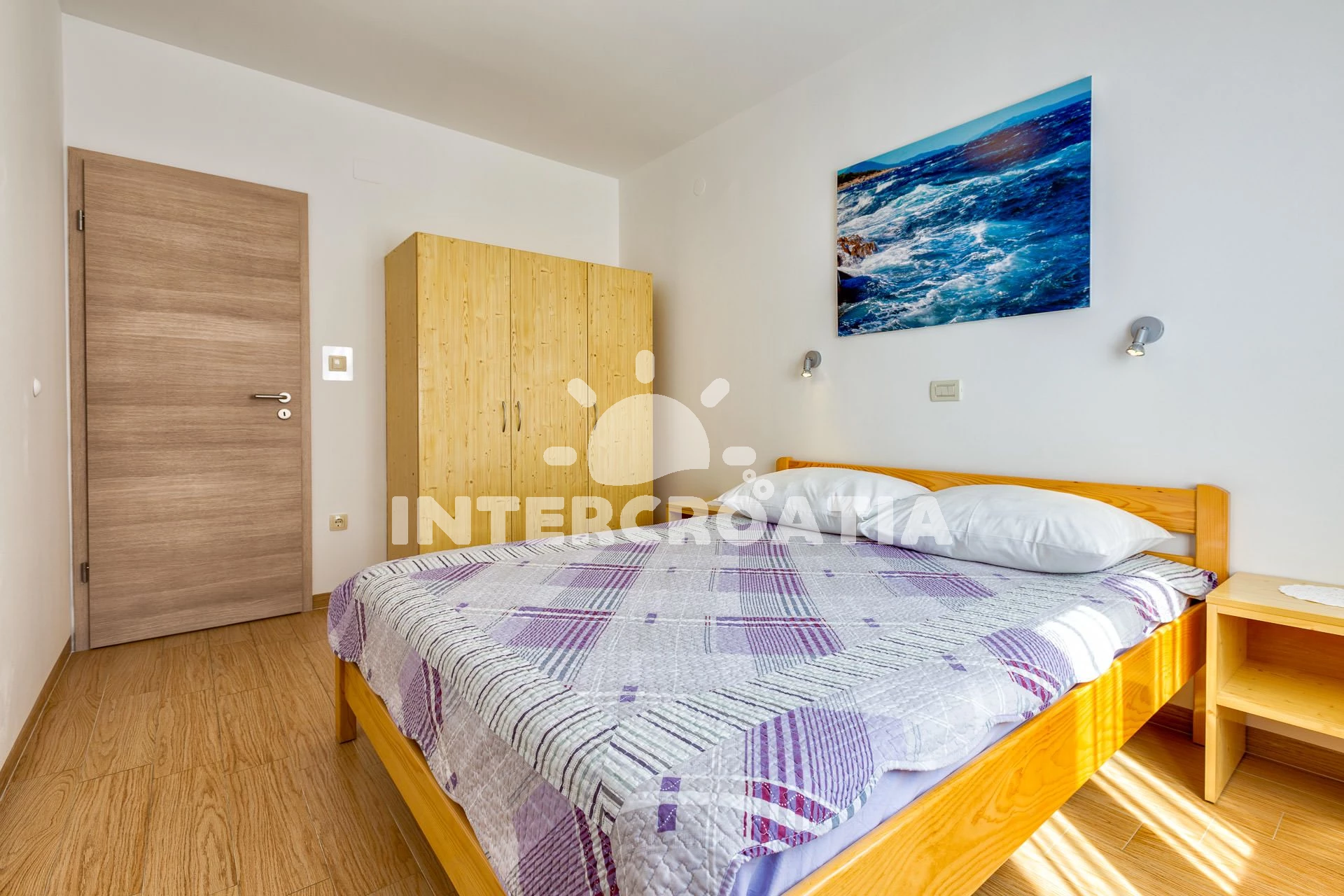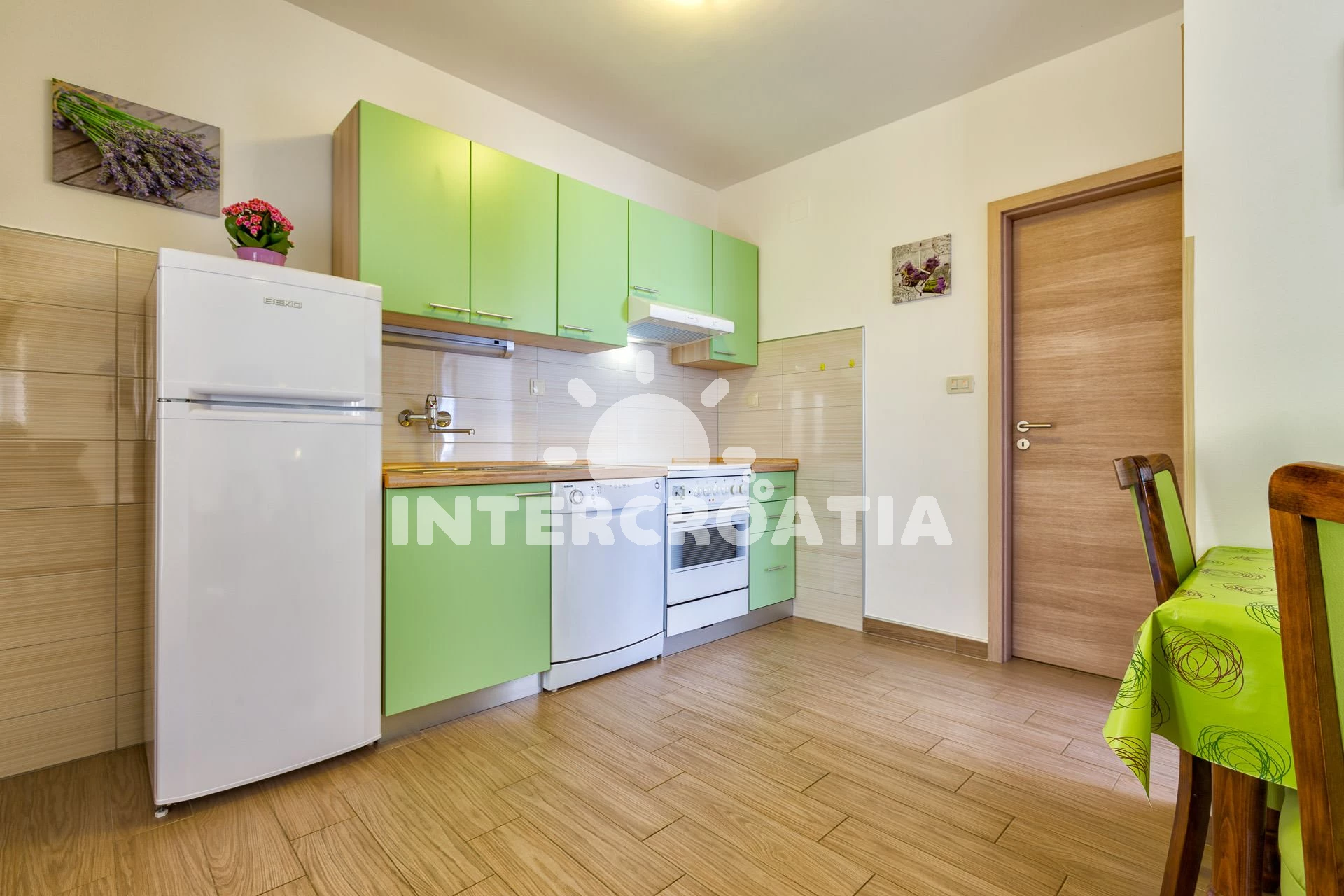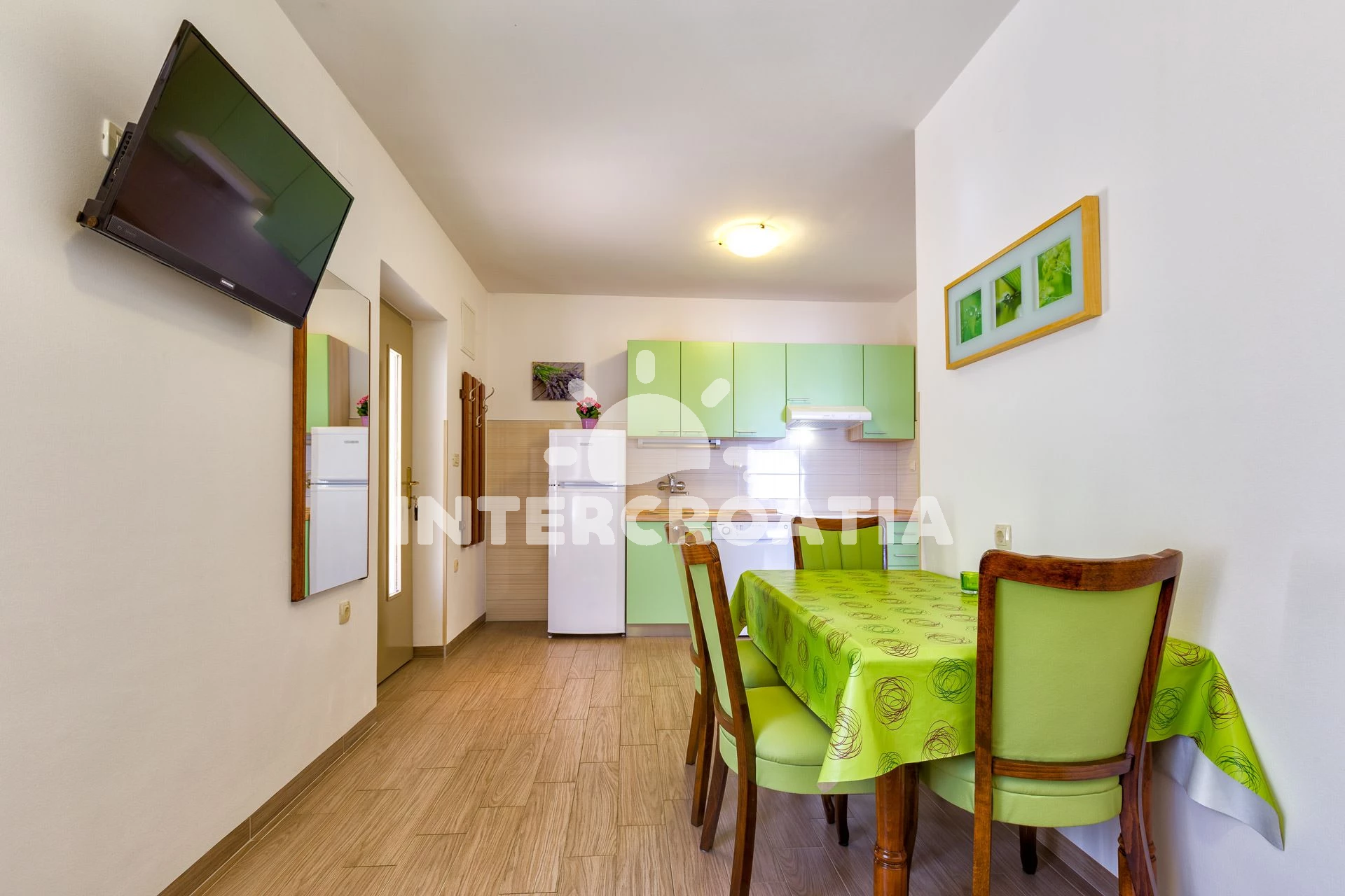 Apartmán se nachází 120 m od moře a pláže. Pláž je skalnatá, oblázková, větší kamení a betonové desky. Apartmán disponuje bazénem s lehátky pro ubytované hosty. U objektu je k dispozici společná zahrada s posezením a grilem. Parkování je před domem.