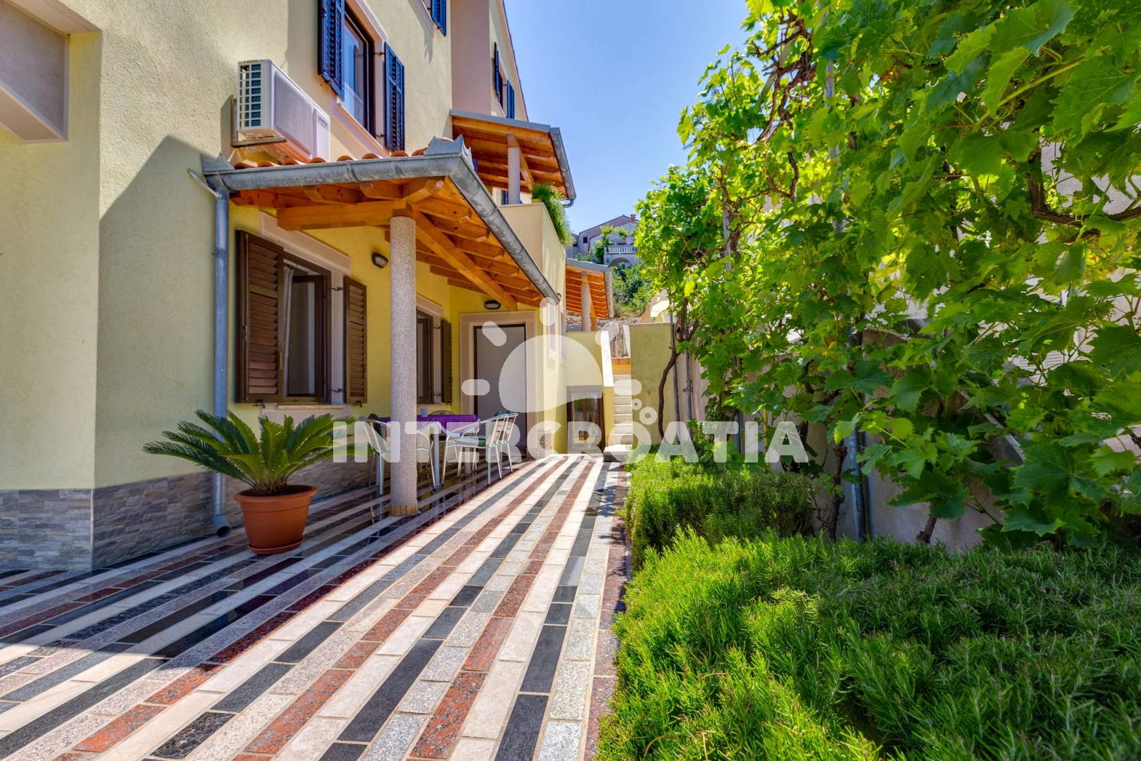 Apartmán se nachází 120 m od moře a pláže. Pláž je skalnatá, oblázková, větší kamení a betonové desky. Apartmán disponuje bazénem s lehátky pro ubytované hosty. U objektu je k dispozici společná zahrada s posezením a grilem. Parkování je před domem.