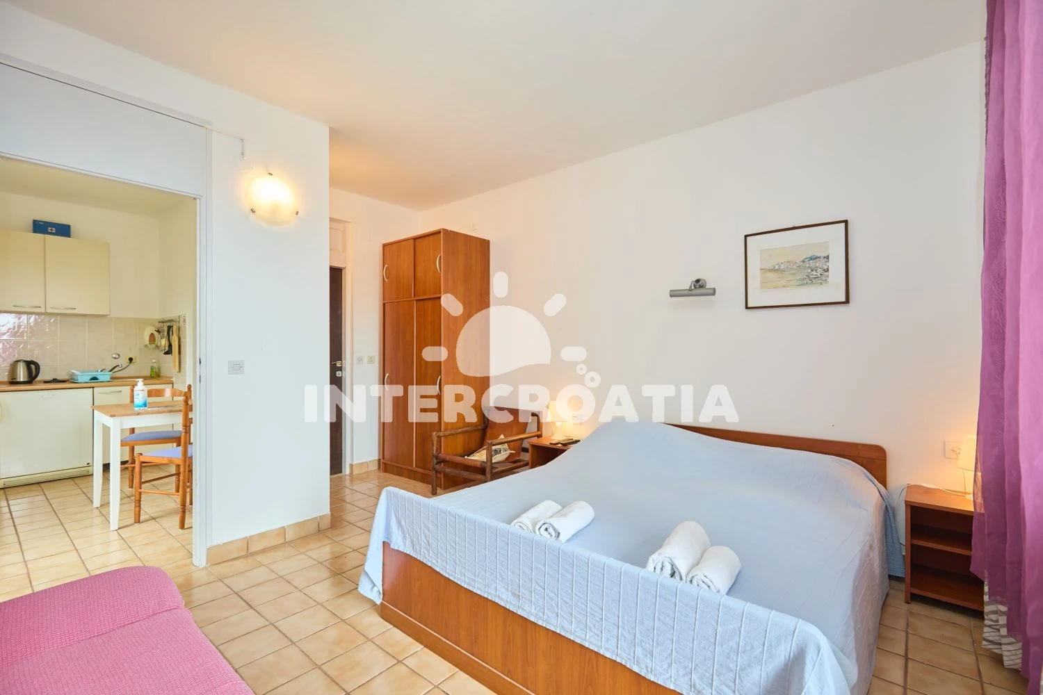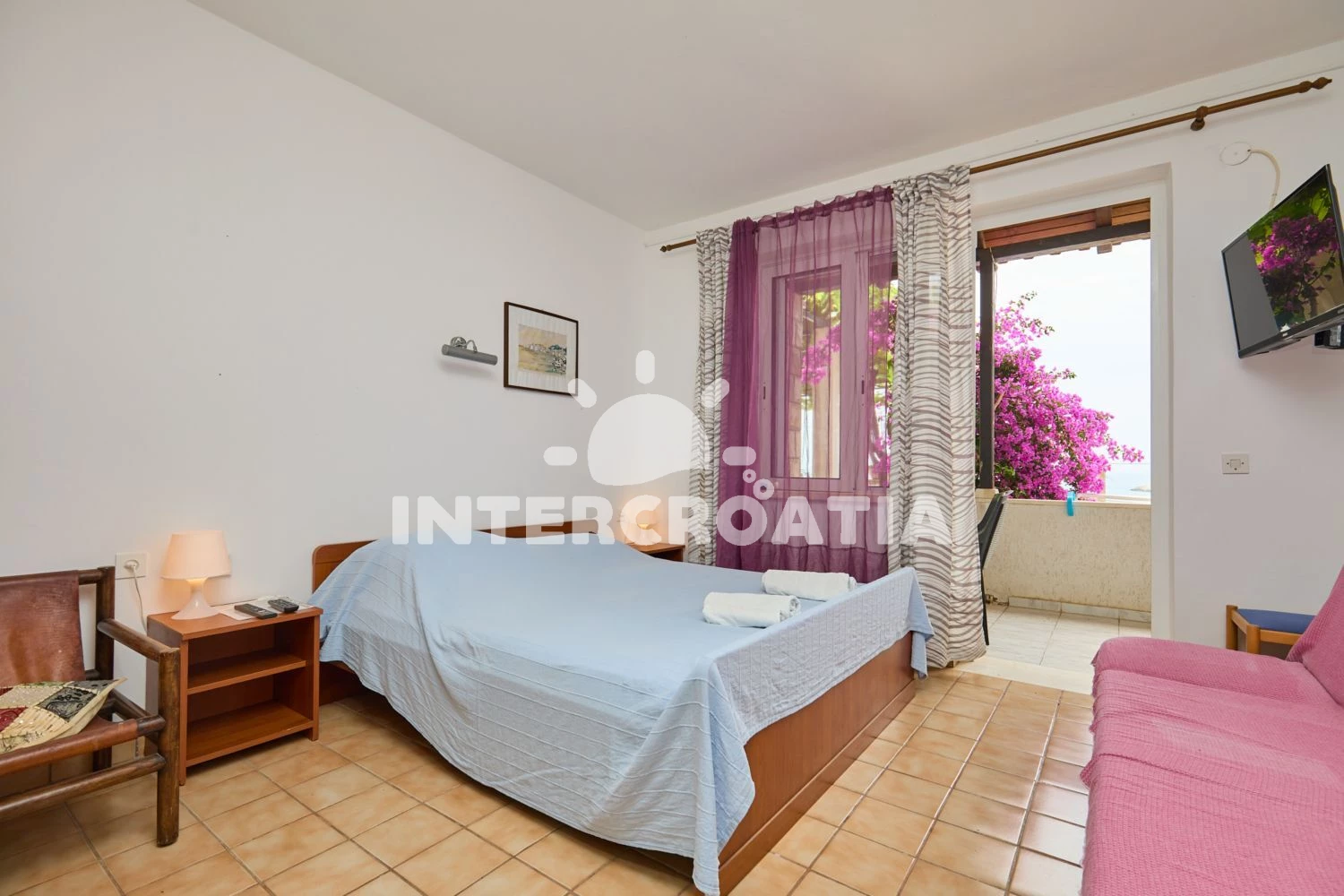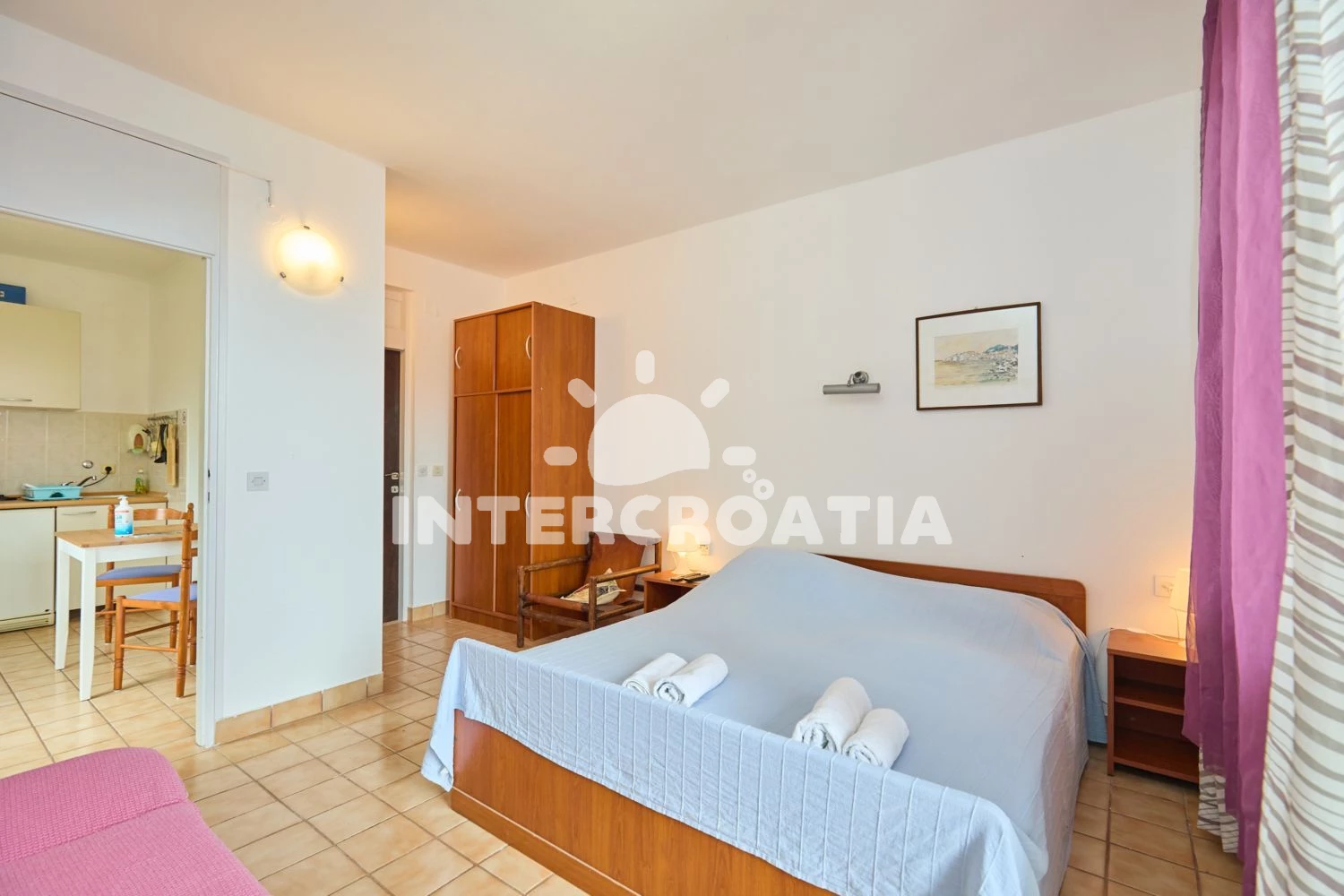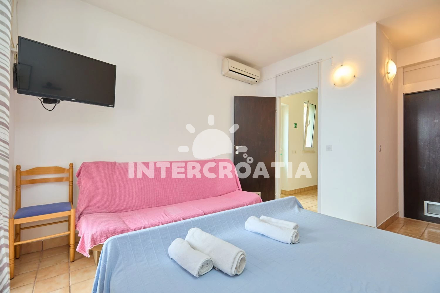 Apartmán (36 m2) s výhledem na moře. Nachází se v 1. patře objektu. Apartmán má 1 ložnici a je vhodný pro až 3 osoby. Kuchyňská linka je vybavena varnou deskou, toustovačem, rychlovarnou konvicí, nádobím, lednicí, mrazákem. K dispozici televize, žehlička. Ložnice s dvoulůžkem, přistýlkou. Koupelna se sprchovým koutem, umyvadlem, fénem a WC.