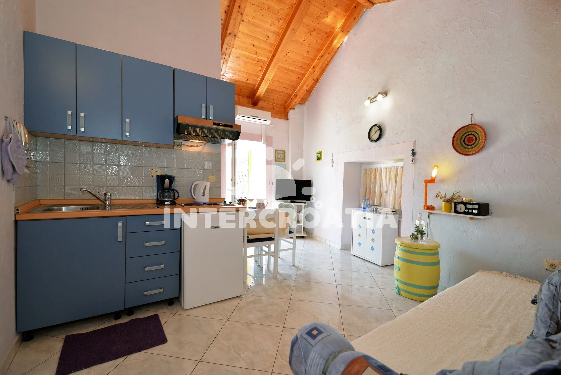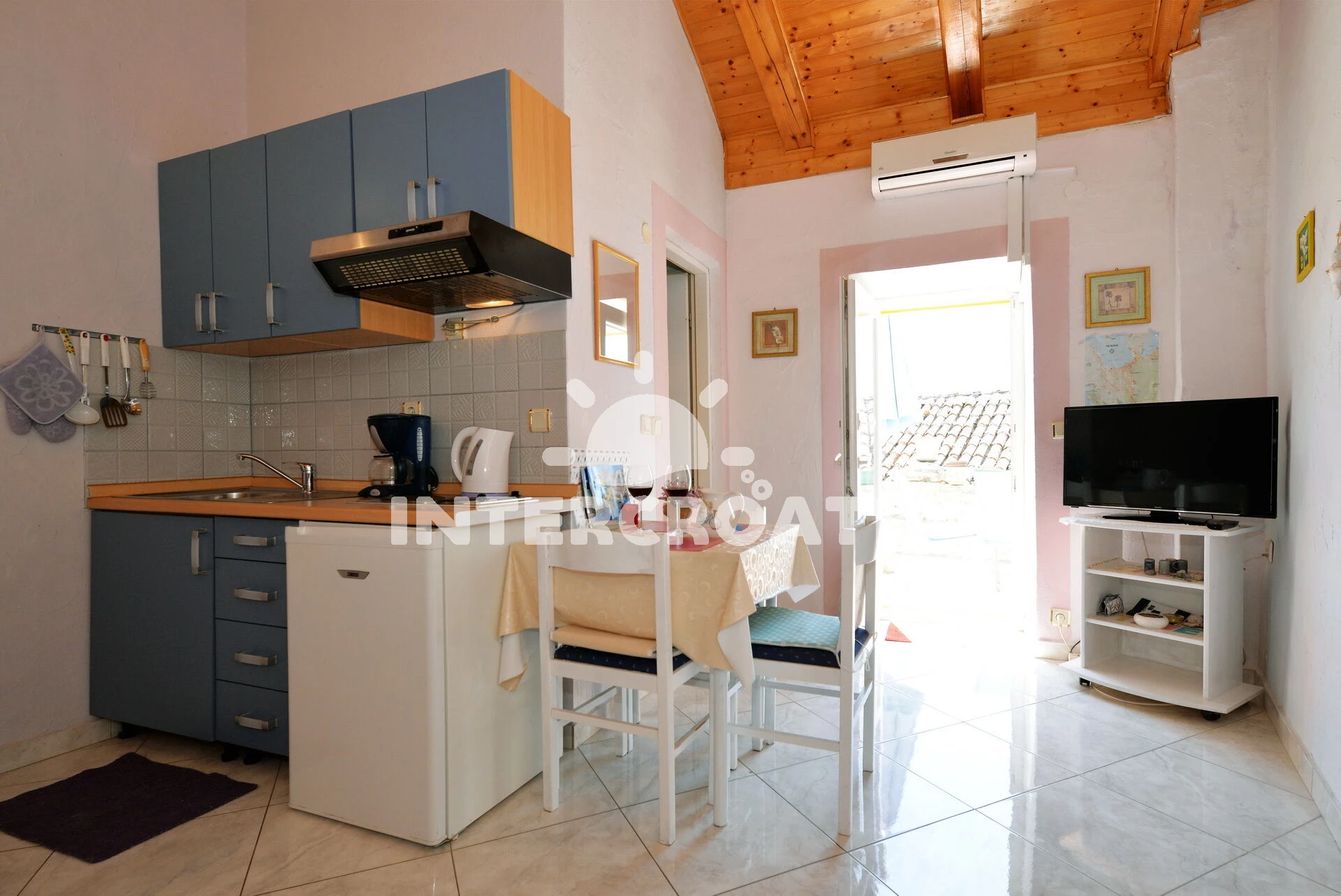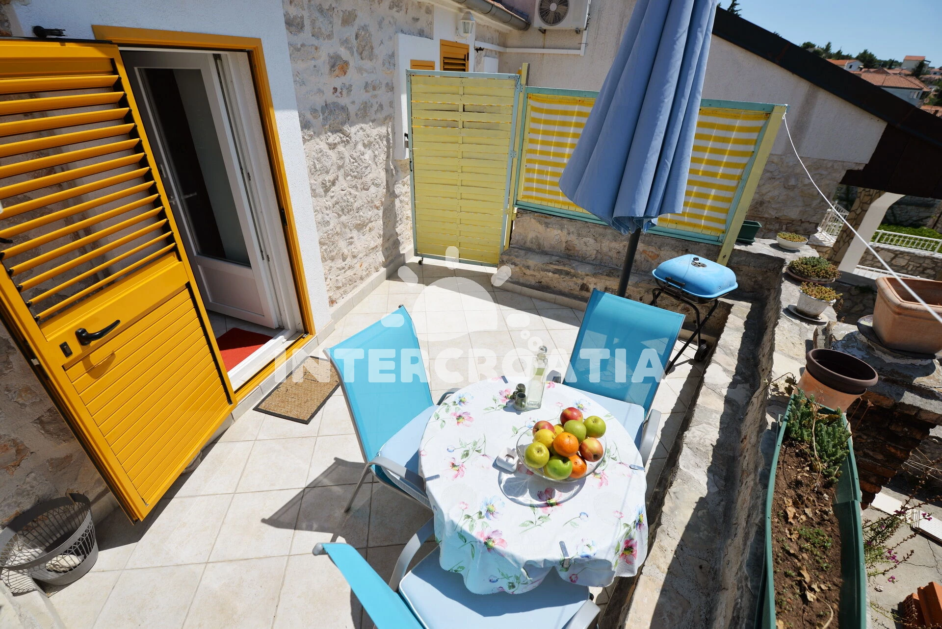 Vzdálenosti: Moře 600 m, pláž 850 m (písčitá a oblázková), restaurace 180 m, bar 200 m, supermarket 450 m, lékárna 650 m, ambulance 650 m, centrum 1,5 km, marina 2 km,