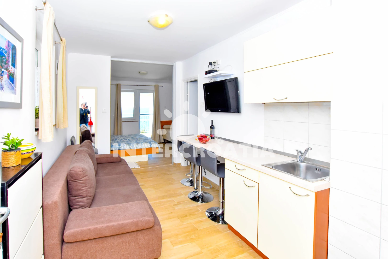 Apartmán (30 m2) s terasou, a výhledem na moře. Nachází se ve 2. patře objektu. Apartmán má 1 ložnici a je vhodný pro až 4 osoby. Kuchyňská linka je vybavena varnou deskou, kávovarem, toustovačem, nádobím, lednicí. V obývací místnosti je rozložitelná pohovka (extra lůžko pro 1 osobu). K dispozici televize se satelitním programem, žehlička. Ložnice s dvoulůžkem, přistýlkou. Koupelna se sprchovým koutem, umyvadlem, fénem a WC.