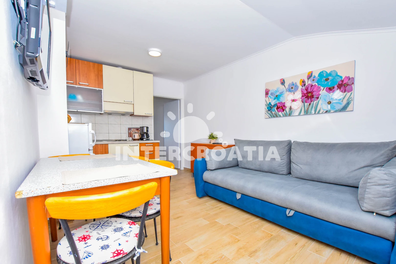 Apartmán (38 m2) s terasou, a výhledem na moře. Nachází se ve 2. patře objektu. Apartmán má 1 ložnici a je vhodný pro až 4 osoby. Kuchyňská linka je vybavena varnou deskou, kávovarem, toustovačem, rychlovarnou konvicí, nádobím, lednicí. V obývací místnosti je rozložitelná pohovka (extra lůžko pro 2 osoby). K dispozici televize se satelitním programem, žehlička. Ložnice s dvoulůžkem. Koupelna se sprchovým koutem, umyvadlem, fénem a WC.