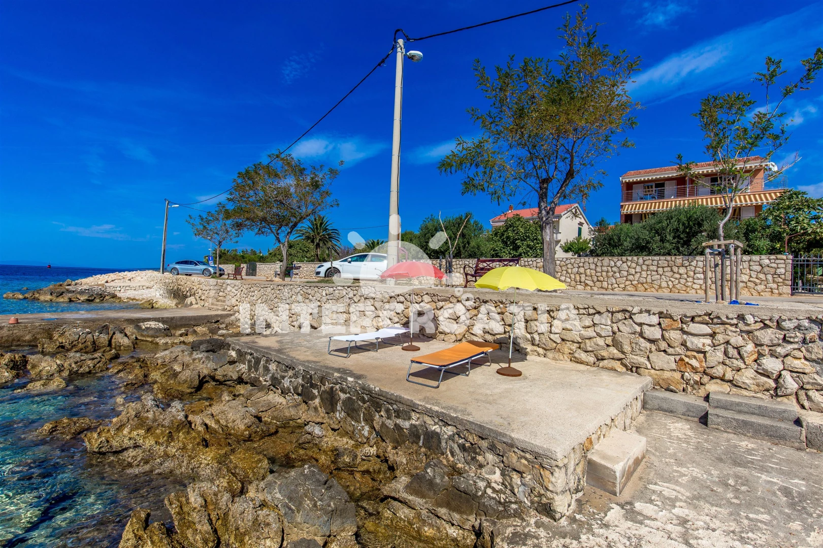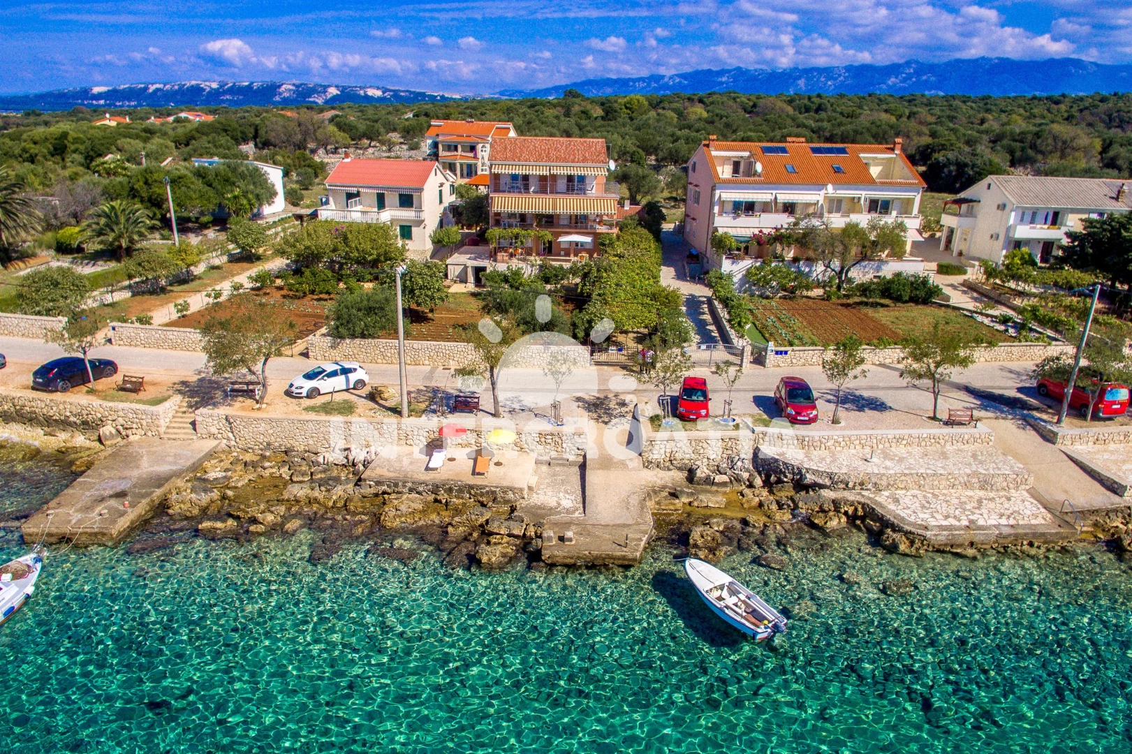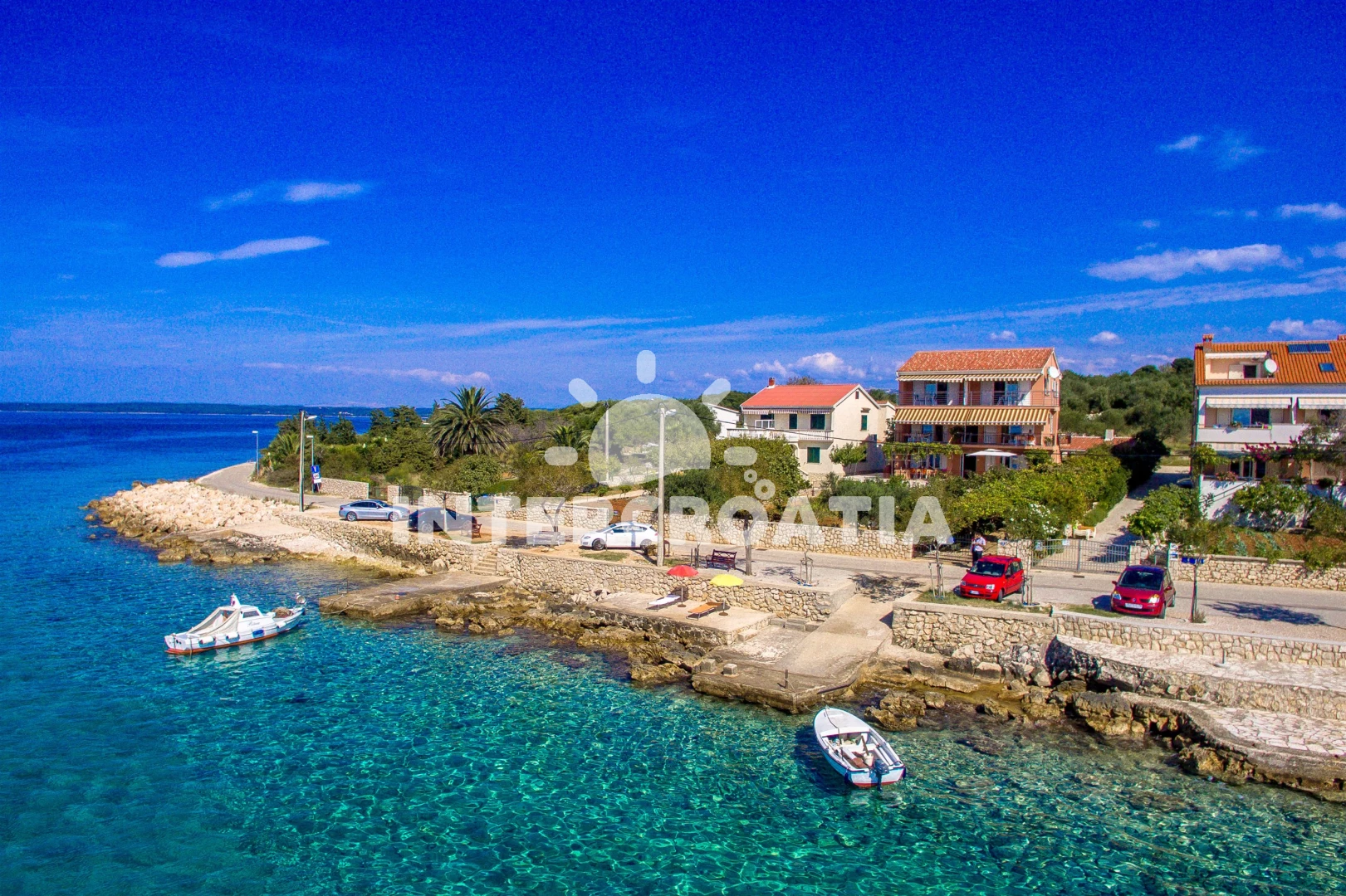 Vzdálenosti: Moře 15 m, pláž 15 m (skalnatá, oblázková, větší kamení a betonové desky), centrum 200 m, směnárna 200 m, restaurace 200 m, bar 200 m, kotviště pro čluny 200 m, supermarket 200 m, pošta 1 km, ambulance 20 km, lékárna 20 km, čerpací stanice 20 km, mini golf 20 km, banka 20 km, veřejná doprava 20 km, muzeum 20 km, diskotéka 20 km, potápění 20 km, tenisové kurty 20 km, trajekt (Žigljen) 25 km, letiště (Zadar) 60 km,