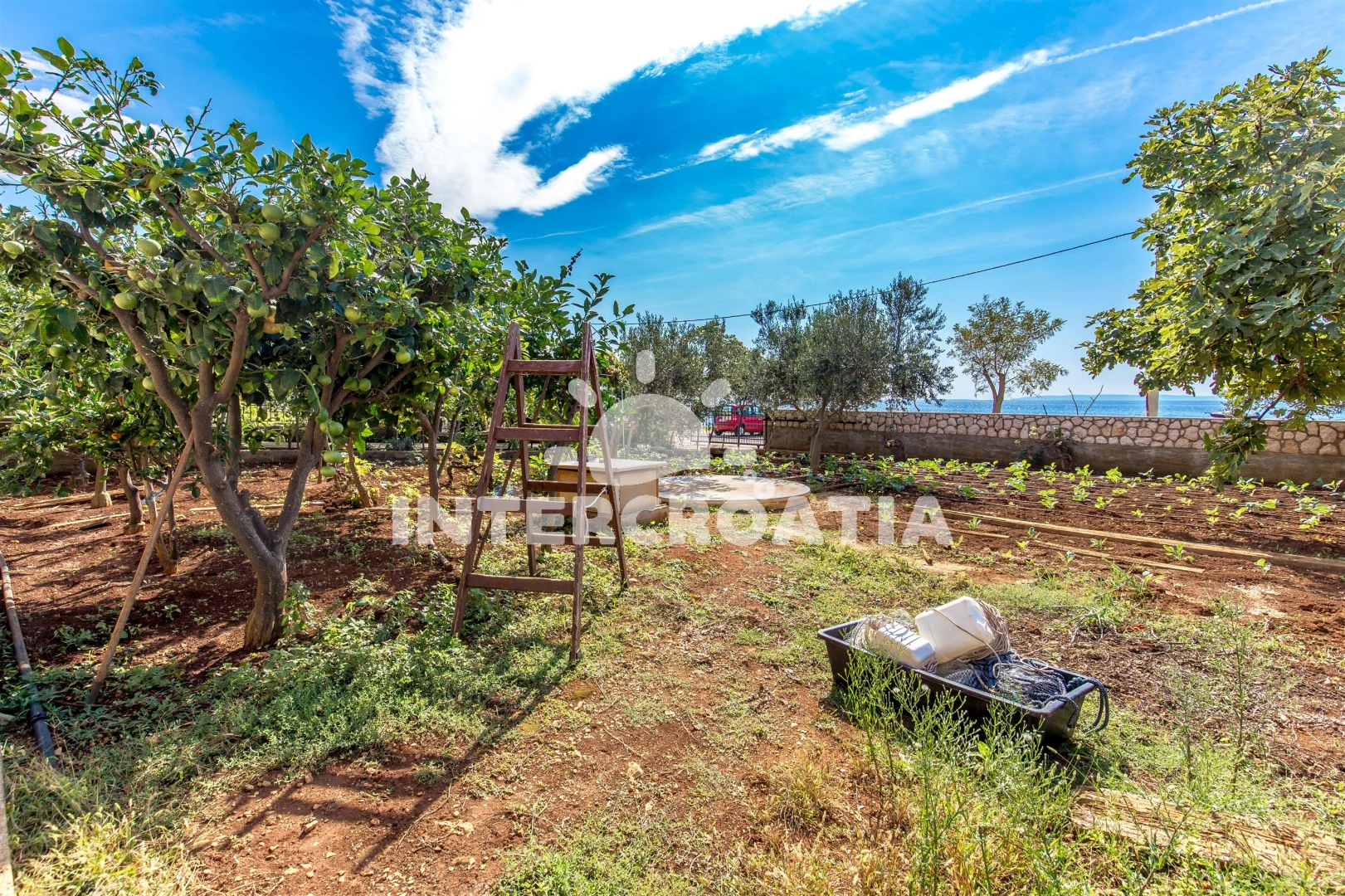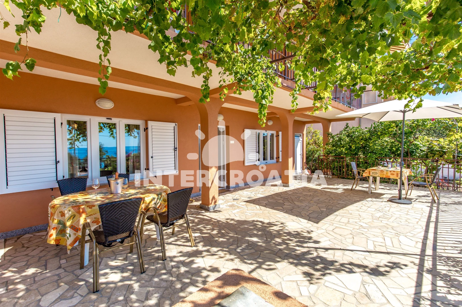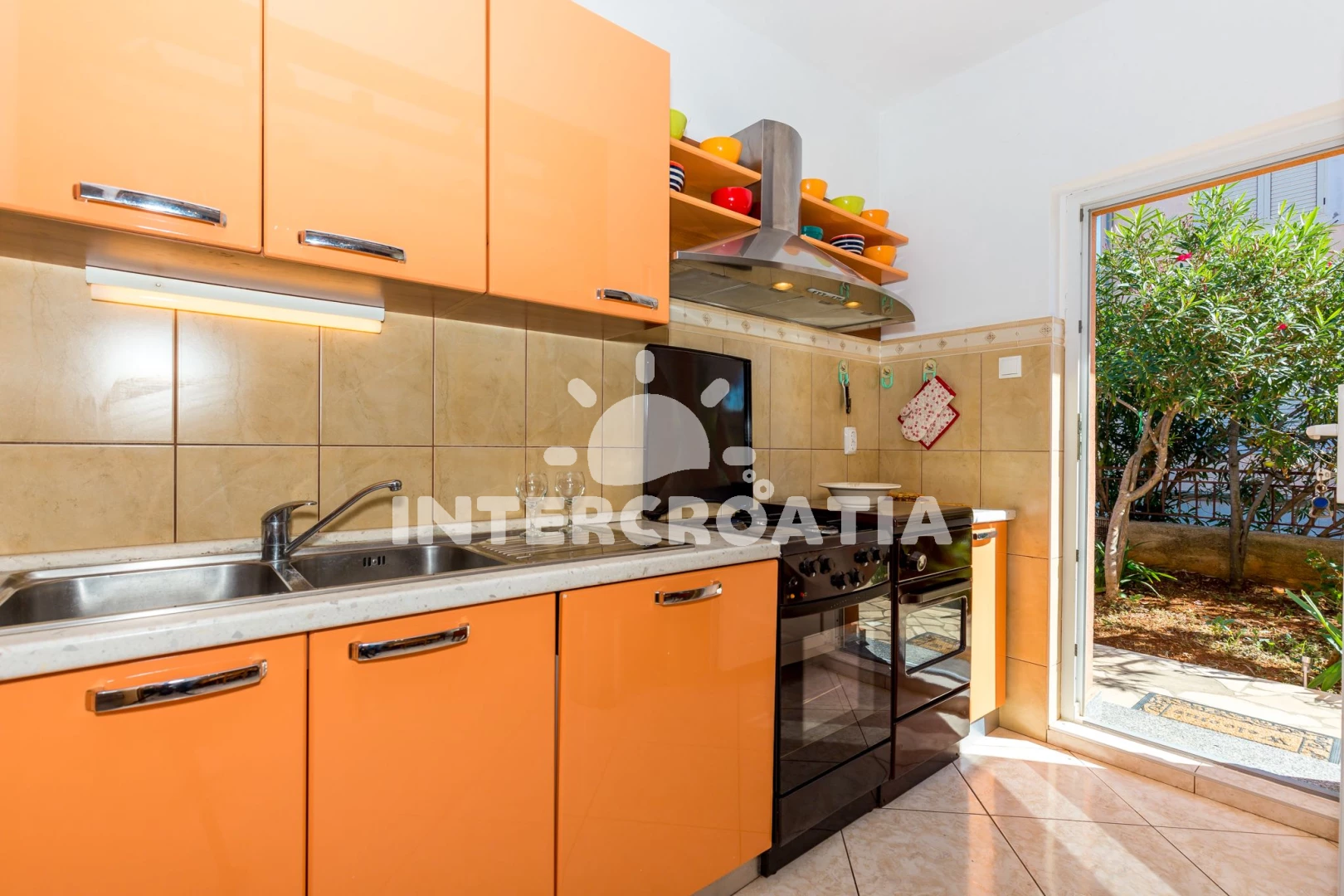 Apartmán se nachází 15 m od moře a pláže. Pláž je skalnatá, oblázková, větší kamení a betonové desky. U objektu je k dispozici společná zahrada s posezením a grilem.