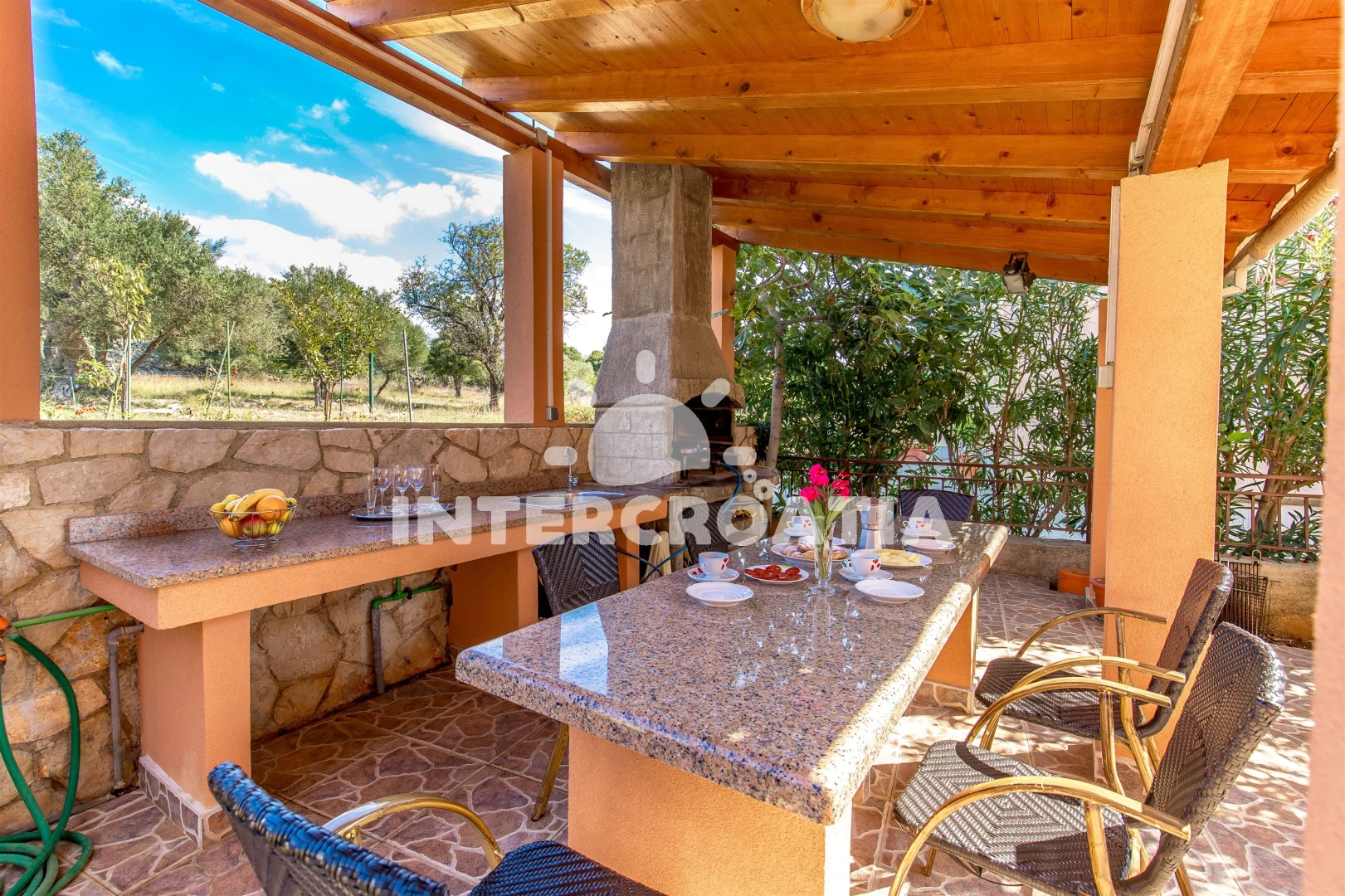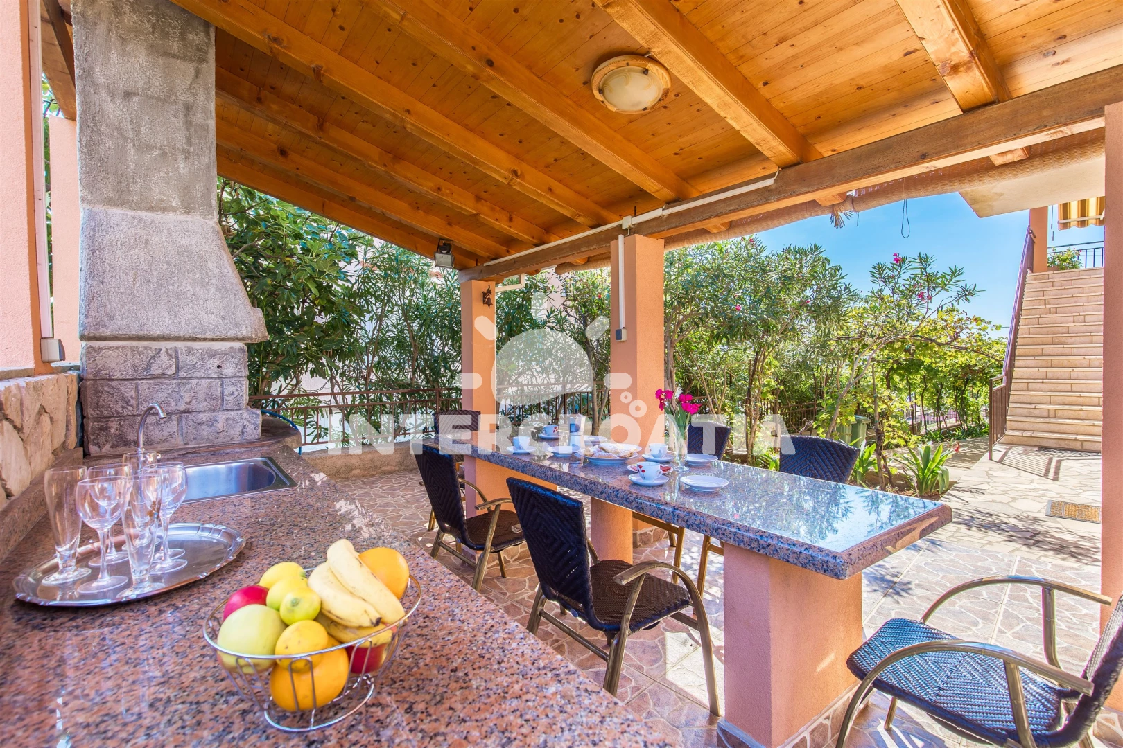 K bytu náleží velká soukromá terasa s venkovní sprchou, která je obzvláště příjemná po koupání nebo ochlazení. K dispozici je také masivní společný gril s dřezem, lednicí atd.