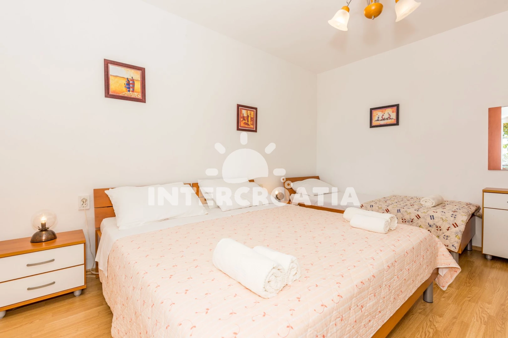 Apartmán (2) s terasou. Nachází se v objektu. Apartmán má 3 ložnice a je vhodný pro až 4 osoby. Kuchyňská linka je vybavena varnou deskou, troubou, kávovarem, myčkou na nádobí, mikrovlnnou troubou, nádobím, lednicí, mrazákem. V obývací místnosti je rozložitelná pohovka (extra lůžko pro osoby). K dispozici televize. První ložnice s dvoulůžky, přistýlkami. Druhá ložnice s dvoulůžkem. Třetí ložnice s dvoulůžky.