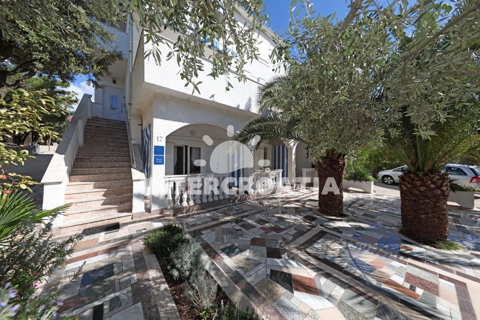 Třípodlažní apartmánový dům s balkonem, v klidné čtvrti letoviska Mandre a dobrou dostupností na pláž i do centra.