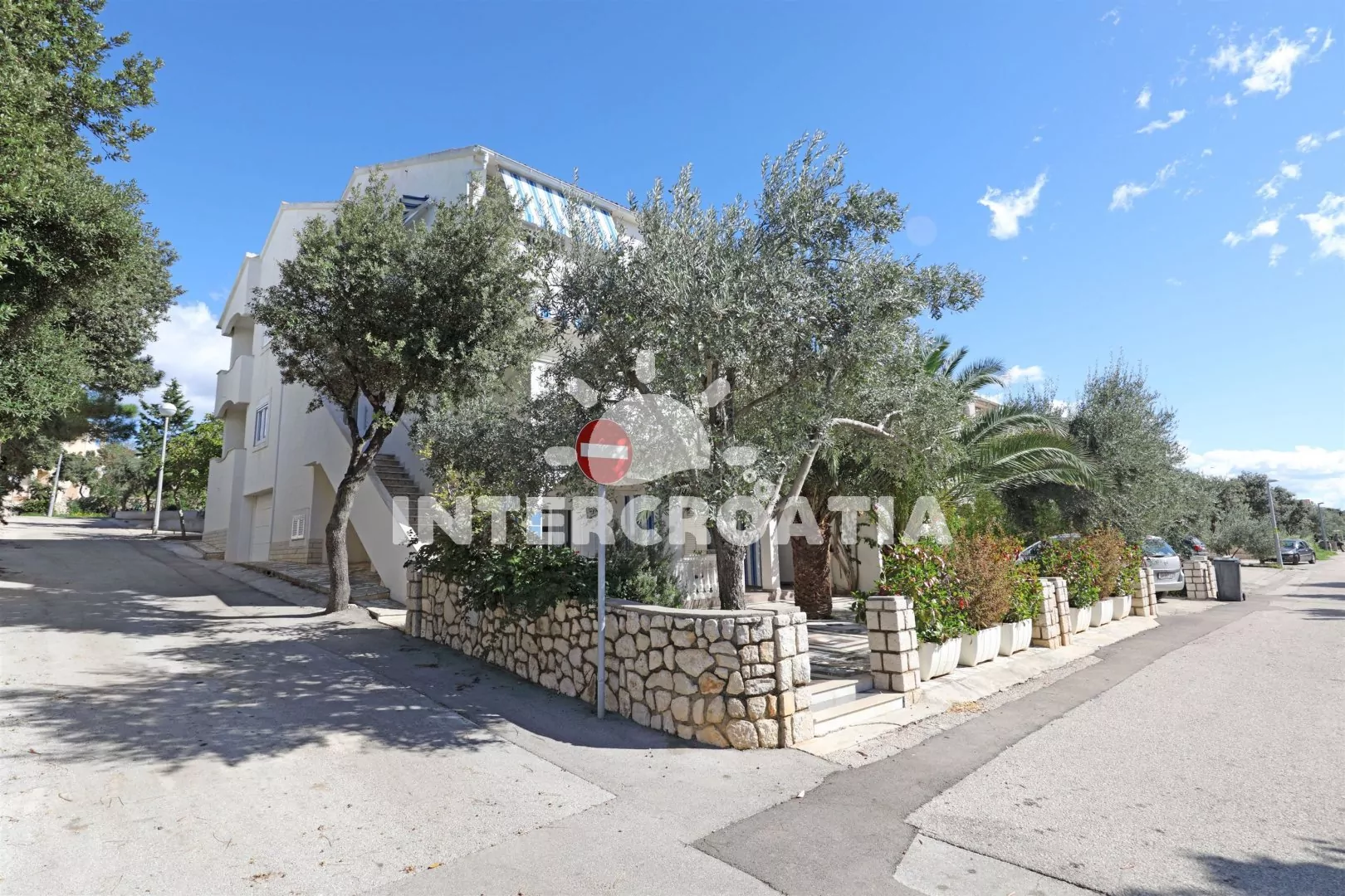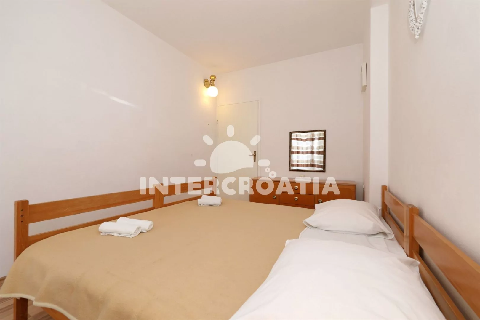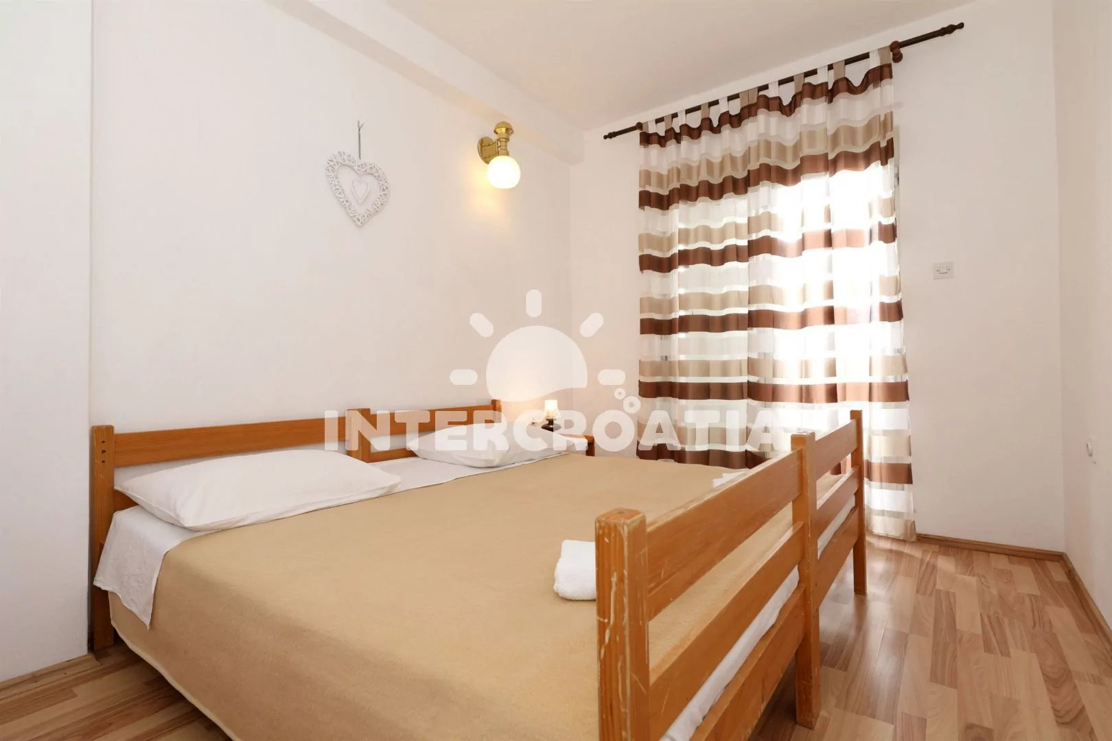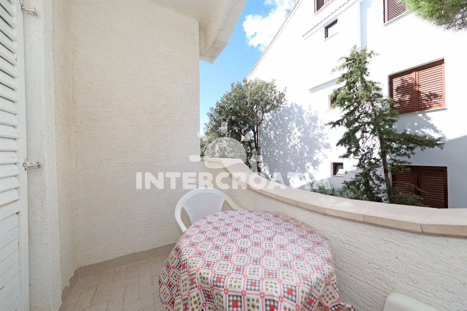 Patrový apartmánový dům s balkonem, v klidné čtvrti letoviska Mandre a dobrou dostupností na pláž i do centra.