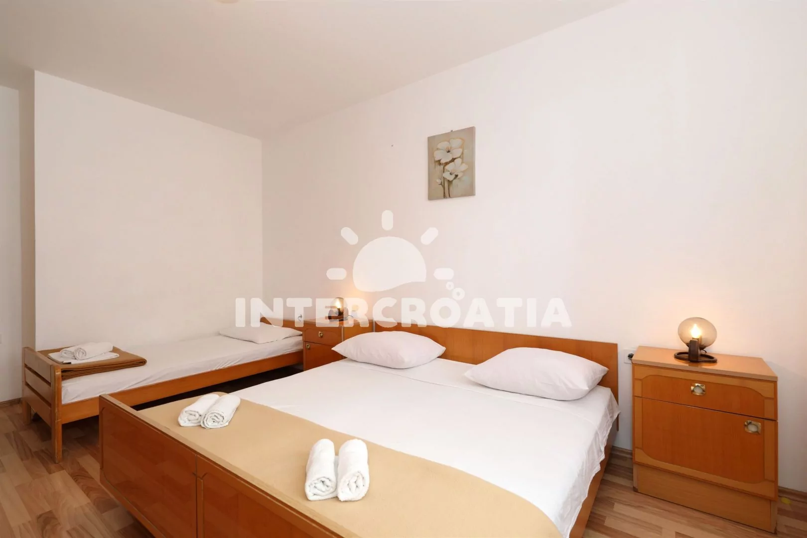 Prostorný třípokojový apartmán se dvěma ložnicemi a balkonem, nacházející se v přízemí. Vstup, obývací místnost spojená s kuchyní. Kuchyňská linka se sporákem, lednicí s mrazákem, kávovarem, rychlovarnou konvicí a nádobím. V obývací místnosti jídelní stůl pro 4 osoby a televize se satelitem. První ložnice s dvoulůžkem. Druhá ložnice s dvoulůžkem a jedním jednolůžkem. Koupelna se sprchovým koutem, umyvadlem a wc. Hosté mají k dispozici balkon s posezením a v zahradě společný gril. Parkování u objektu.