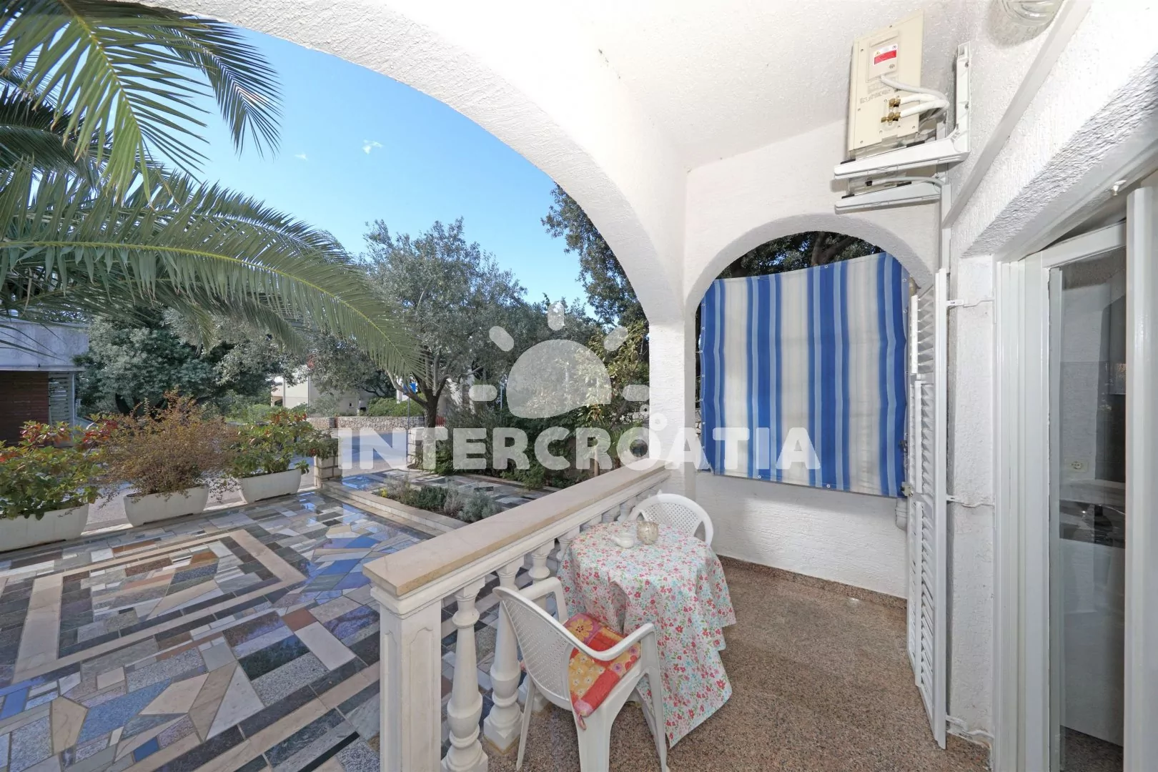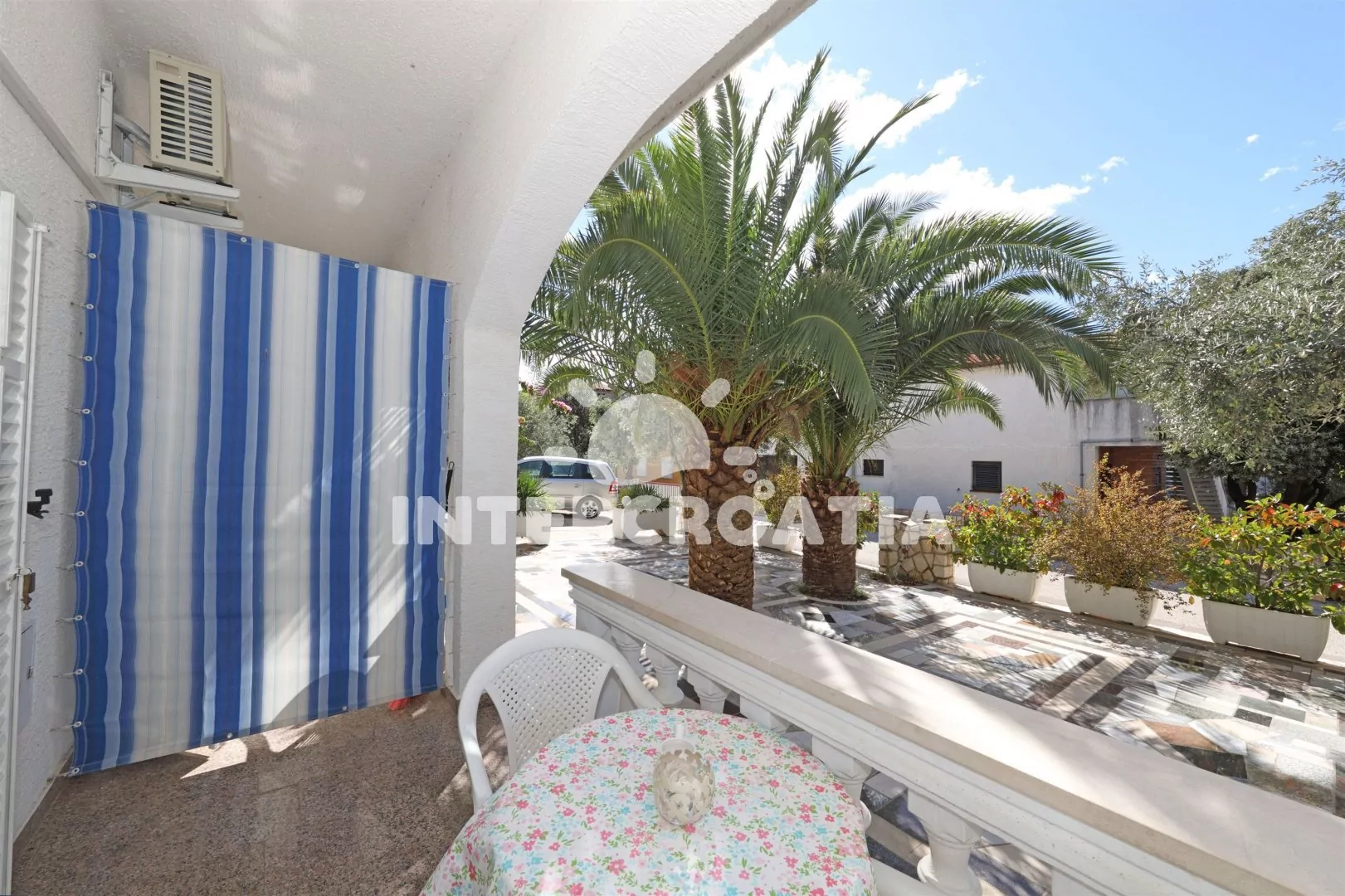 Patrový apartmánový dům s balkonem, v klidné čtvrti letoviska Mandre a dobrou dostupností na pláž i do centra.