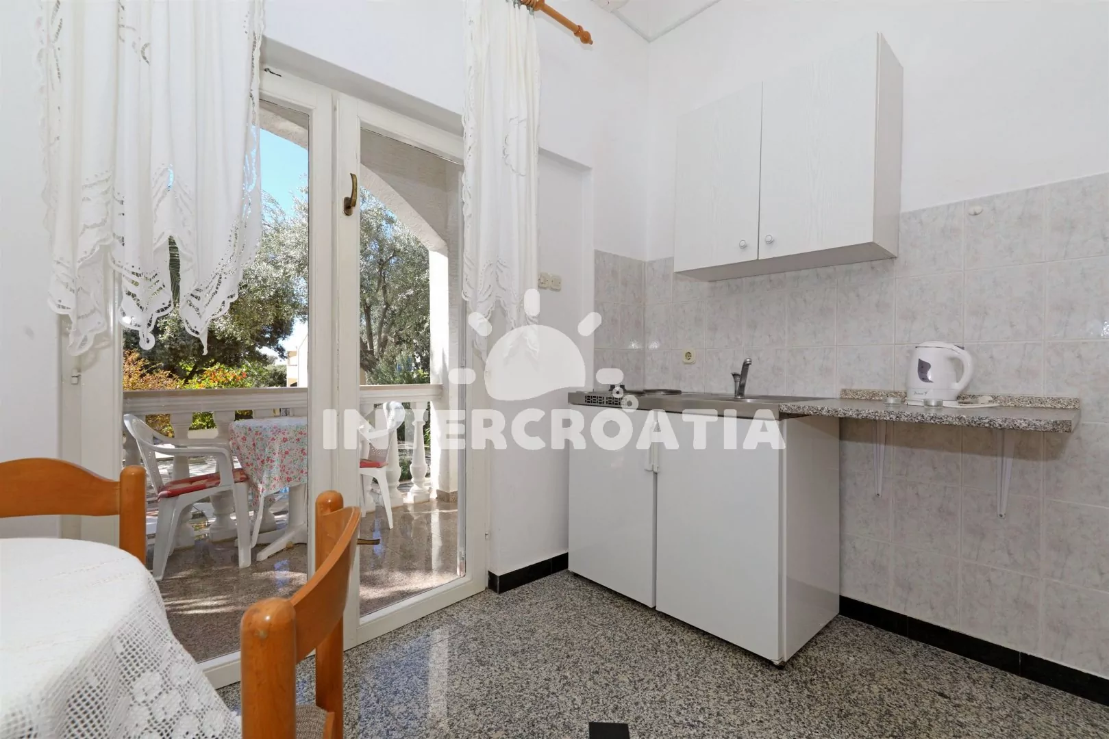 Studiový apartmán s balkonem, nacházející se v přízemí. Vstup, obývací místnost spojená s kuchyní. Kuchyňská linka s dvouplotýnkovým elektrickým vařičem, lednicí s mrazákem, rychlovarnou konvicí a…