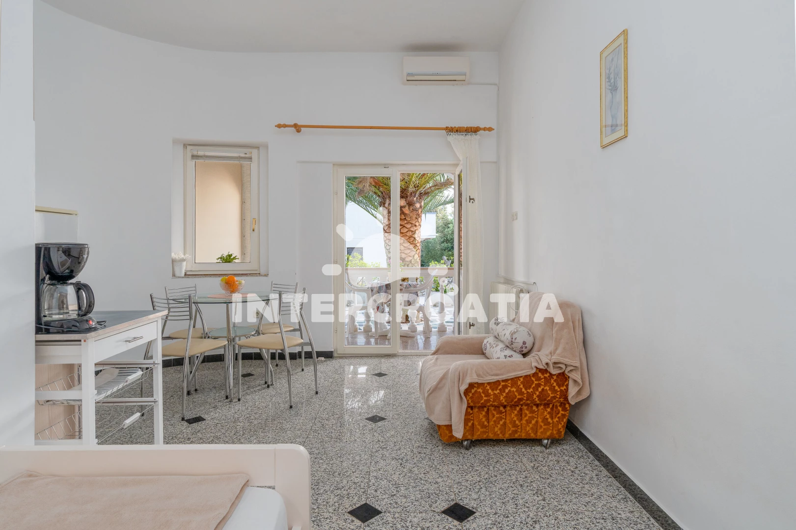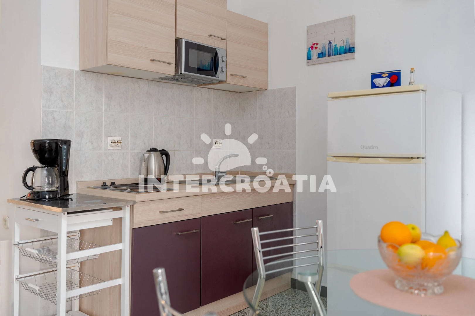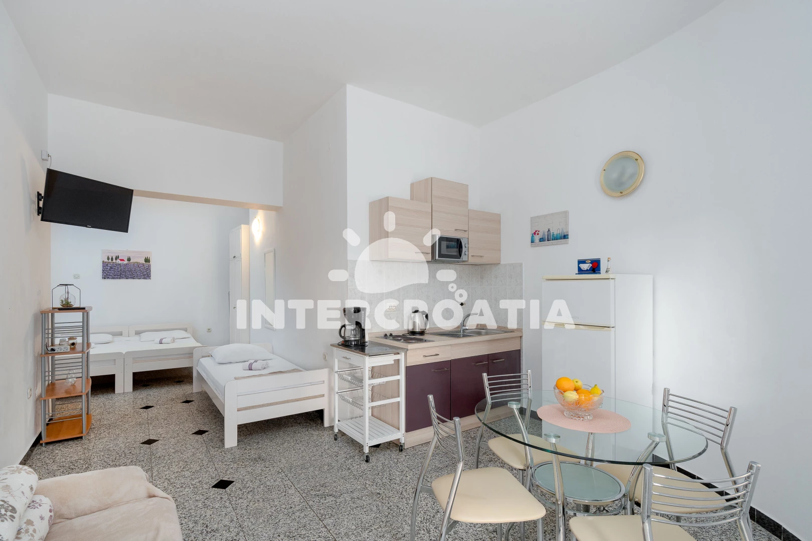 Útulný studiový apartmán s balkonem, nacházející se v přízemí. Vstup, obývací místnost spojená s kuchyní. Kuchyňská linka s dvouplotýnkovým elektrickým vařičem, lednicí s mrazákem, rychlovarnou…