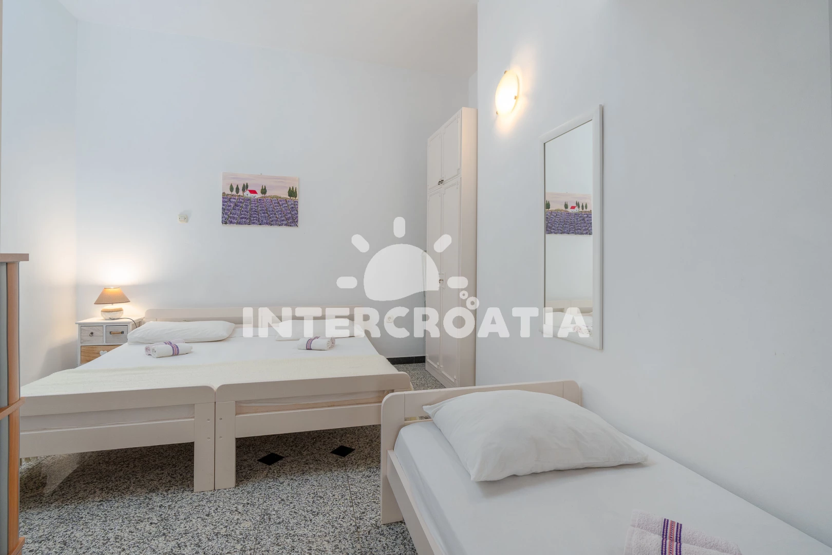 Patrový apartmánový dům s balkonem, v klidné čtvrti letoviska Mandre a dobrou dostupností na pláž i do centra.