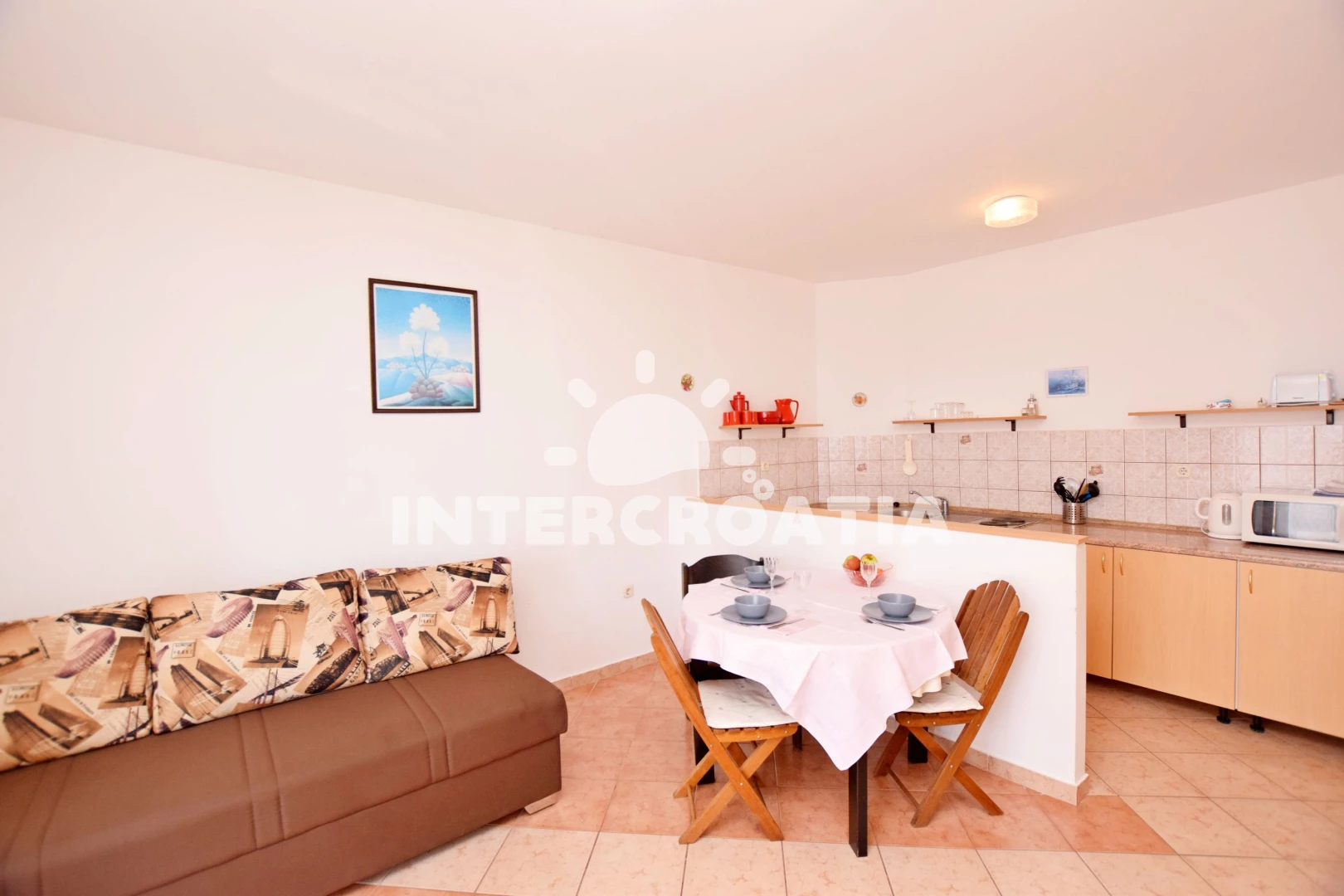 Apartmán (50 m2) s balkonem, a výhledem na moře. Nachází se v 1. patře objektu. Apartmán má 1 ložnici a je vhodný pro až 4 osoby. Kuchyňská linka je vybavena varnou deskou, kávovarem, toustovačem, mikrovlnnou troubou, rychlovarnou konvicí, nádobím, lednicí, mrazákem. V obývací místnosti je rozložitelná pohovka (extra lůžko pro 2 osoby). K dispozici televize se satelitním programem, žehlička. Koupelna se sprchovým koutem, umyvadlem, WC.
