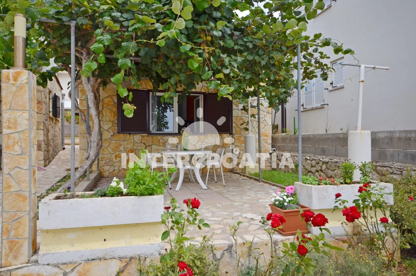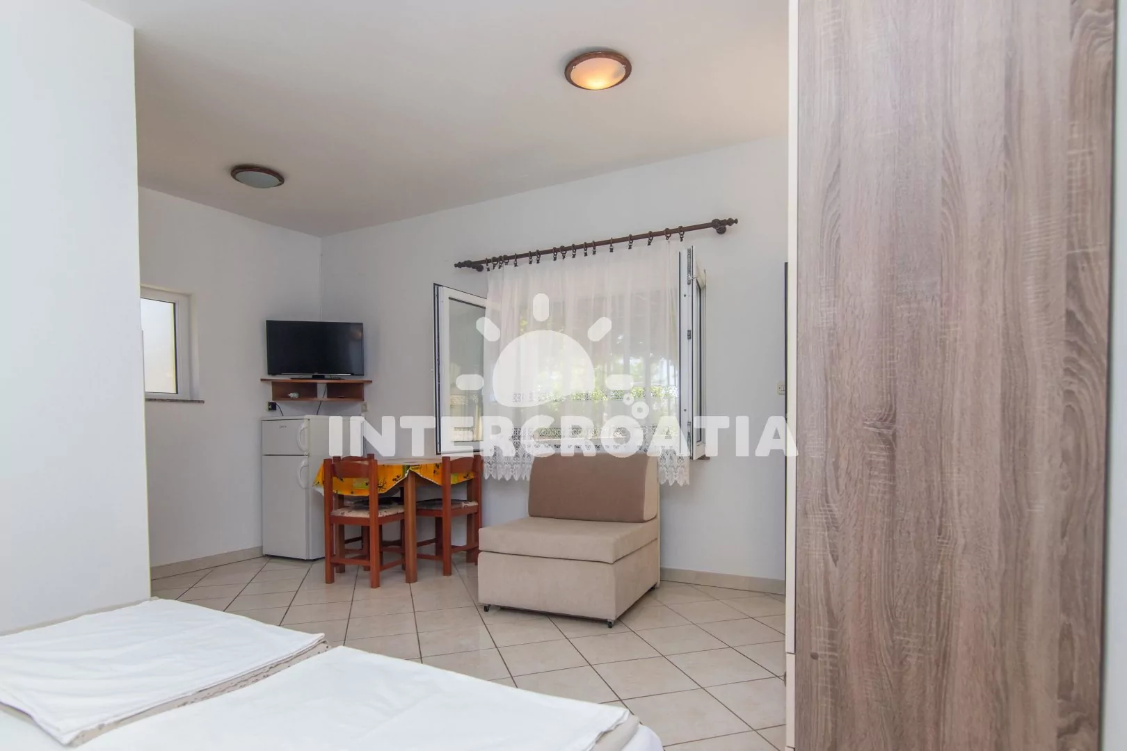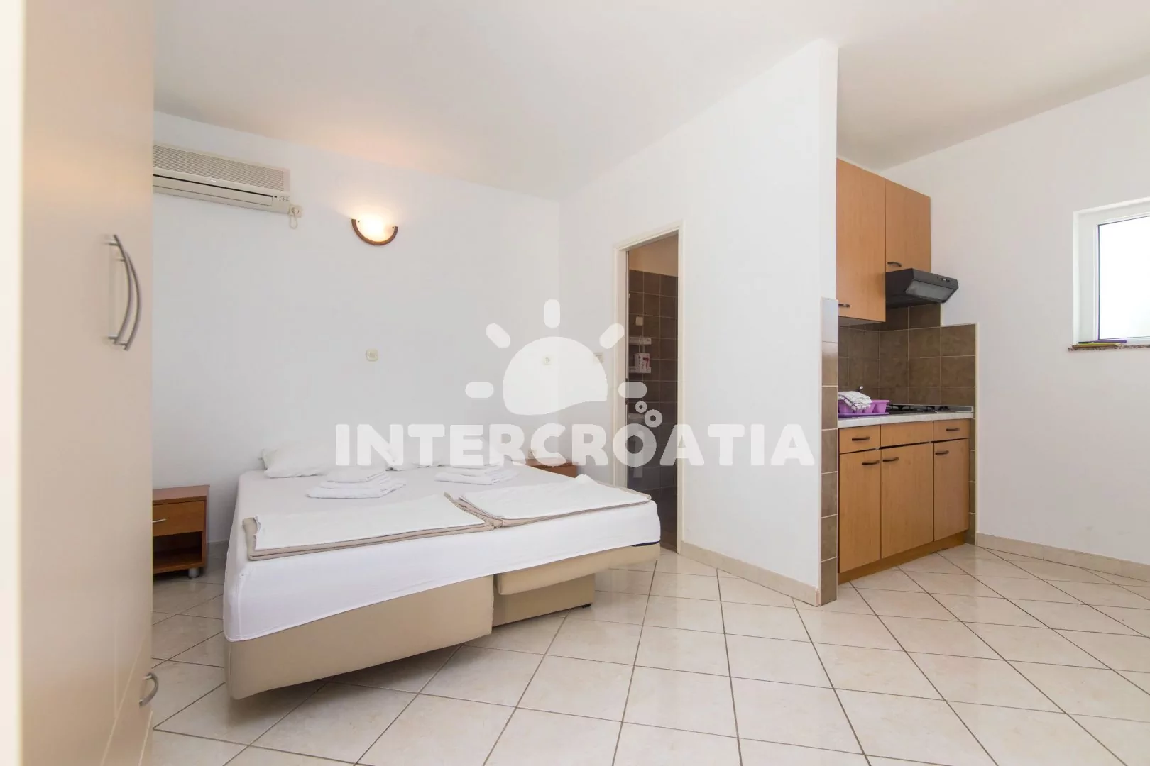 Apartmán (30 m2) typu studio s vlastní terasou, výhledem na moře a do zahrady se nachází v přízemí domu. Obývací místnost je spojena s kuchyní. Kuchyňská linka je vybavena dvouplotýnkovým vařičem, digestoří, rychlovarnou konvicí, nádobím a lednicí s mrazákem. Obývací místnost s jídelním stolem, televizí se satelitním programem, klimatizací, jedním dvoulůžkem a vstupem na terasu. Koupelna se sprchovým koutem, umyvadlem a wc. Hostům je k dispozici parkování u objektu zdarma.