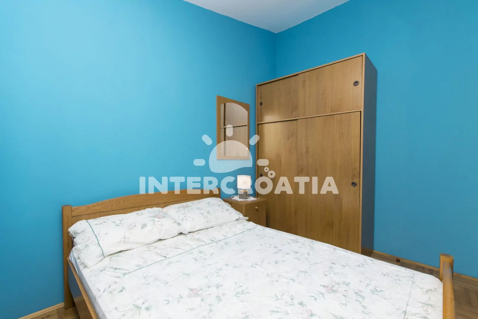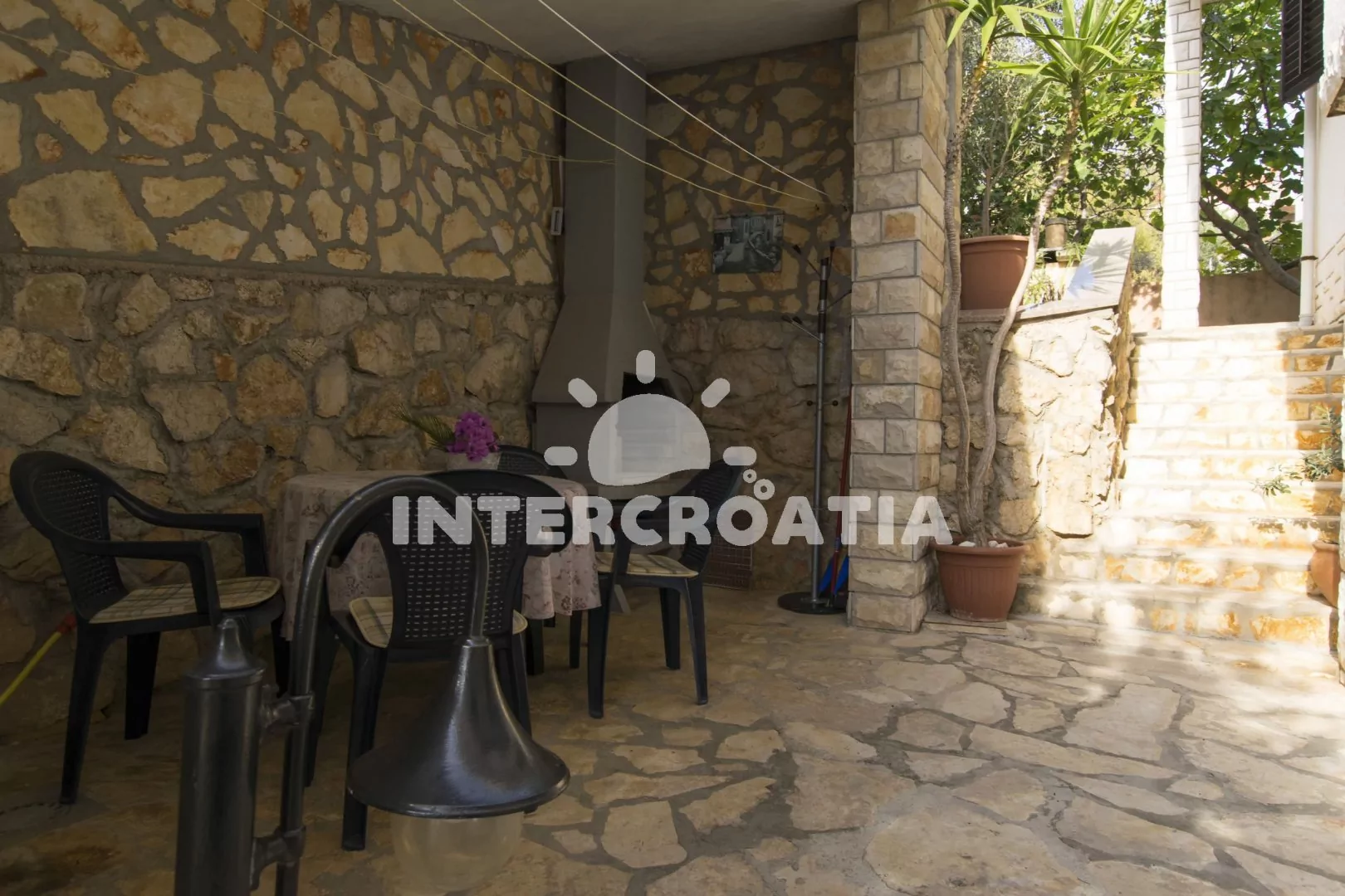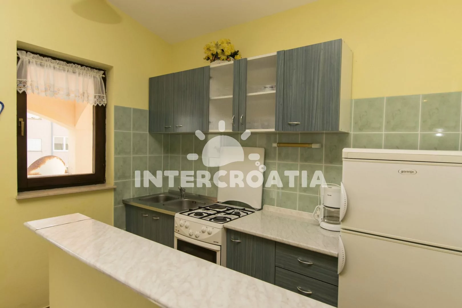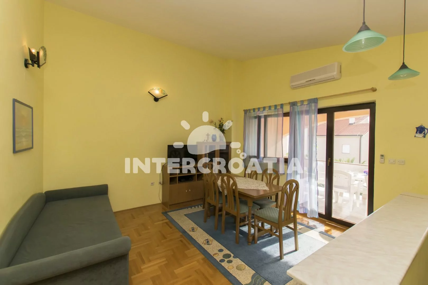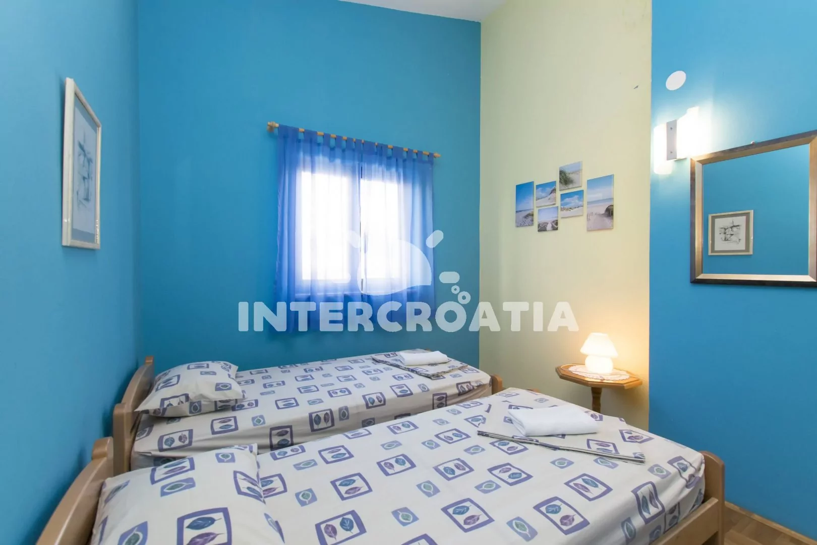 Apartmán (72 m2) s částečným výhledem na moře, vlastní terasou a posezením se nachází v 2. patře domu a je vhodný pro 4 až 5 osob. Obývací pokoj je spojený s kuchyní. Kuchyňská linka je vybavena sporákem s troubou, rychlovarnou konvicí, mikrovlnnou troubou, kávovarem, toustovačem, nádobím a lednicí s mrazákem. Obývací pokoj s jídelním stolem pro 6 osob, pohovkou (rozložitelná na extra lůžko pro 1 osobu), televizí se satelitním programem, DVD přehrávačem, klimatizací a vstupem na terasu. První ložnice s dvoulůžkem. Druhá ložnice s dvěma jednolůžky. Koupelna s vanou, sprchovou zástěnou, umyvadlem, fénem a wc. Hostům je k dispozici parkování u objektu zdarma.