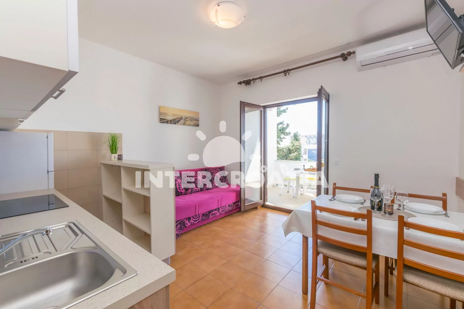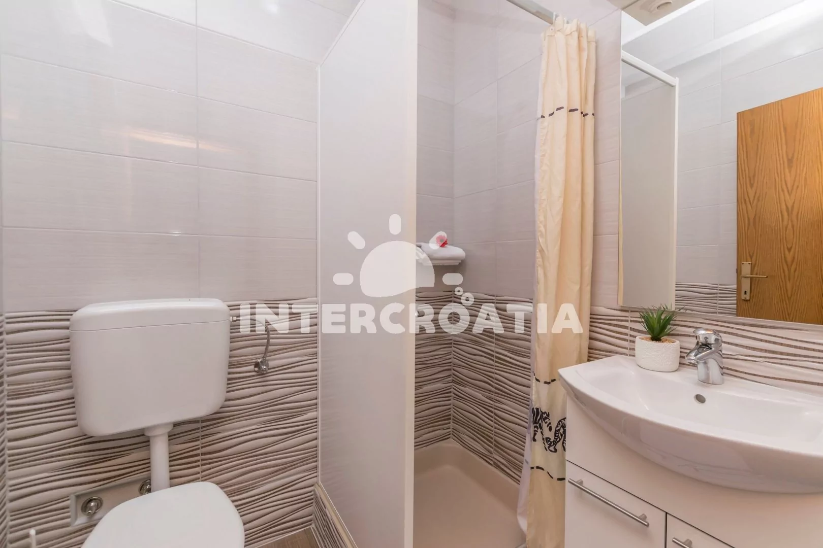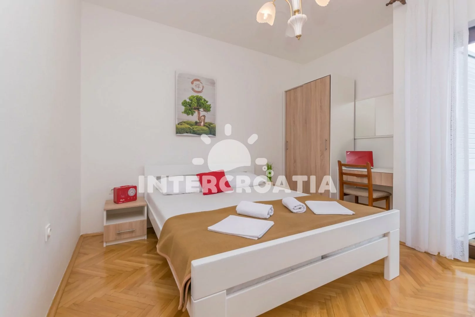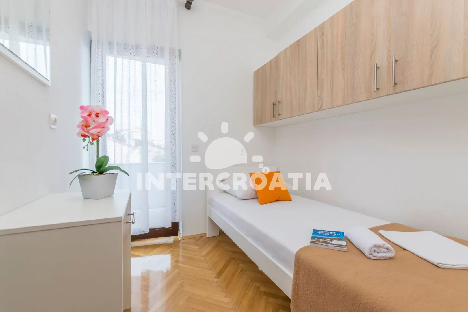 Apartmán (65 m2) s vlastní terasou, výhledem na moře a venkovním posezením se nachází ve 2. patře vily. Apartmán má 3 ložnice, 2 koupelny a je vhodný pro 5 až 7 osob. Obývací pokoj je spojený s kuchyní. Kuchyňská linka je vybavena sklokeramickou varnou deskou, digestoří, rychlovarnou konvicí, nádobím a lednicí s mrazákem. Obývací pokoj s jídelním stolem, pohovkou (rozložitelná na extra lůžko pro 2 osoby), televizí se satelitním programem, klimatizací a vstupem na terasu. První ložnice s dvoulůžkem. Druhá ložnice s dvoulůžkem. Třetí ložnice s jedním jednolůžkem. Dvě koupelny se sprchovým koutem, umyvadlem a wc. Hostům je k dispozici parkování u objektu zdarma.