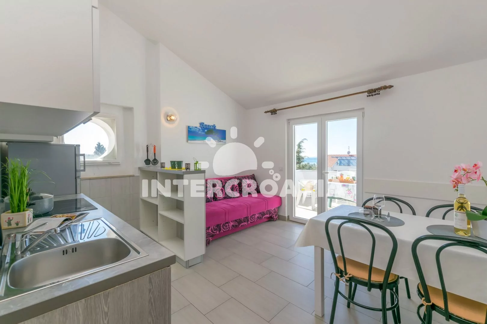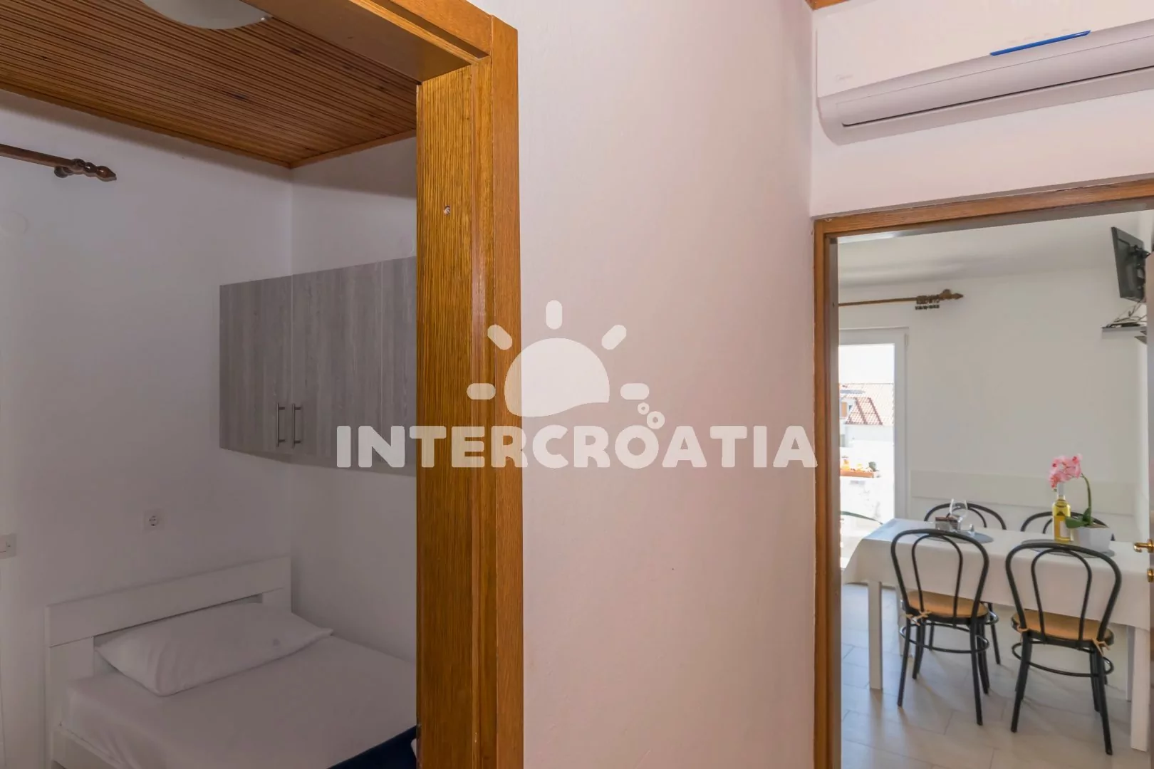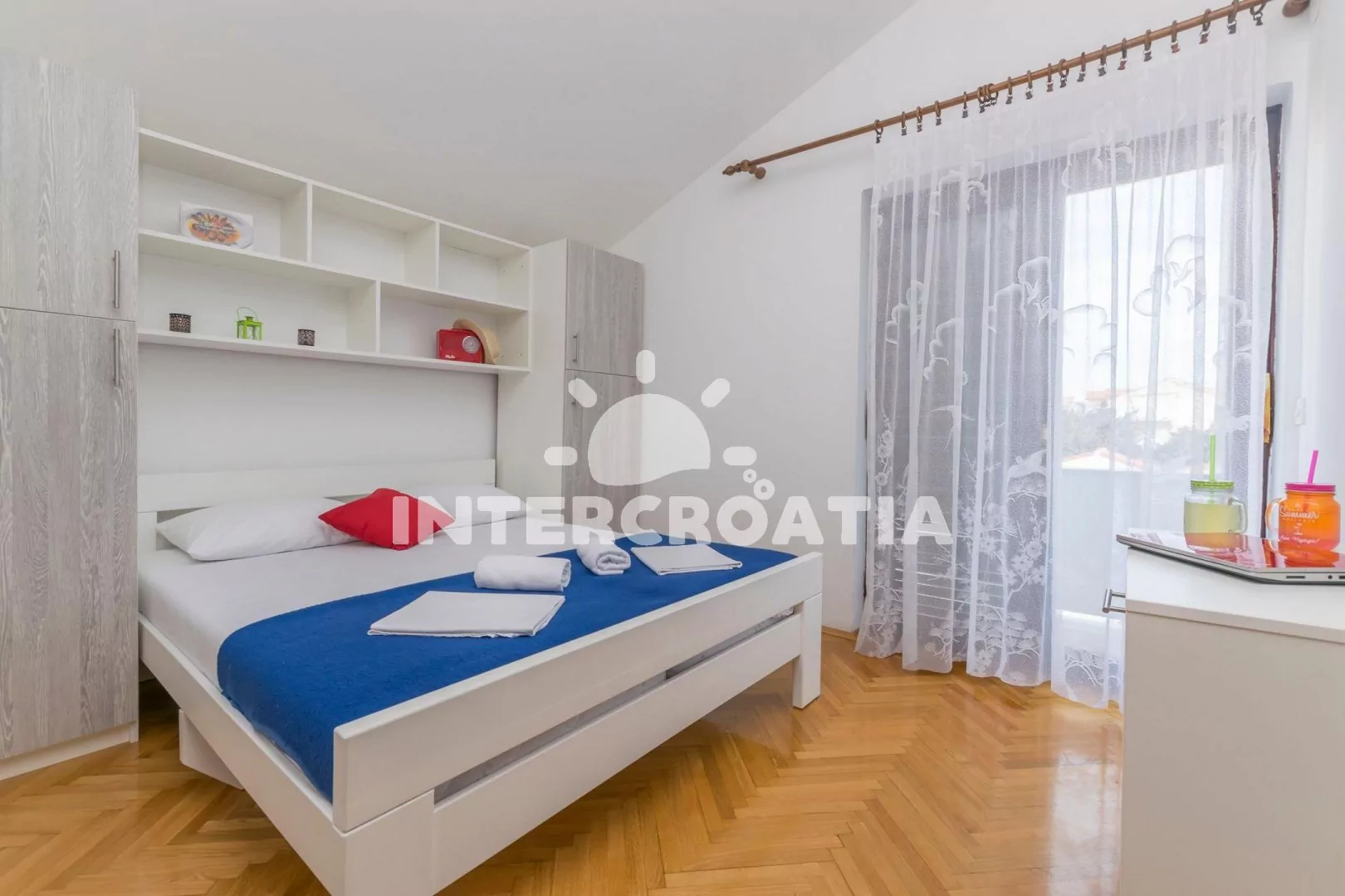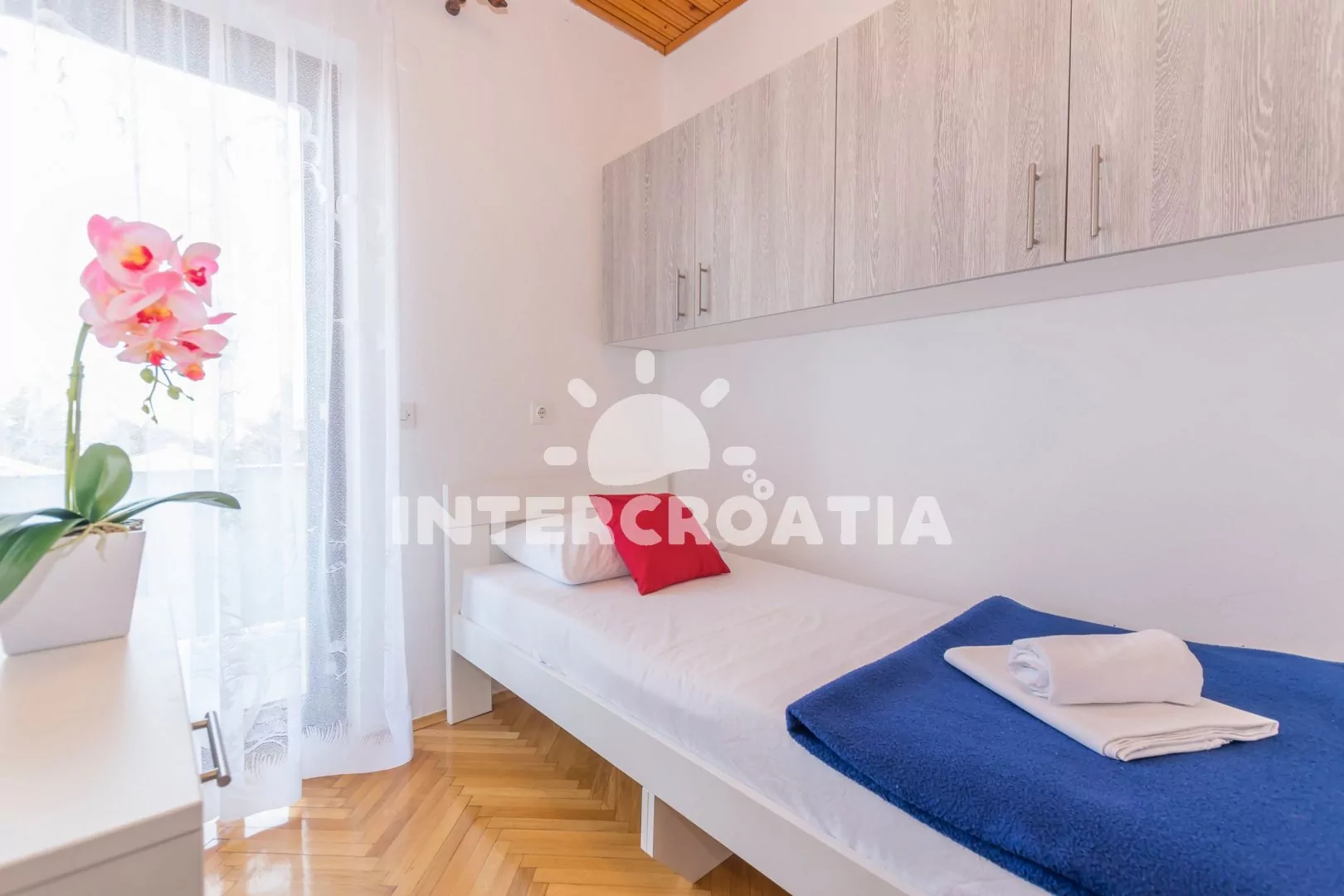 Apartmán (65 m2) s vlastní terasou, výhledem na moře a venkovním posezením se nachází ve 3. patře vily. Apartmán má 3 ložnice, 2 koupelny a je vhodný pro 5 až 7 osob. Obývací pokoj je spojený s kuchyní. Kuchyňská linka je vybavena sklokeramickou varnou deskou, digestoří, rychlovarnou konvicí, nádobím a lednicí s mrazákem. Obývací pokoj s jídelním stolem, pohovkou (rozložitelná na extra lůžko pro 2 osoby), televizí se satelitním programem, klimatizací a vstupem na terasu. První ložnice s dvoulůžkem. Druhá ložnice s dvoulůžkem. Třetí ložnice s jedním jednolůžkem. Dvě koupelny se sprchovým koutem, umyvadlem a wc. Hostům je k dispozici parkování u objektu zdarma.