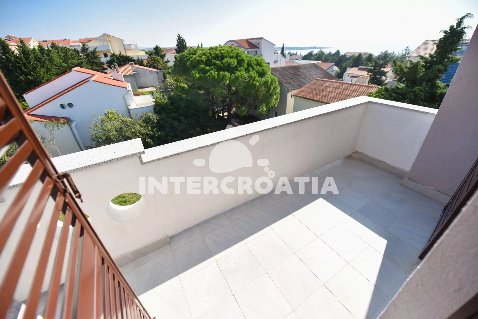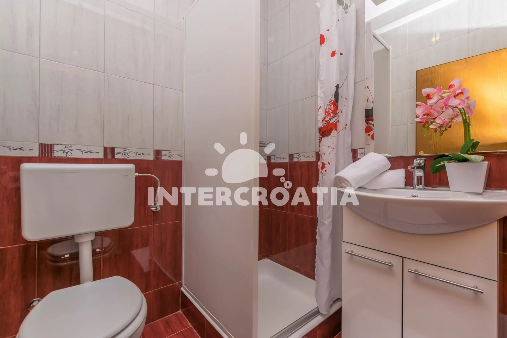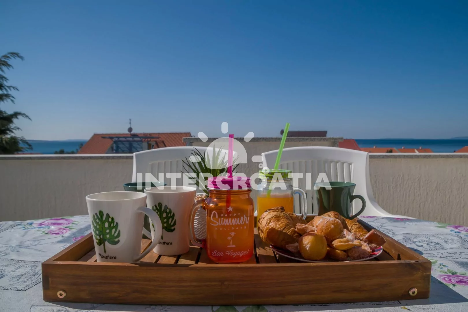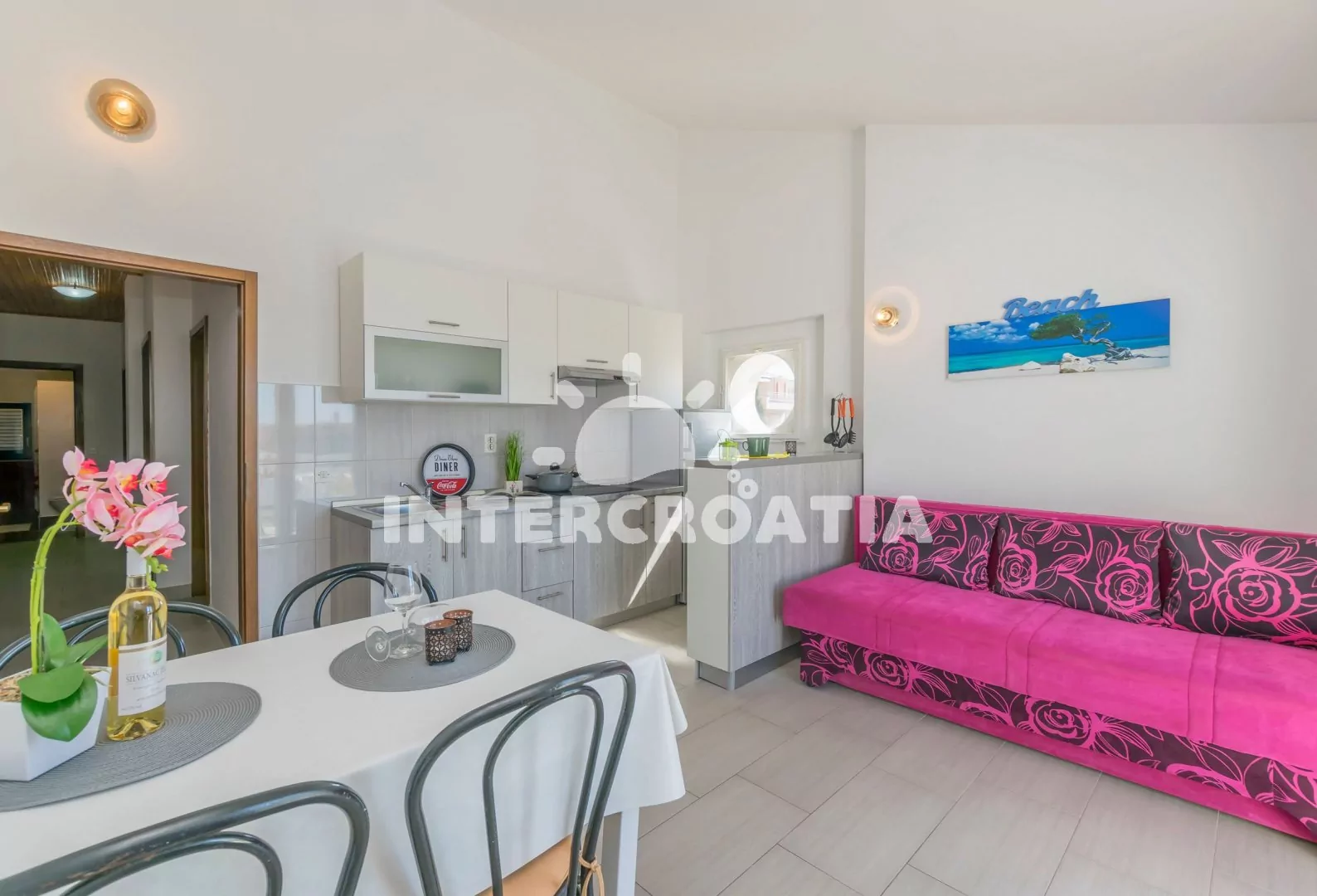 Apartmán (65 m2) s vlastní terasou, výhledem na moře a venkovním posezením se nachází ve 3. patře vily. Apartmán má 3 ložnice, 2 koupelny a je vhodný pro 5 až 7 osob. Obývací pokoj je spojený s kuchyní. Kuchyňská linka je vybavena sklokeramickou varnou deskou, digestoří, rychlovarnou konvicí, nádobím a lednicí s mrazákem. Obývací pokoj s jídelním stolem, pohovkou (rozložitelná na extra lůžko pro 2 osoby), televizí se satelitním programem, klimatizací a vstupem na terasu. První ložnice s dvoulůžkem. Druhá ložnice s dvoulůžkem. Třetí ložnice s jedním jednolůžkem. Dvě koupelny se sprchovým koutem, umyvadlem a wc. Hostům je k dispozici parkování u objektu zdarma.