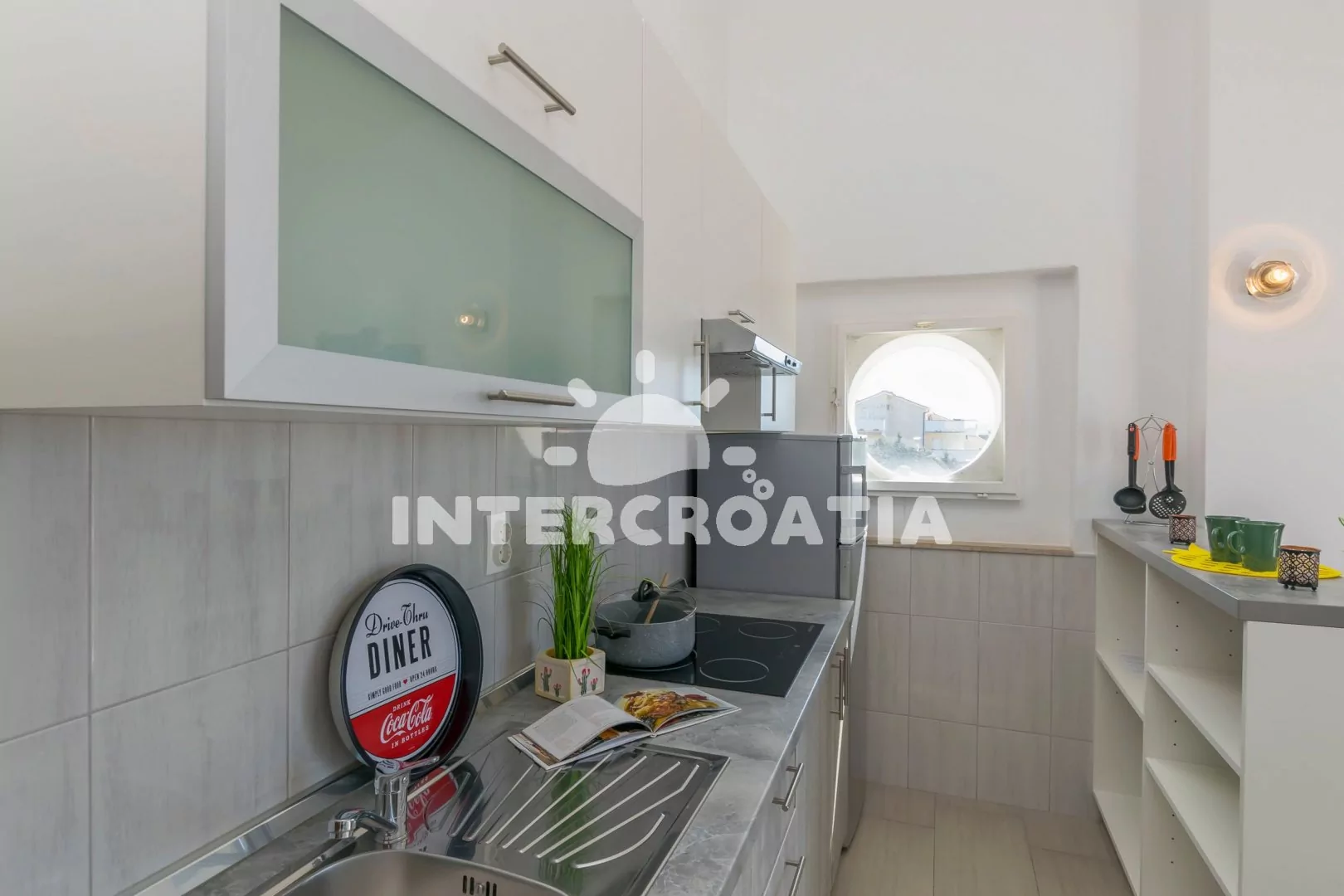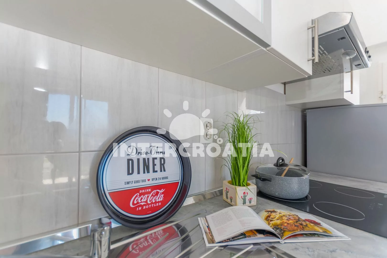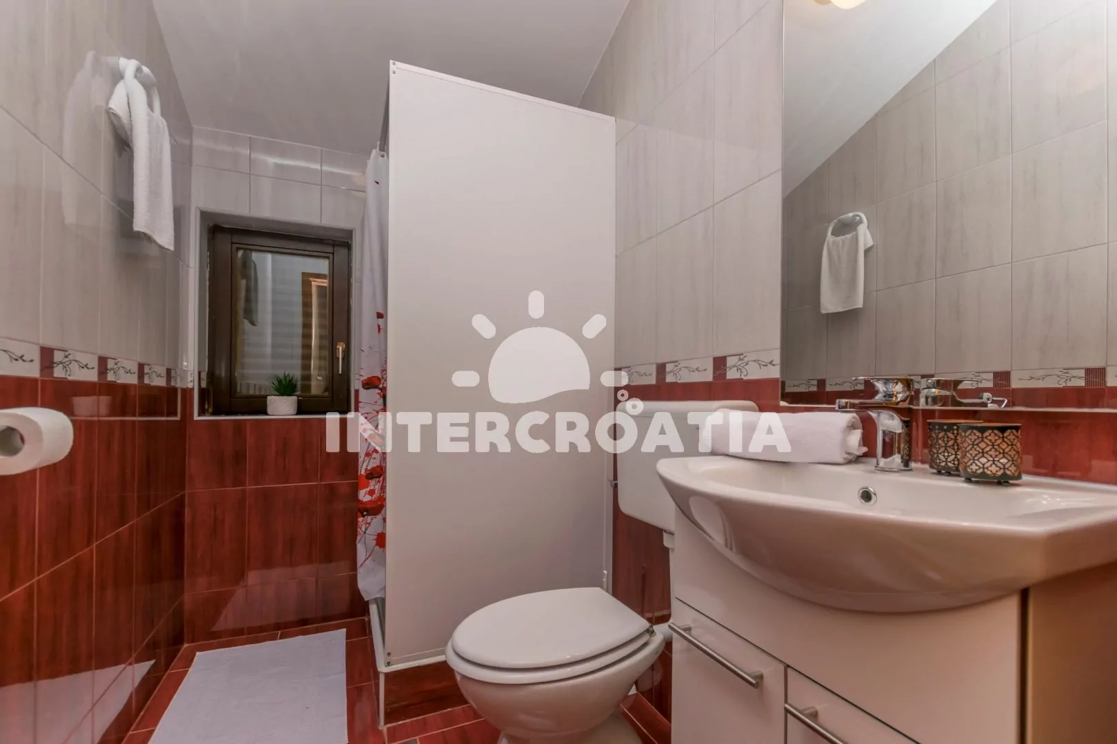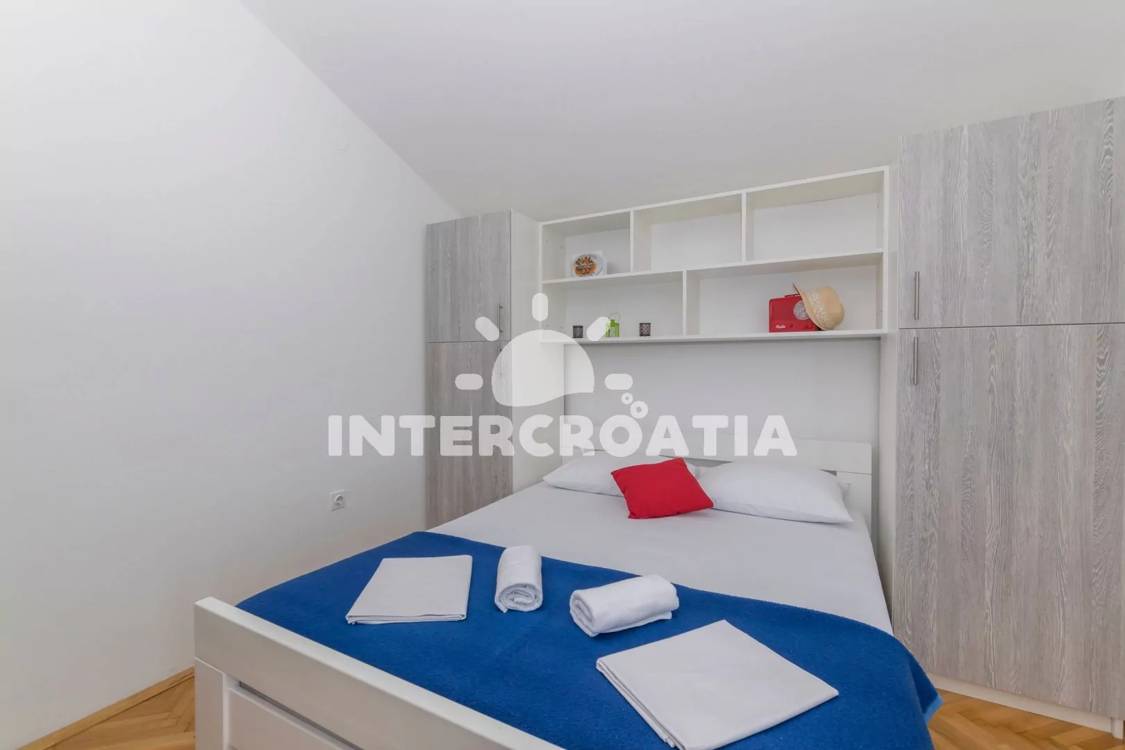 Apartmán (65 m2) s vlastní terasou, výhledem na moře a venkovním posezením se nachází ve 3. patře vily. Apartmán má 3 ložnice, 2 koupelny a je vhodný pro 5 až 7 osob. Obývací pokoj je spojený s kuchyní. Kuchyňská linka je vybavena sklokeramickou varnou deskou, digestoří, rychlovarnou konvicí, nádobím a lednicí s mrazákem. Obývací pokoj s jídelním stolem, pohovkou (rozložitelná na extra lůžko pro 2 osoby), televizí se satelitním programem, klimatizací a vstupem na terasu. První ložnice s dvoulůžkem. Druhá ložnice s dvoulůžkem. Třetí ložnice s jedním jednolůžkem. Dvě koupelny se sprchovým koutem, umyvadlem a wc. Hostům je k dispozici parkování u objektu zdarma.