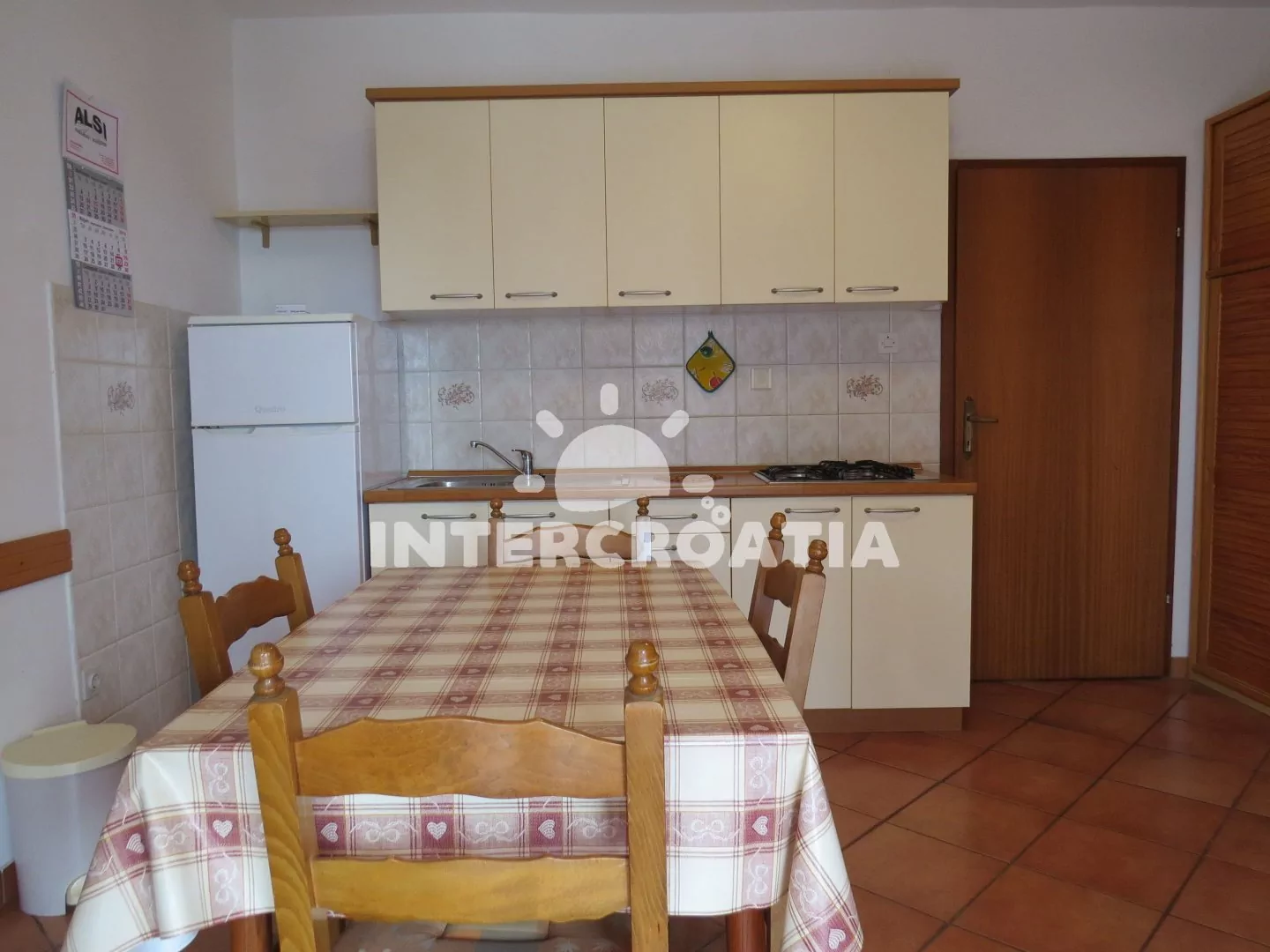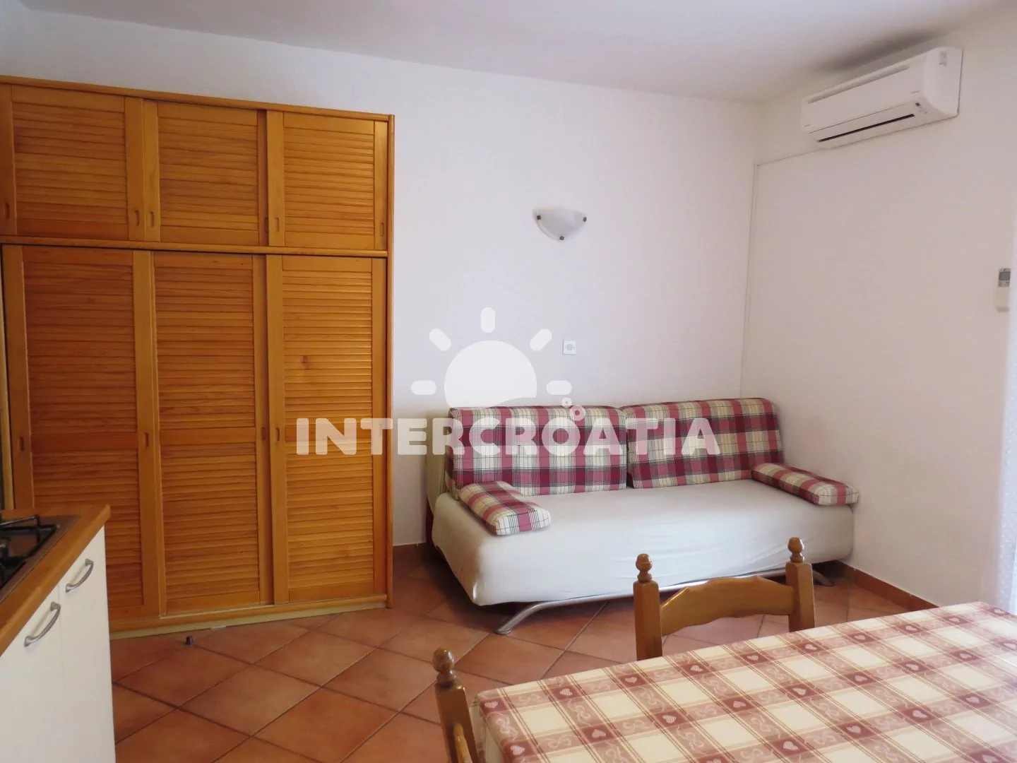 Apartmán (48 m2) s terasou a venkovním posezením se nachází ve 2. patře domu. Apartmán má 1 ložnici a je vhodný pro 2 až 4 osoby. Obývací pokoj je spojený s kuchyní. Kuchyňská linka je vybavena varnou deskou, nádobím a lednicí s mrazákem. Obývací pokoj s jídelním stolem, pohovkou (rozložitelná na extra lůžko pro 2 osoby), televizí, klimatizací a vstupem na terasu. Ložnice s jedním dvoulůžkem. Koupelna se sprchovým koutem, umyvadlem a wc. Hostům je k dispozici parkování u objektu zdarma.