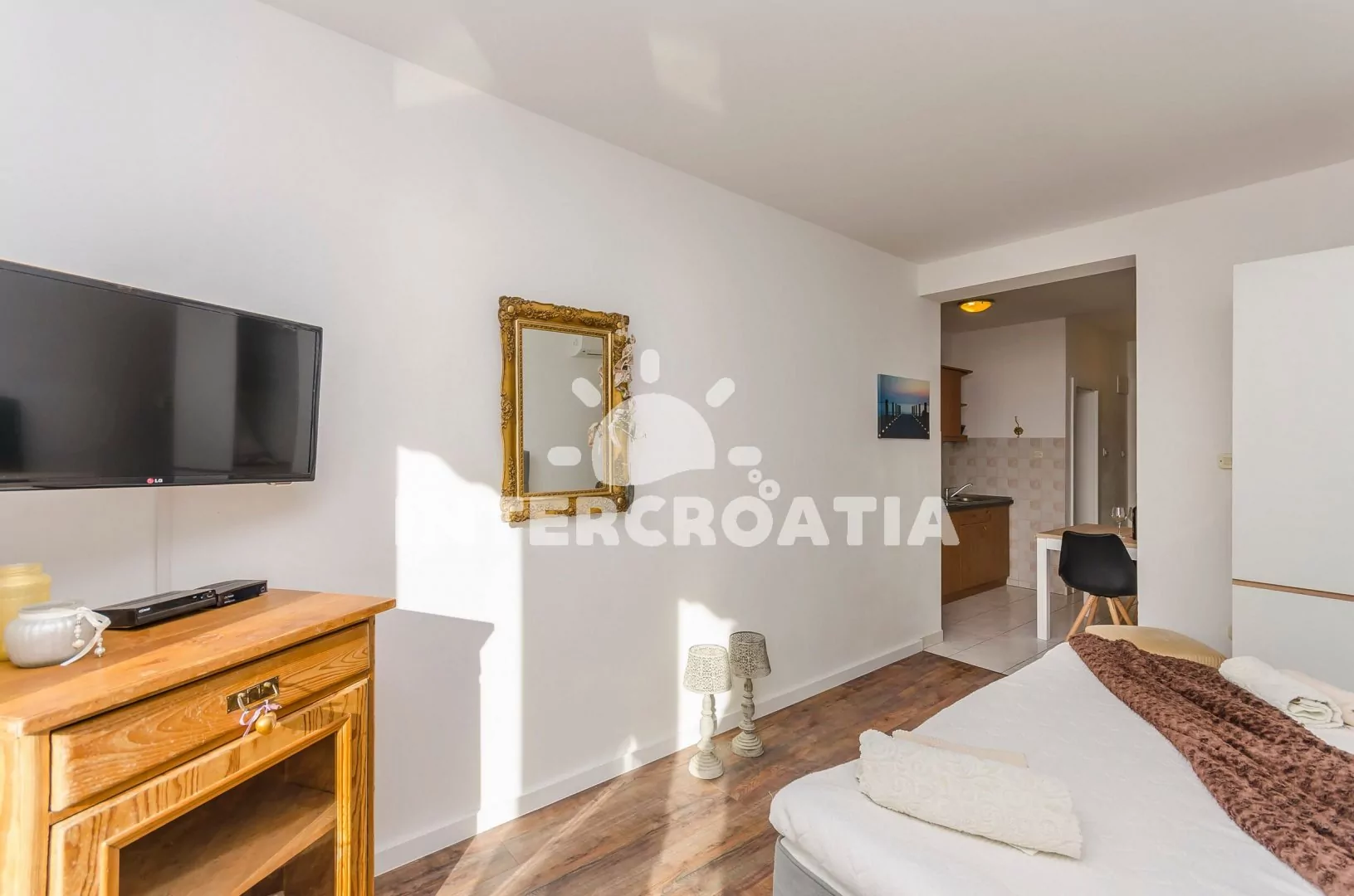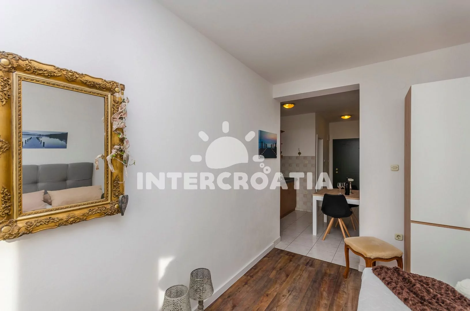 Apartmán typu studio (35 m2) s terasou, venkovním posezením a výhledem na moře se nachází v 1. patře vily. Apartmán má 1 ložnici a je vhodný pro 2 osoby. Kuchyňský kout s jídelním stolem a kuchyňskou linkou. Kuchyňská linka je vybavena varnou deskou, rychlovarnou konvicí, kávovarem, nádobím a lednicí s mrazákem. Ložnice s dvoulůžkem, televizí se satelitním programem, klimatizací a vstupem na terasu. Koupelna se sprchovým koutem, umyvadlem a wc. Hostům je k dispozici parkování u objektu zdarma.