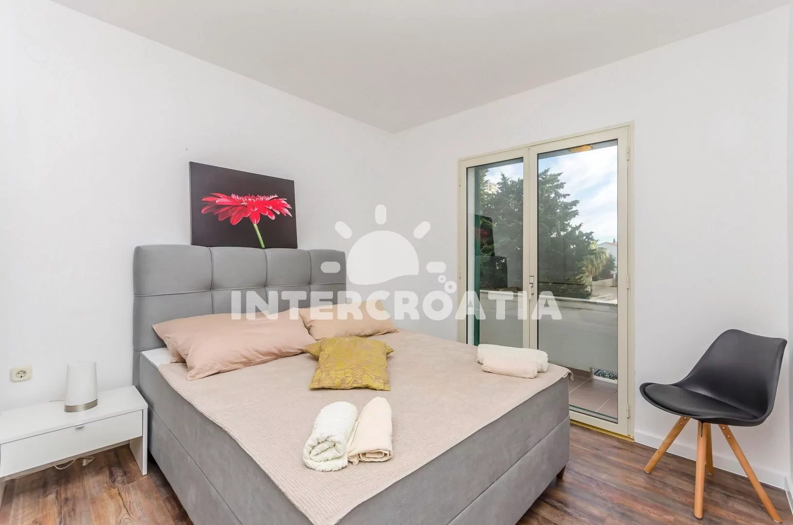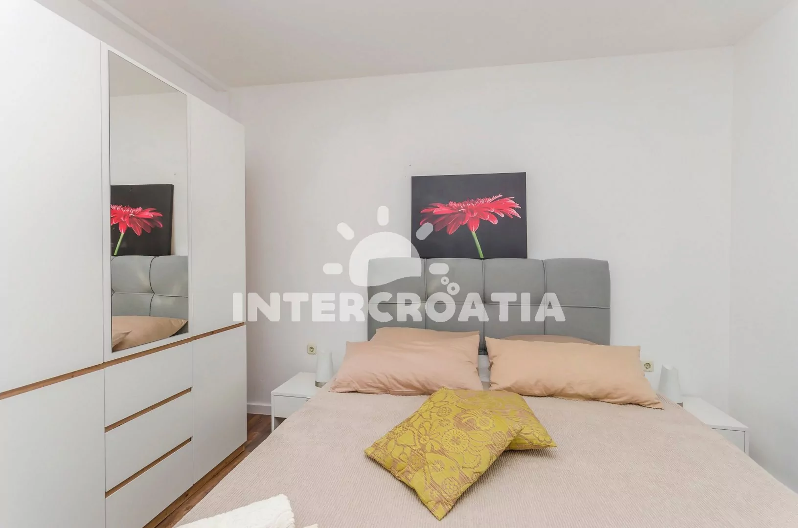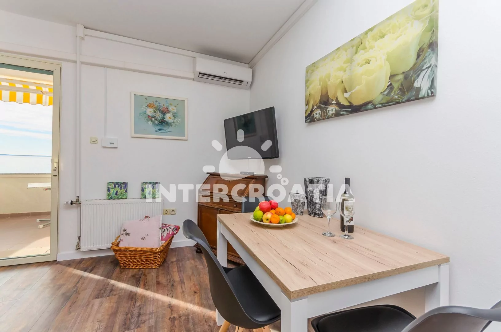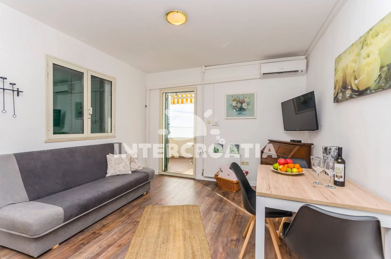 Apartmán (40 m2) s balkonem, venkovním posezením a výhledem na moře se nachází v 1. patře vily. Apartmán má 1 ložnici a je vhodný pro 2 až 4 osoby. Obývací pokoj je spojený s kuchyní. Kuchyňská linka je vybavena dvouplotýnkovým vařičem, digestoří, rychlovarnou konvicí, kávovarem, nádobím a lednicí s mrazákem. Obývací pokoj s jídelním stolem, pohovkou (rozložitelná na extra lůžko pro 2 osoby), televizí se satelitním programem, klimatizací a vstupem na balkon. Ložnice s dvoulůžkem a vstupem na balkon. Koupelna se sprchovým koutem, umyvadlem a wc. Hostům je k dispozici parkování u objektu zdarma.